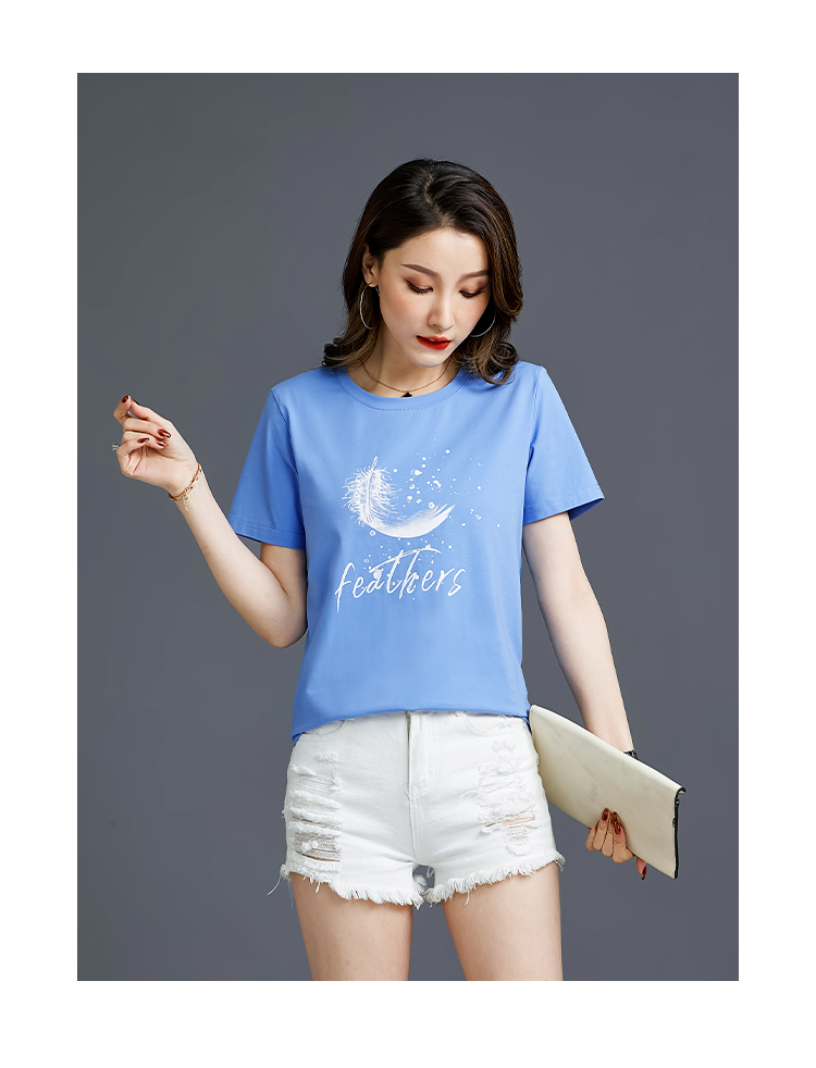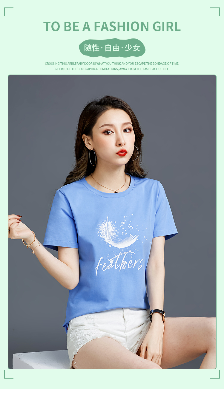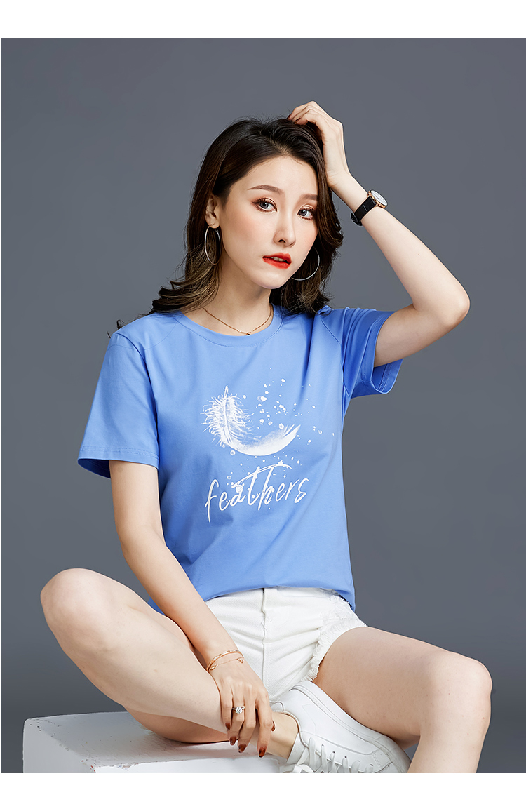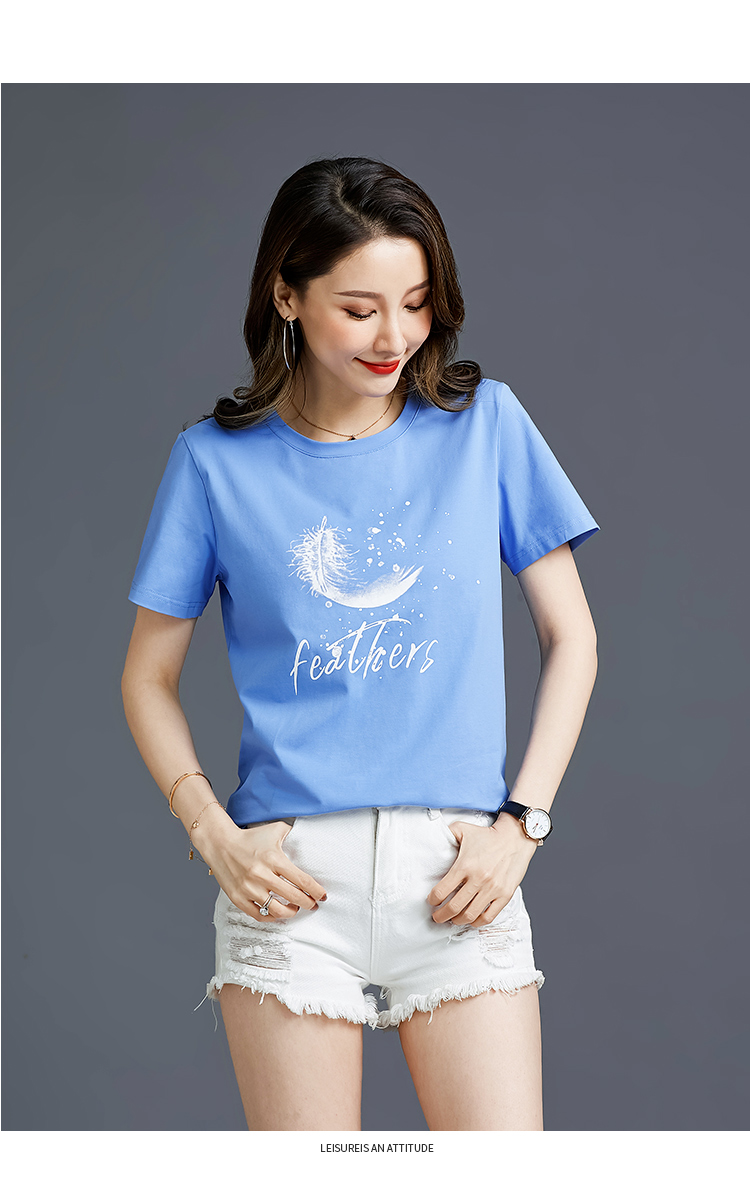 常规短袖2021夏新款T恤女羽毛简约纯棉韩版百搭宽松多色直播爆款