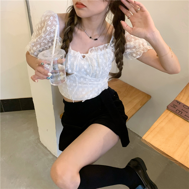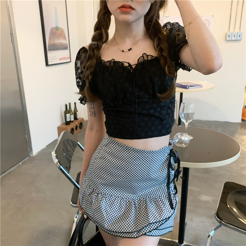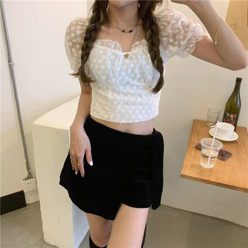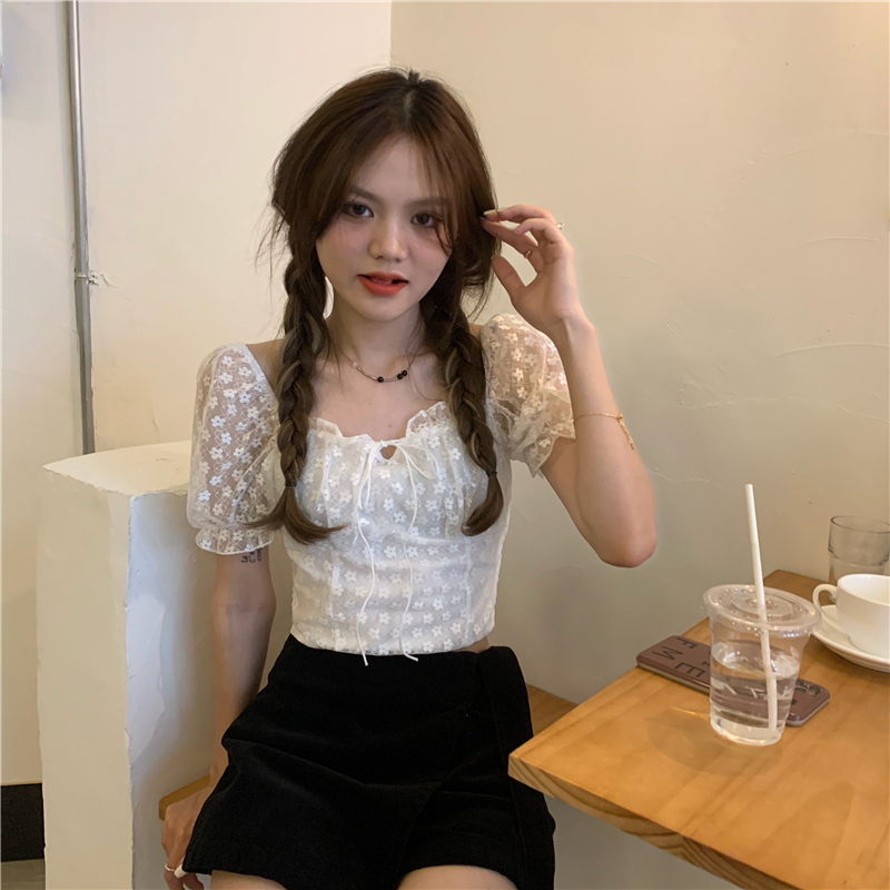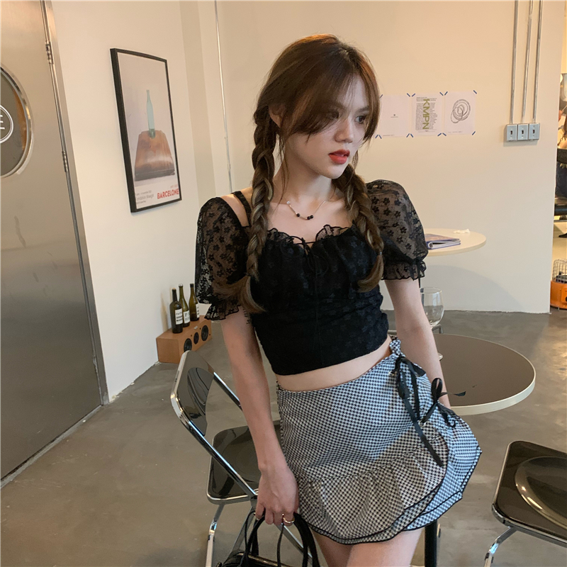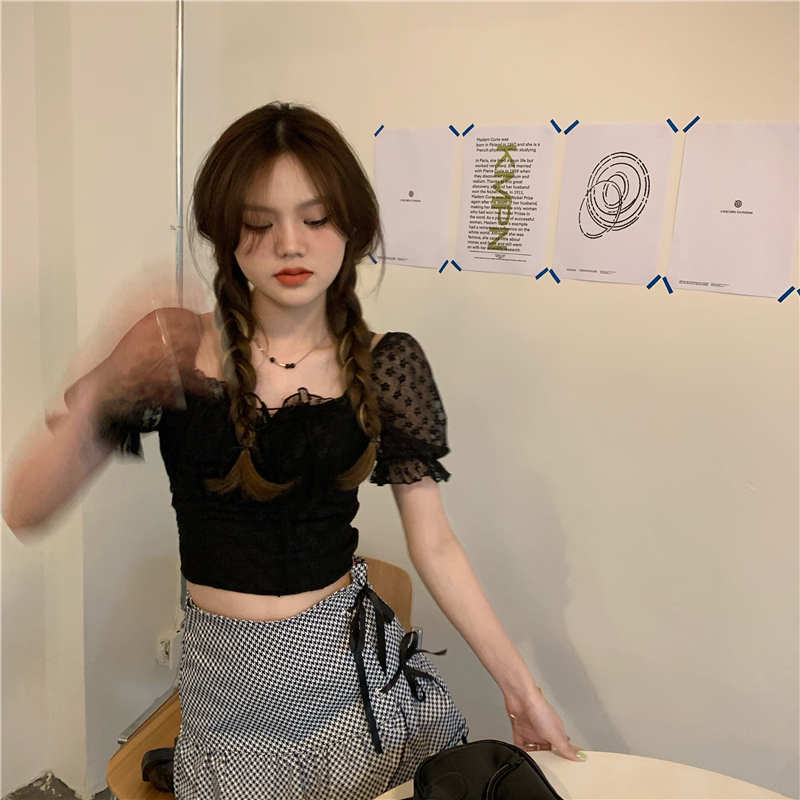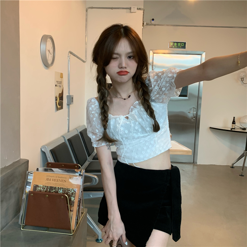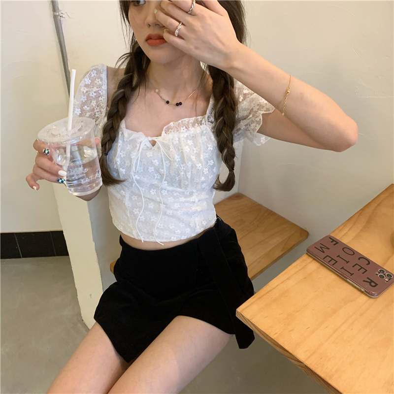 实拍实价 少女小心机款褶皱蕾丝小衫短款上衣