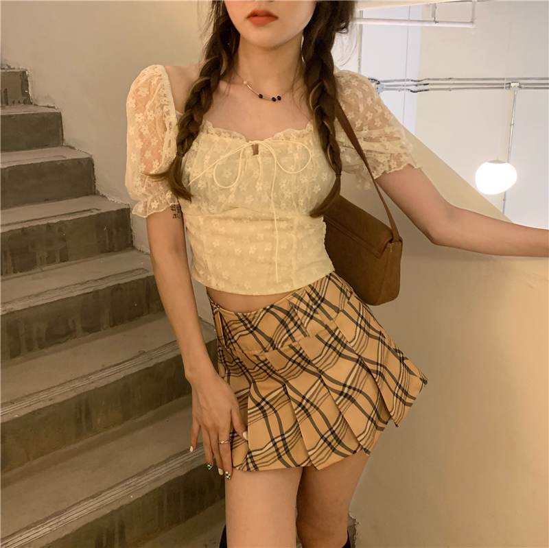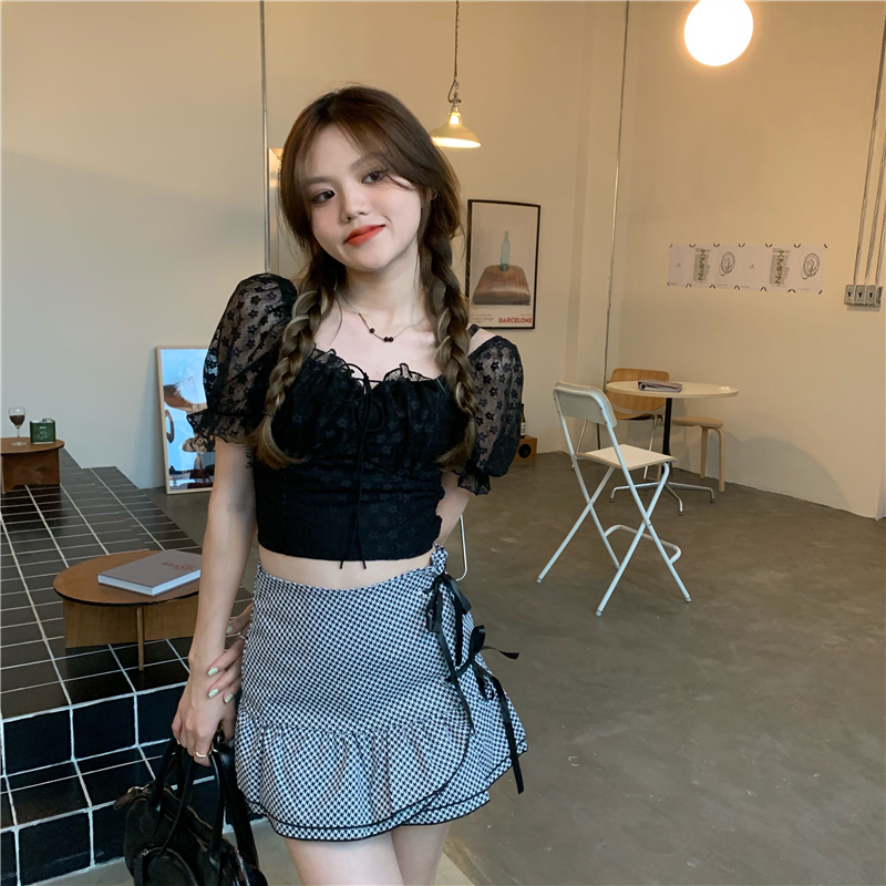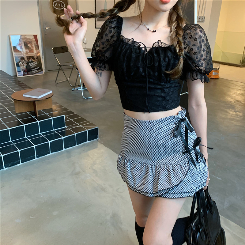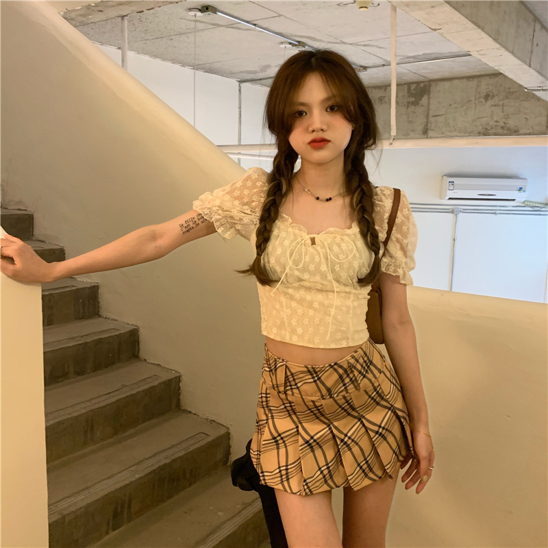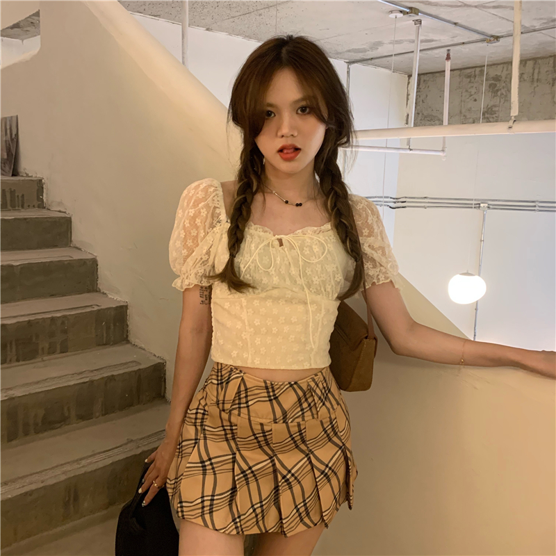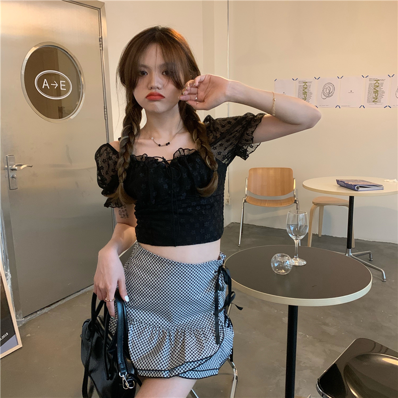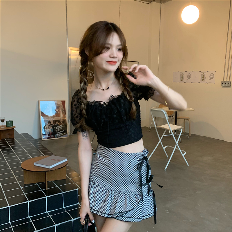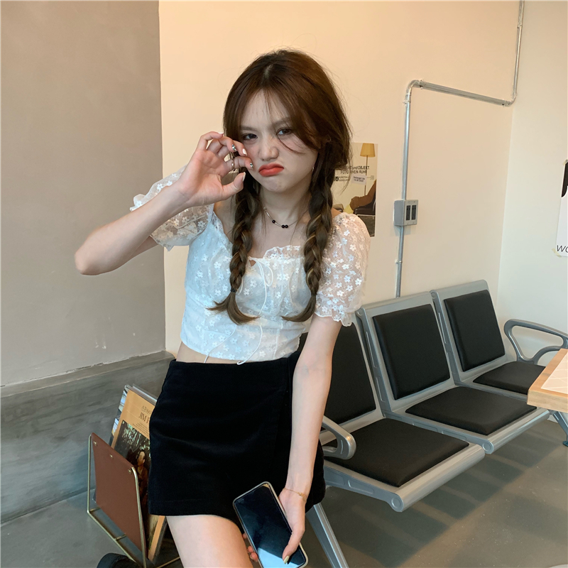 实拍实价 少女小心机款褶皱蕾丝小衫短款上衣