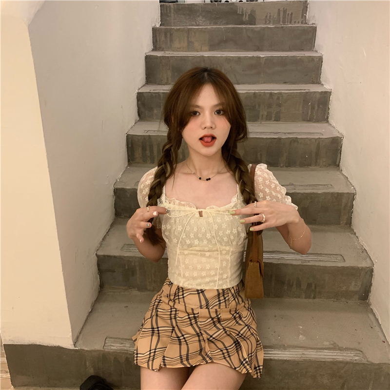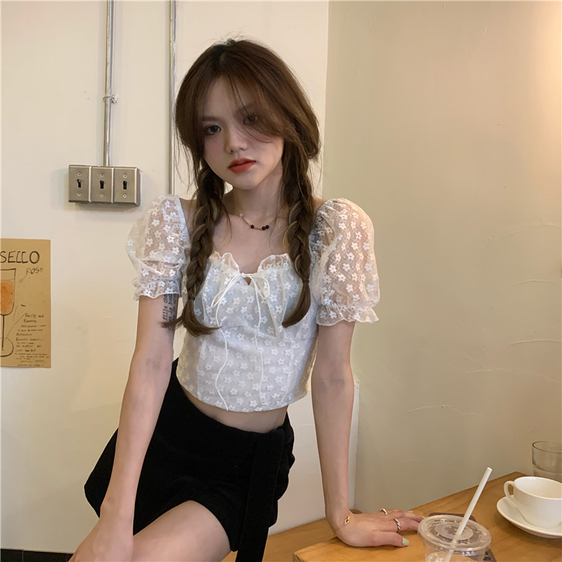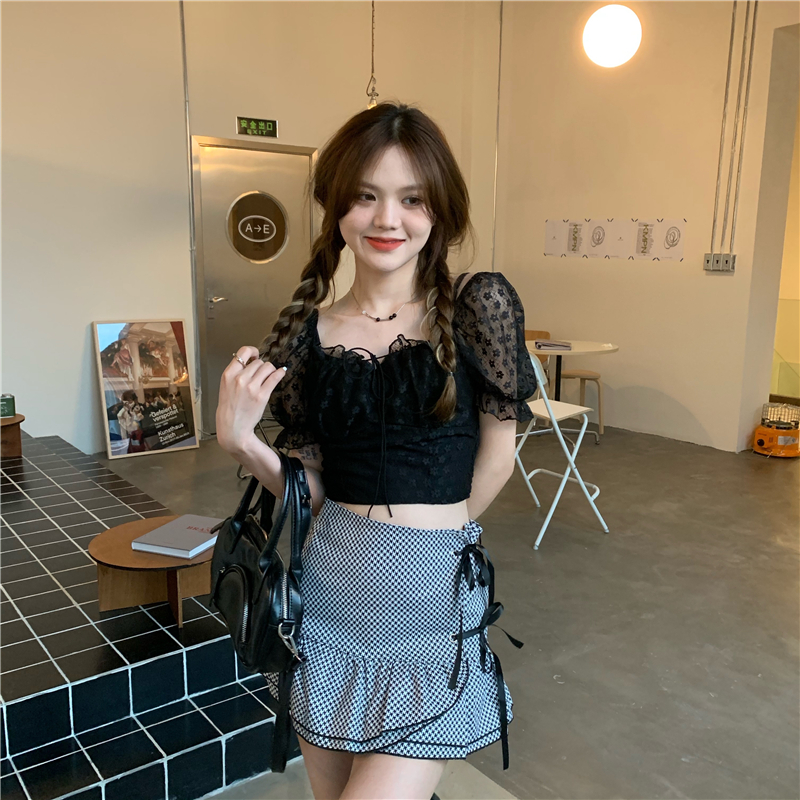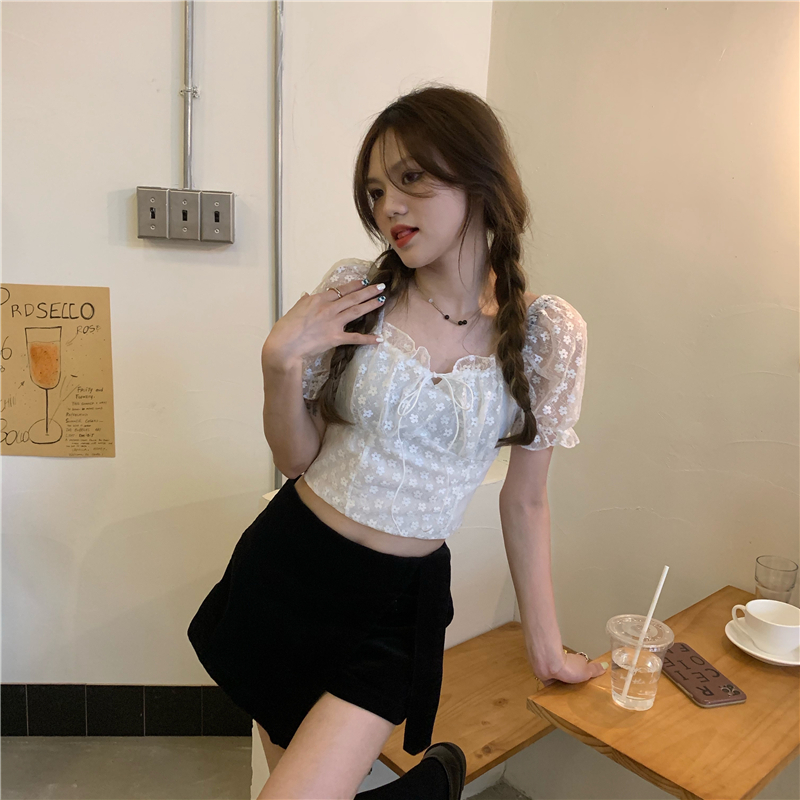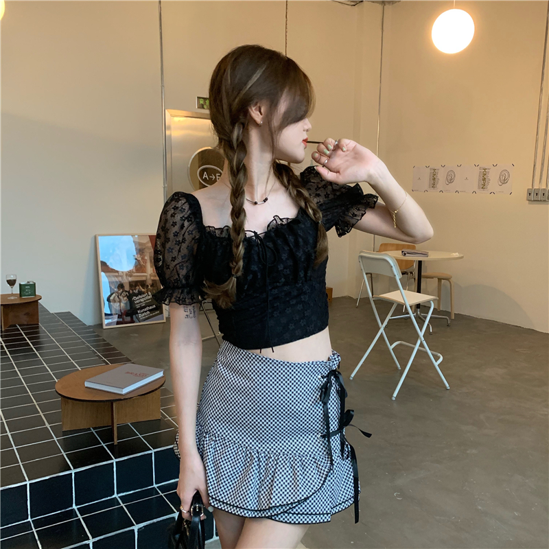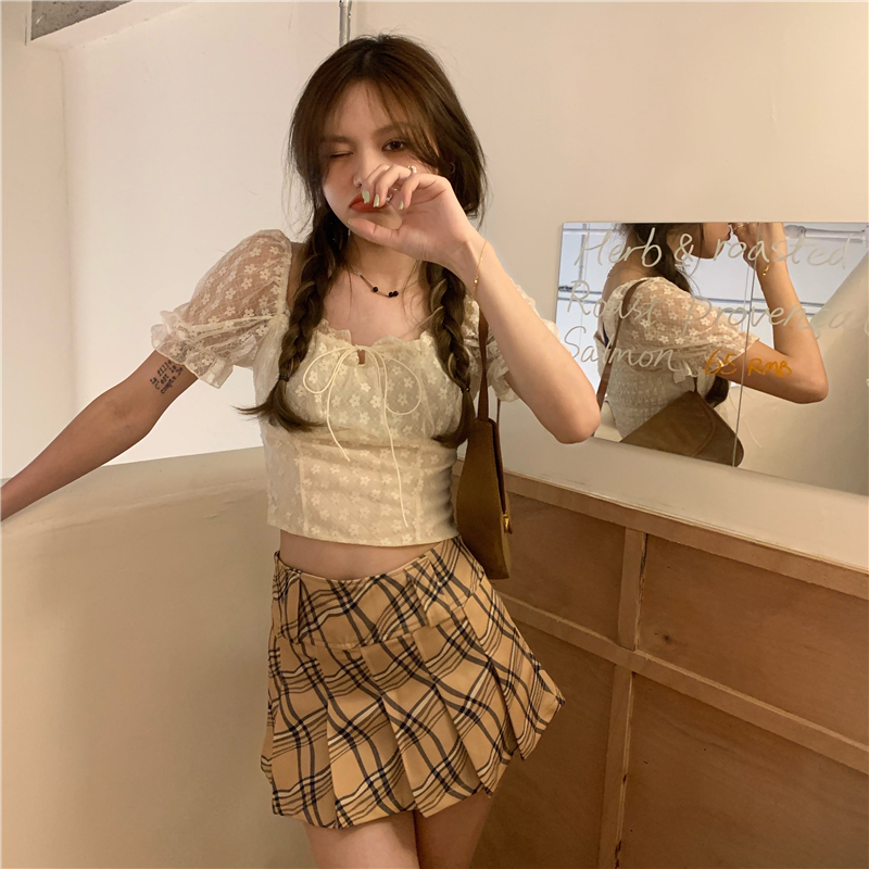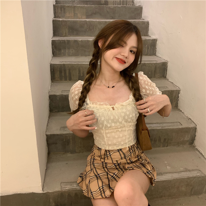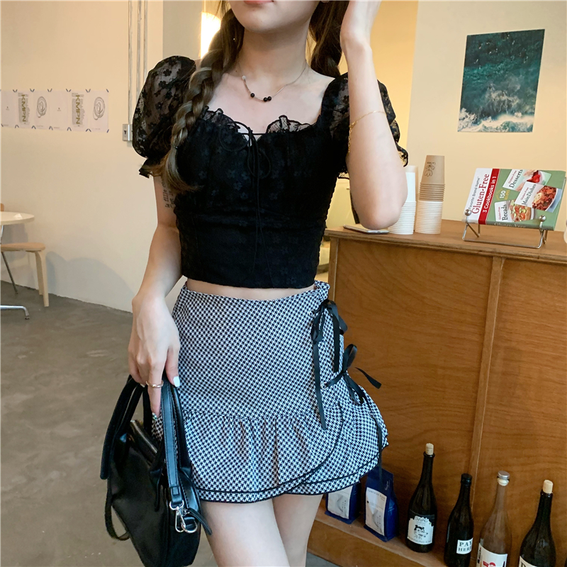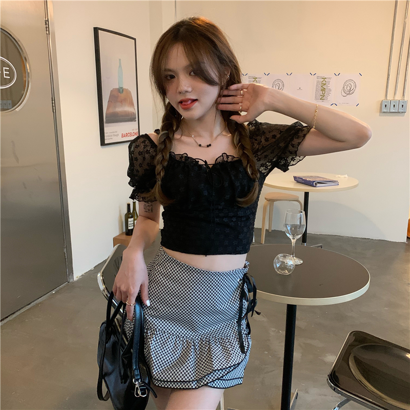 实拍实价 少女小心机款褶皱蕾丝小衫短款上衣