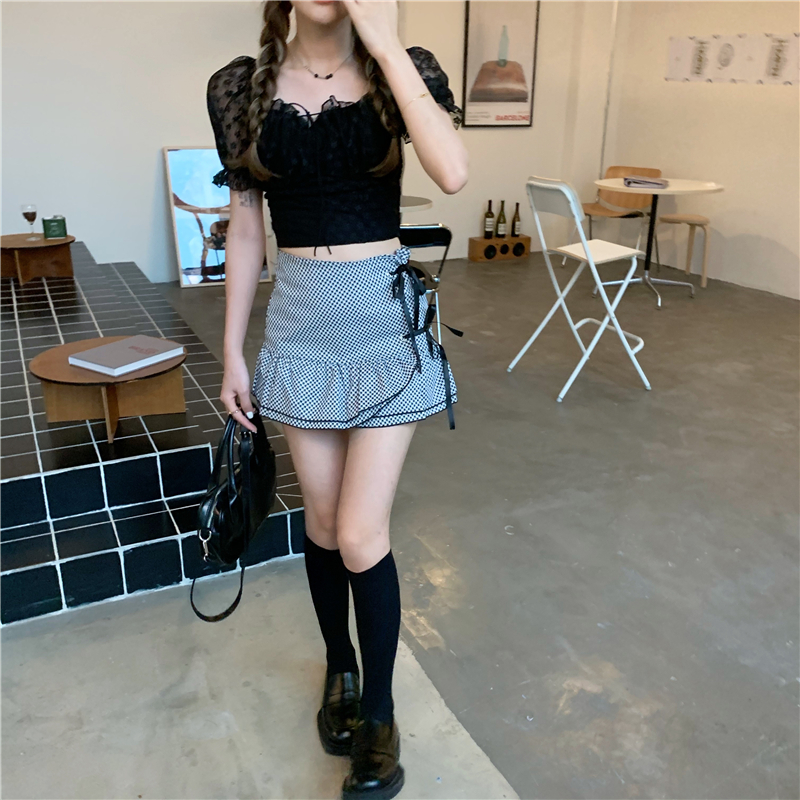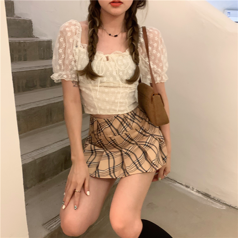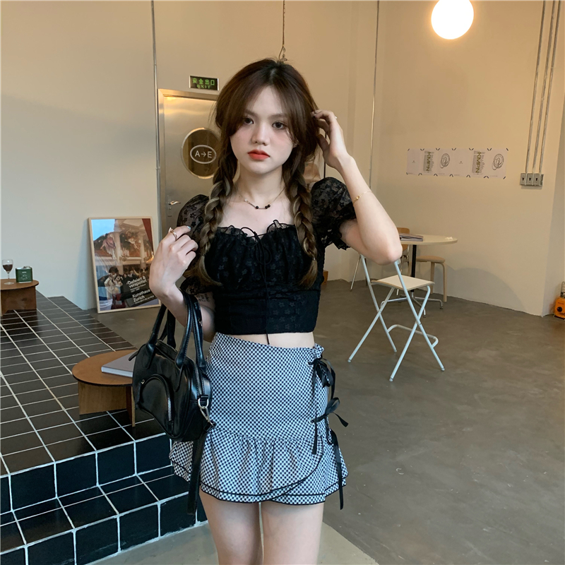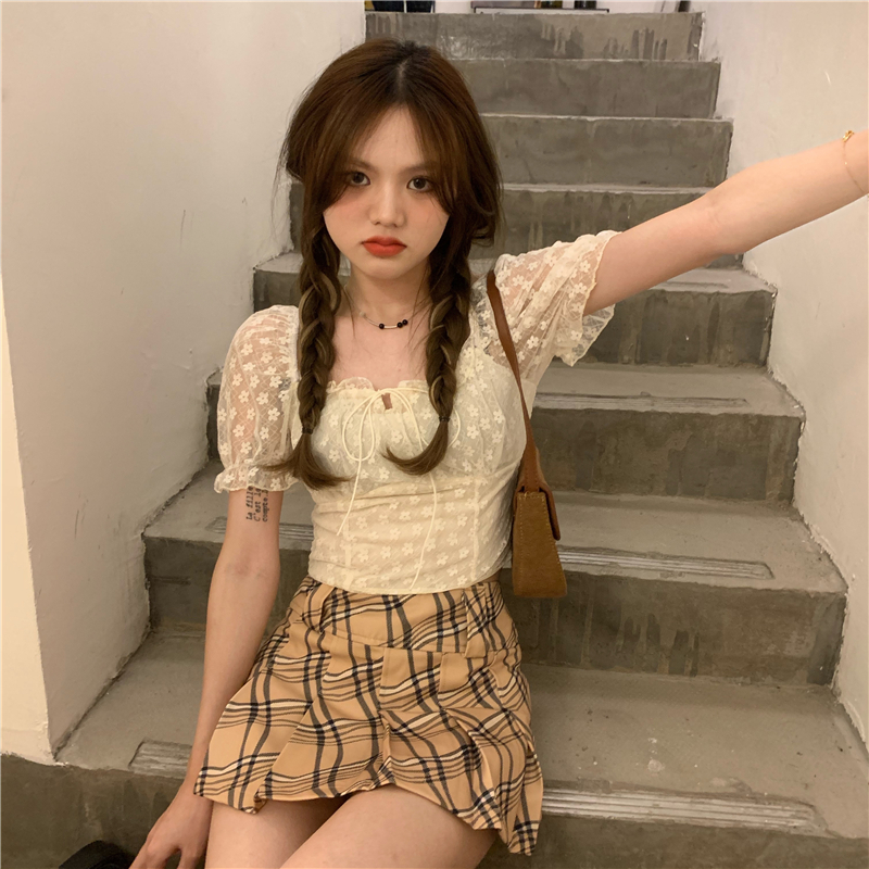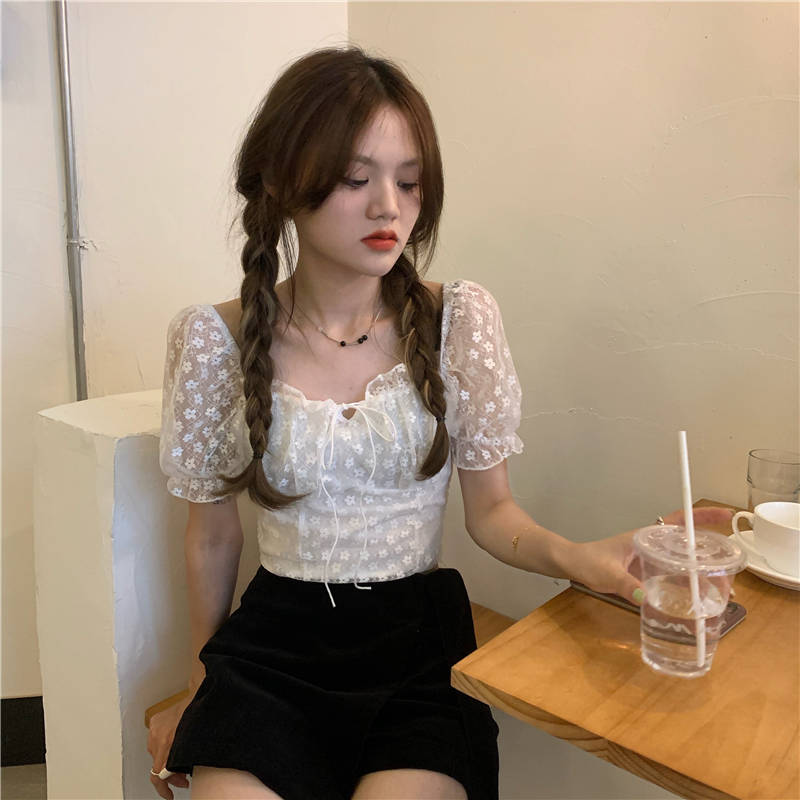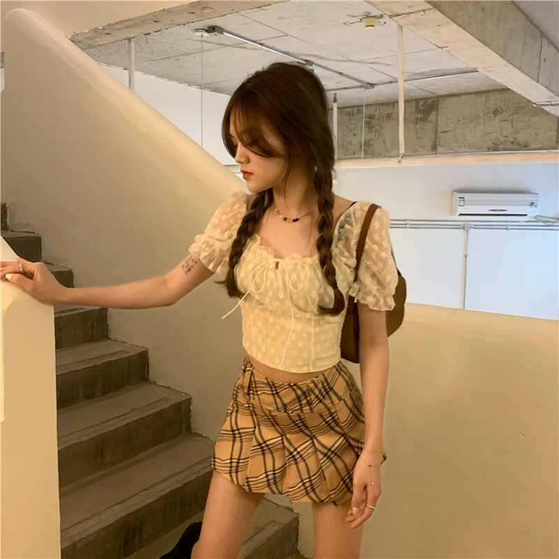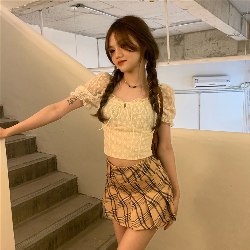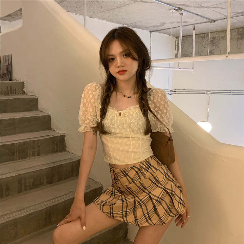 实拍实价 少女小心机款褶皱蕾丝小衫短款上衣