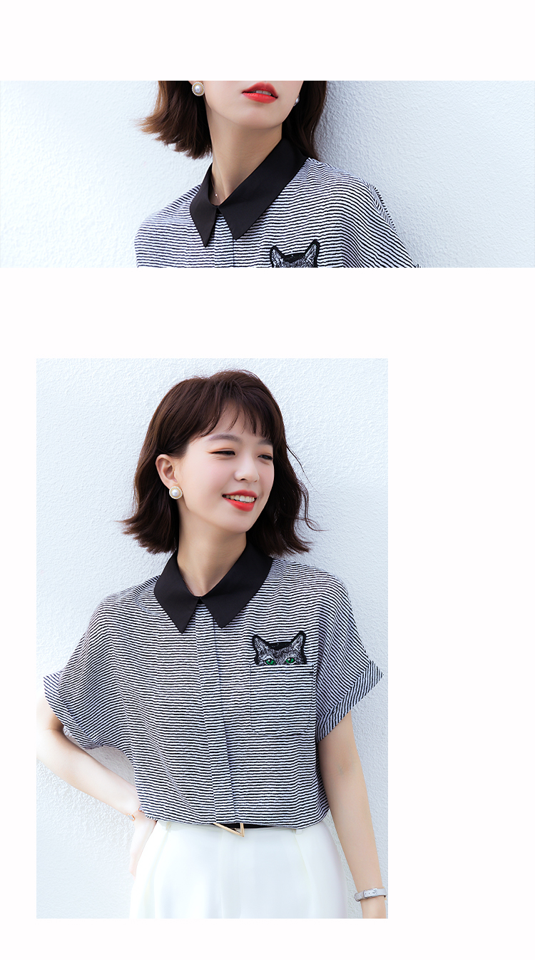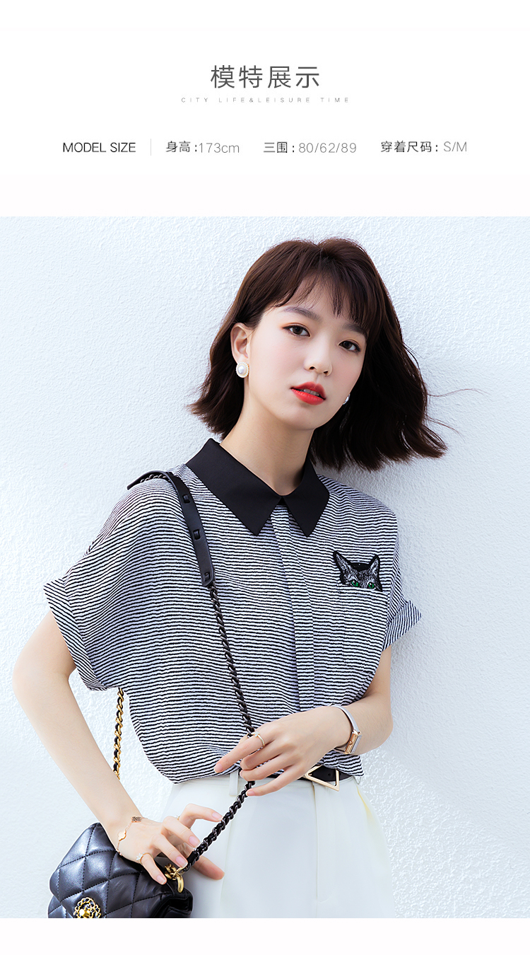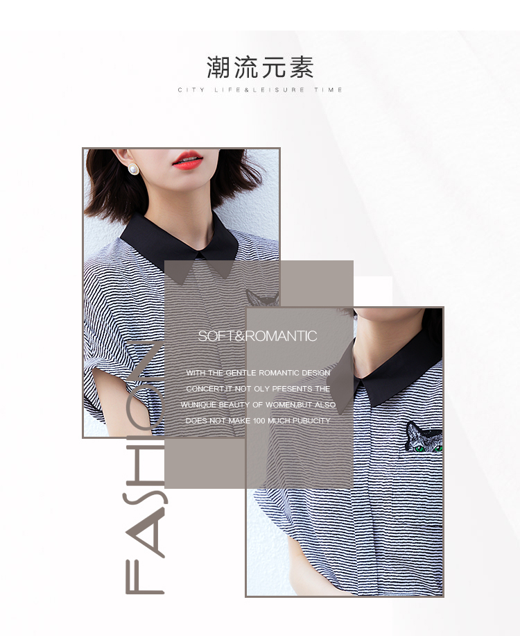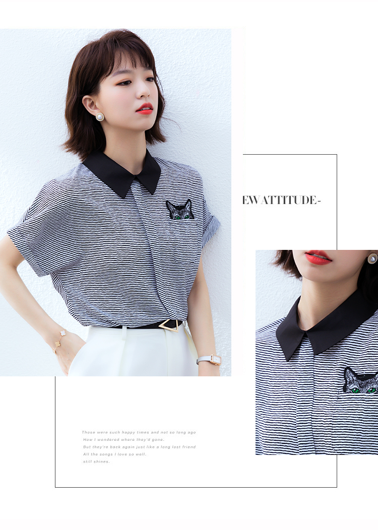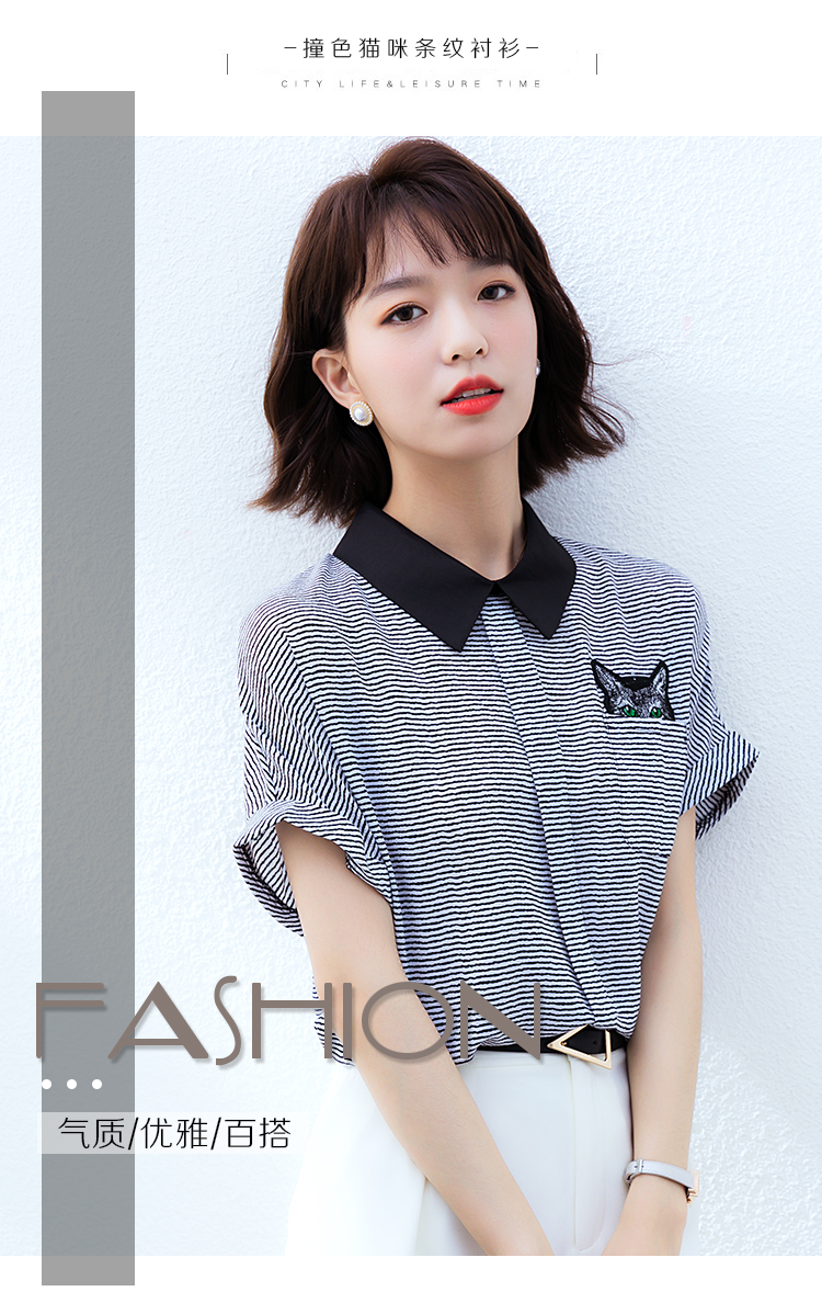 实拍2021夏季新款街头风翻领细条纹雪纺衫蝙蝠袖宽松套头百搭