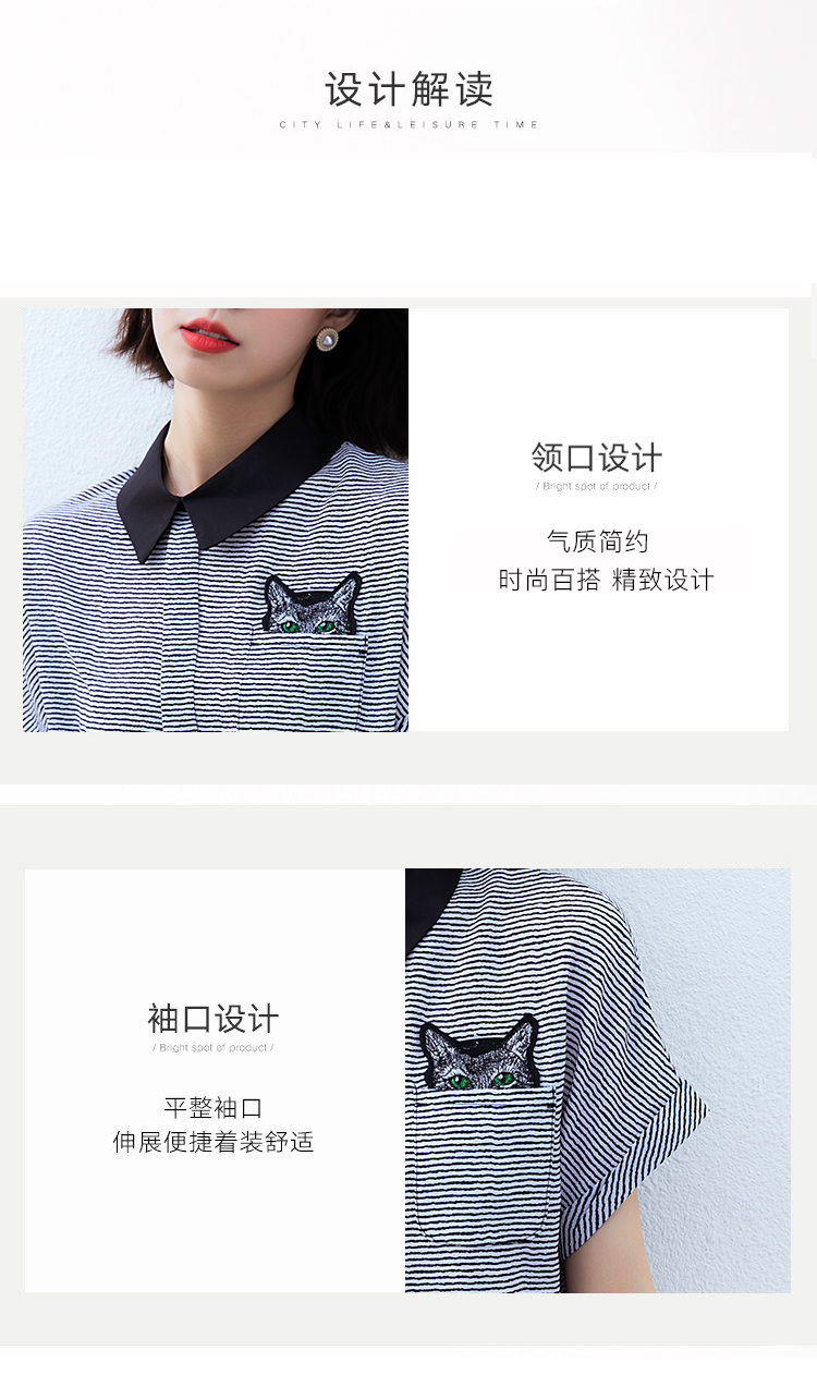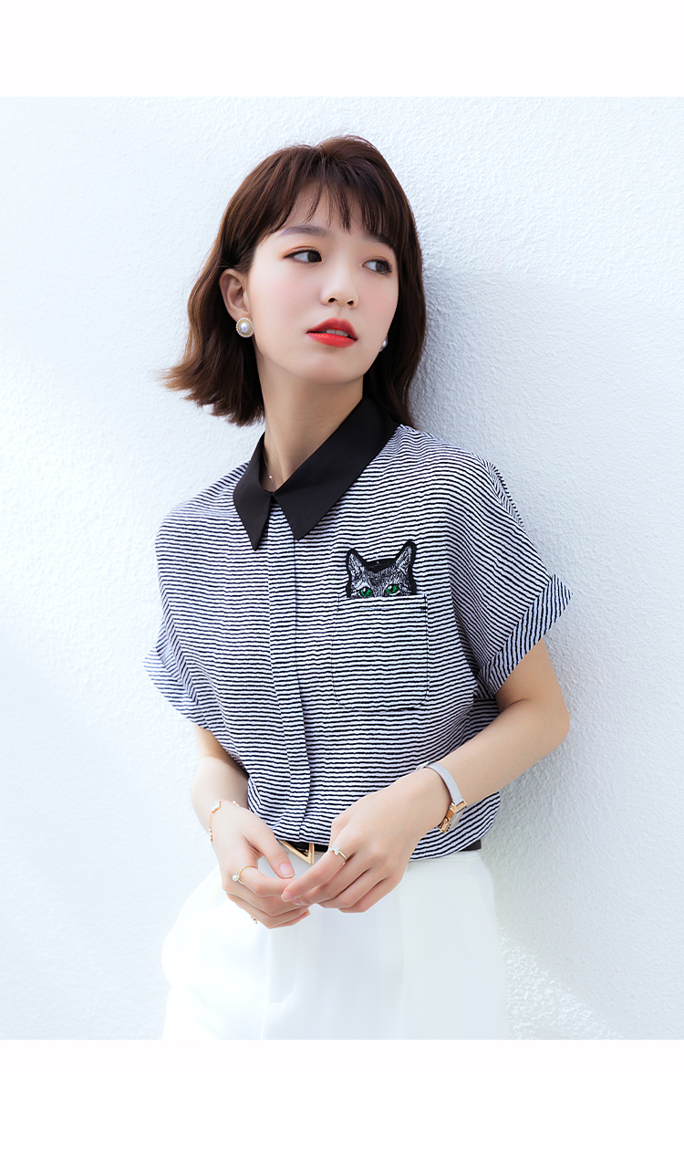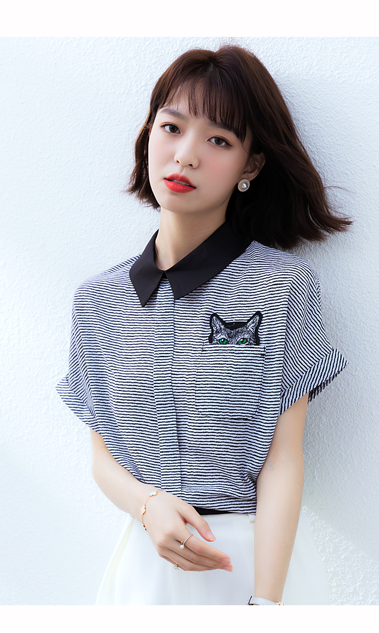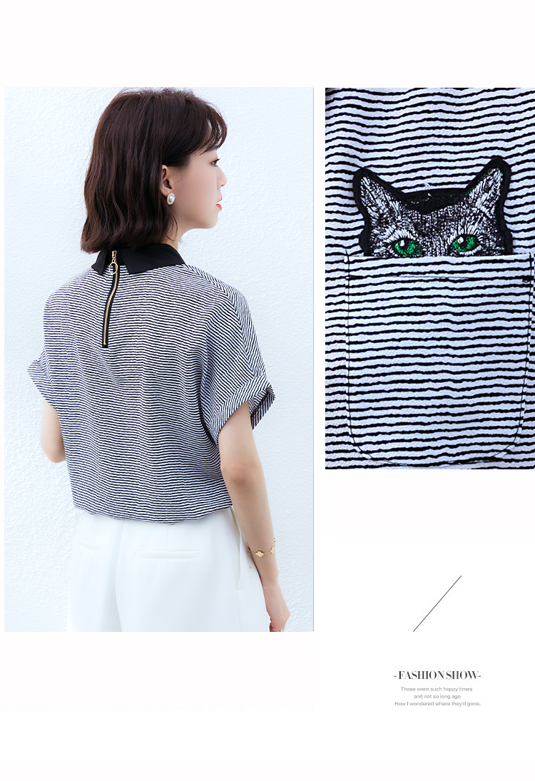 实拍2021夏季新款街头风翻领细条纹雪纺衫蝙蝠袖宽松套头百搭