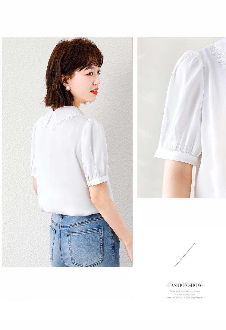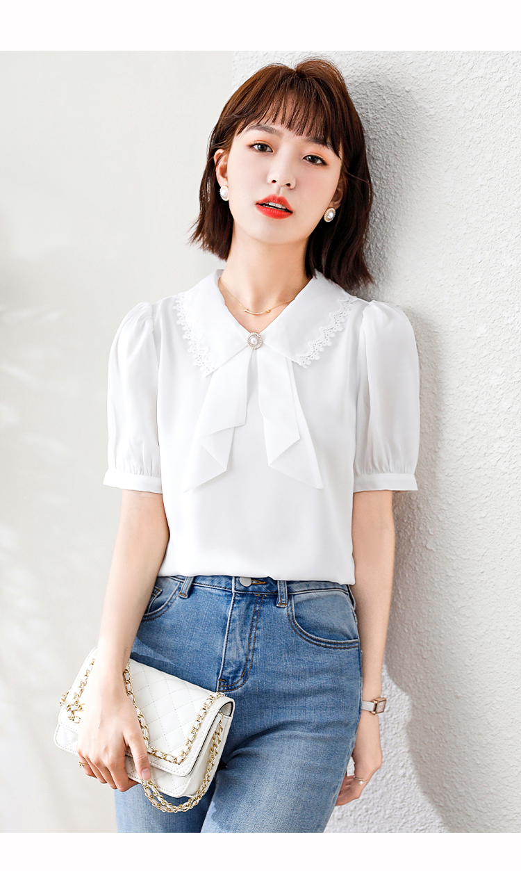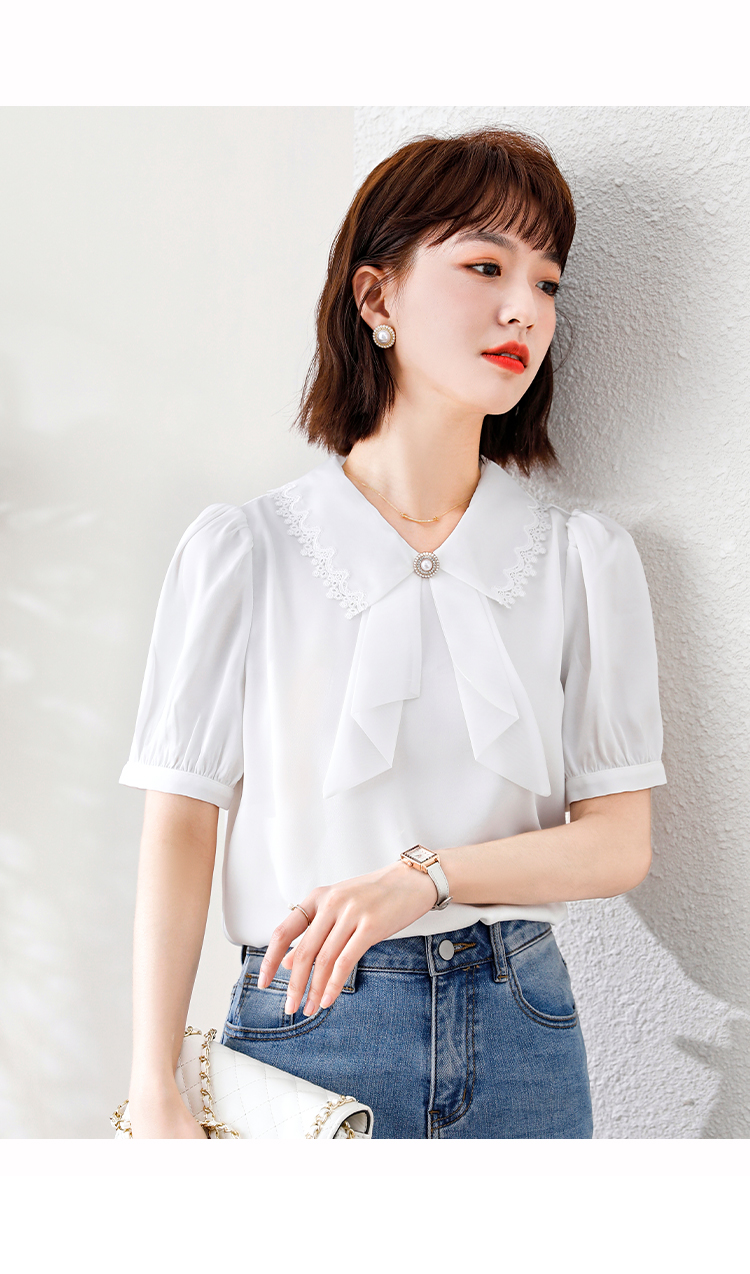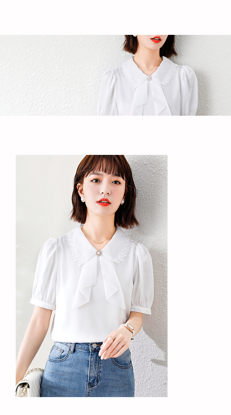 实拍雪纺短袖女2021夏新款法式蕾丝拼接领结泡泡袖设计感上衣