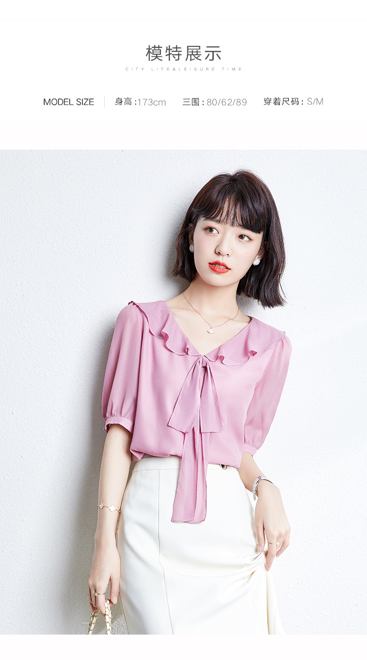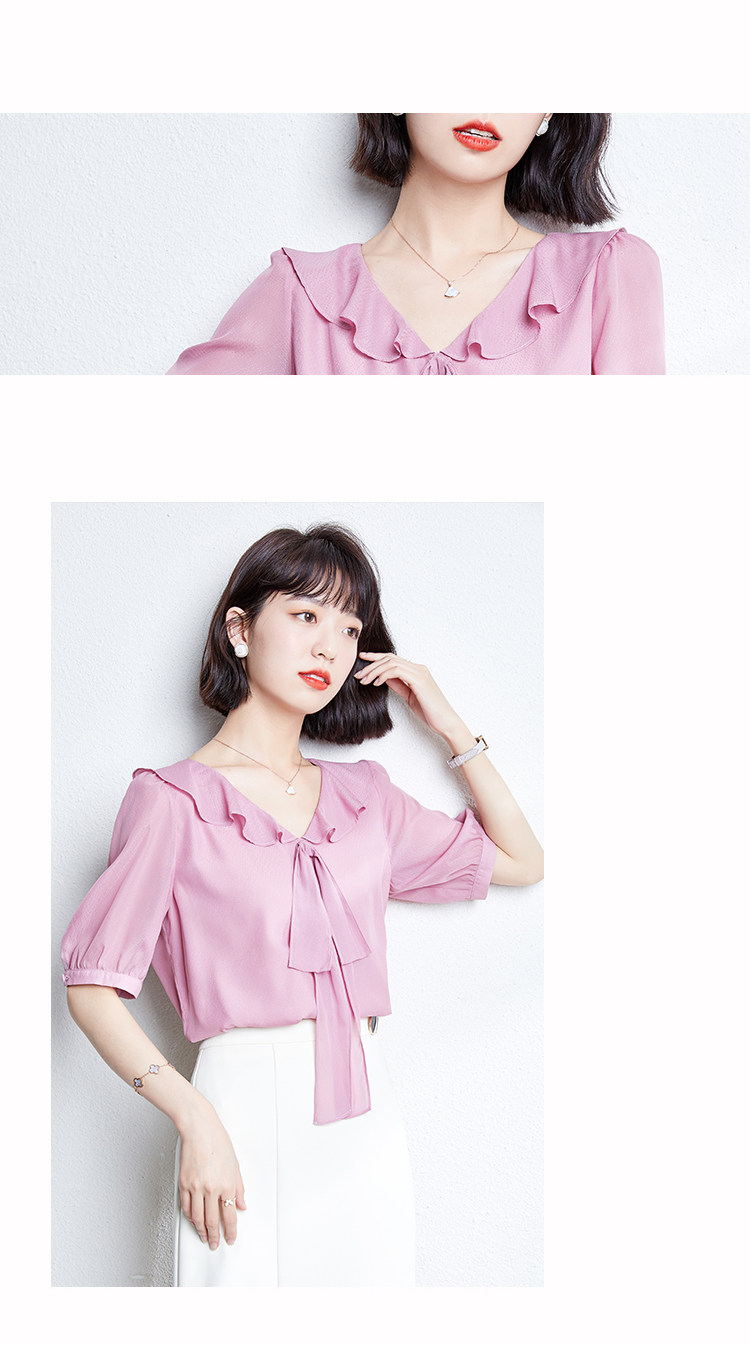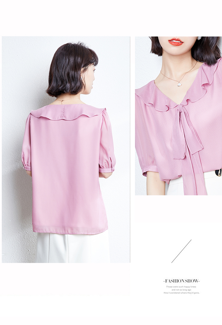 实拍温柔甜美雪纺衫女时尚薄款飘逸设计感荷叶边套头短袖飘带