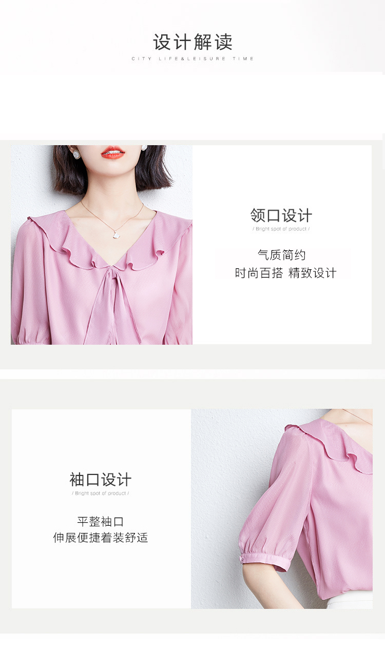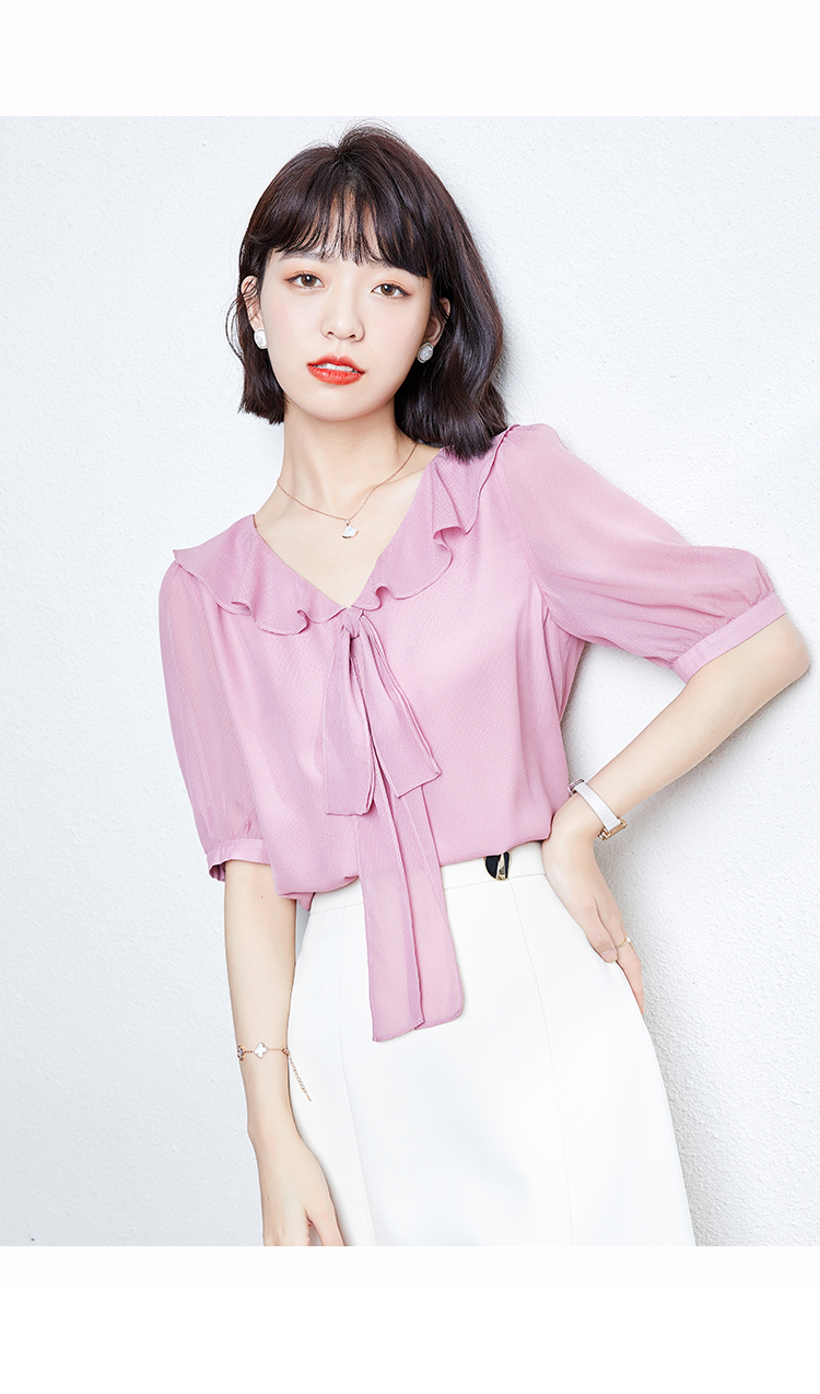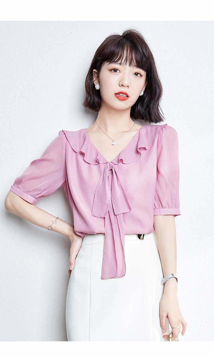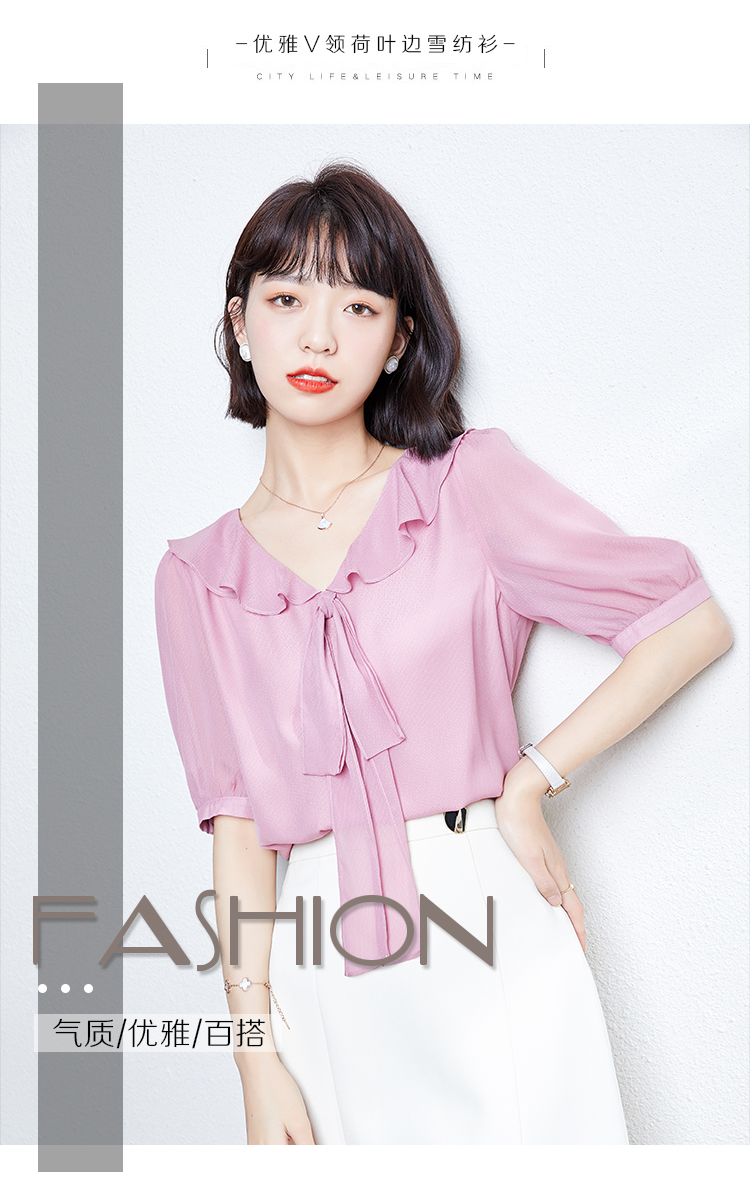 实拍温柔甜美雪纺衫女时尚薄款飘逸设计感荷叶边套头短袖飘带