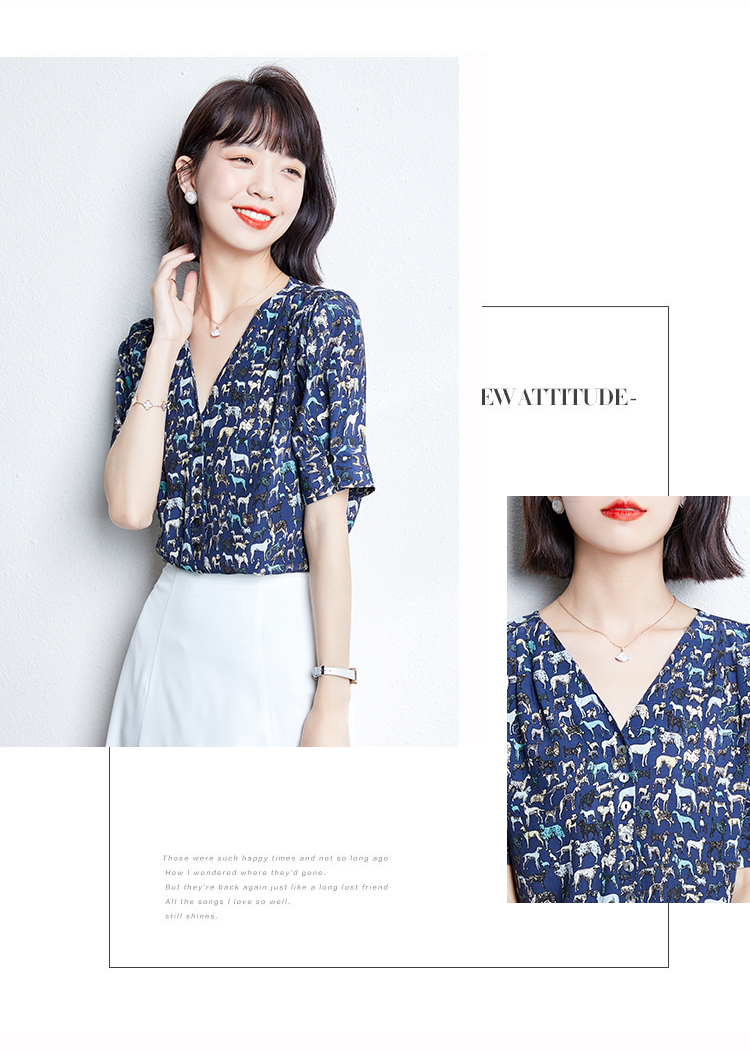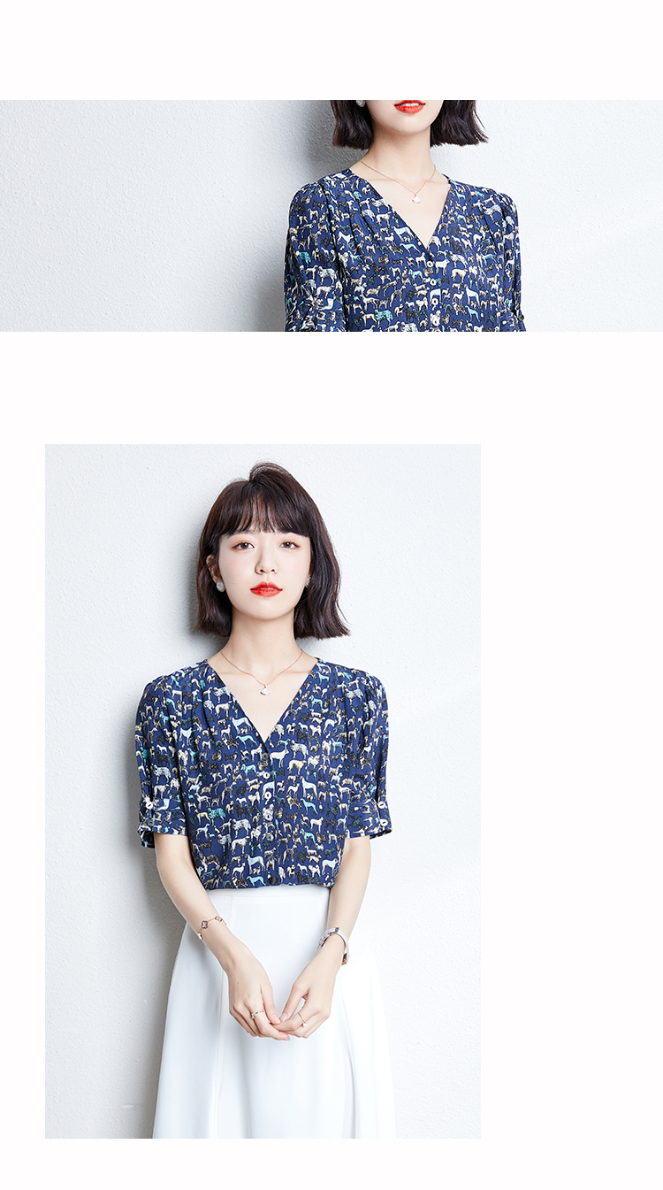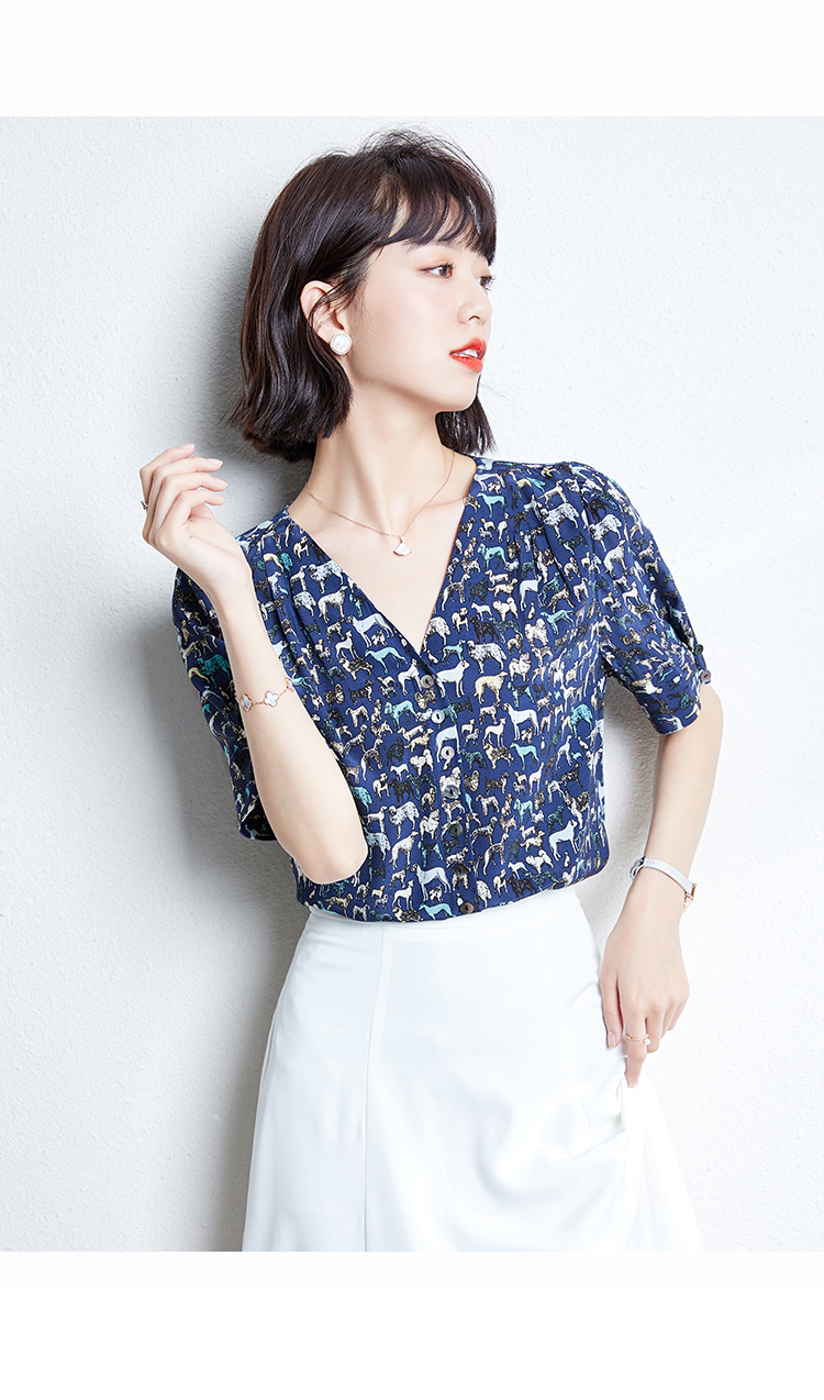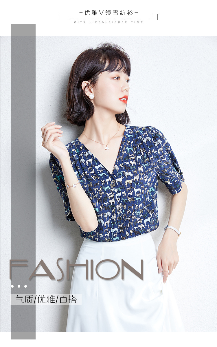 实拍法式复古V领动物印花雪纺衫2021夏装新款小众设计感衬衫