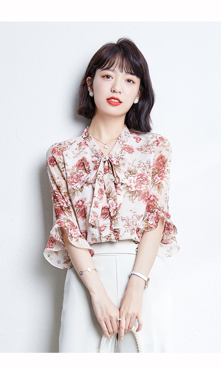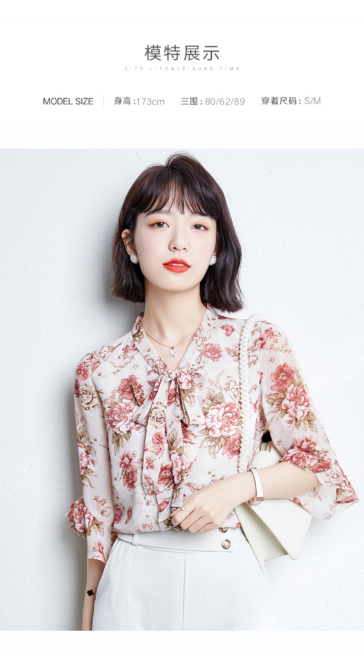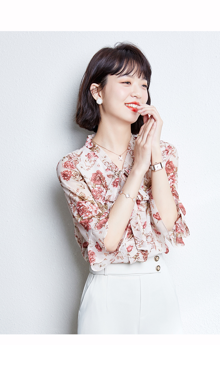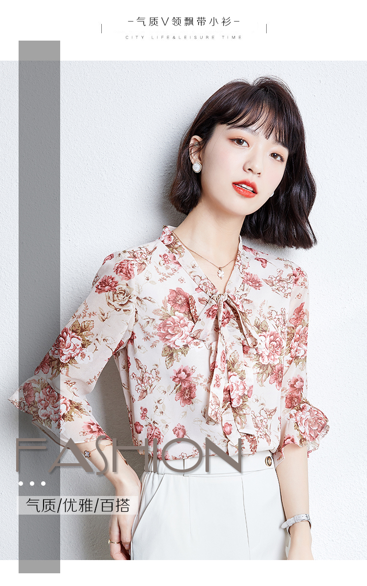 实拍2021夏装新款V领飘带小衫时尚花色五分袖套头印花上衣女