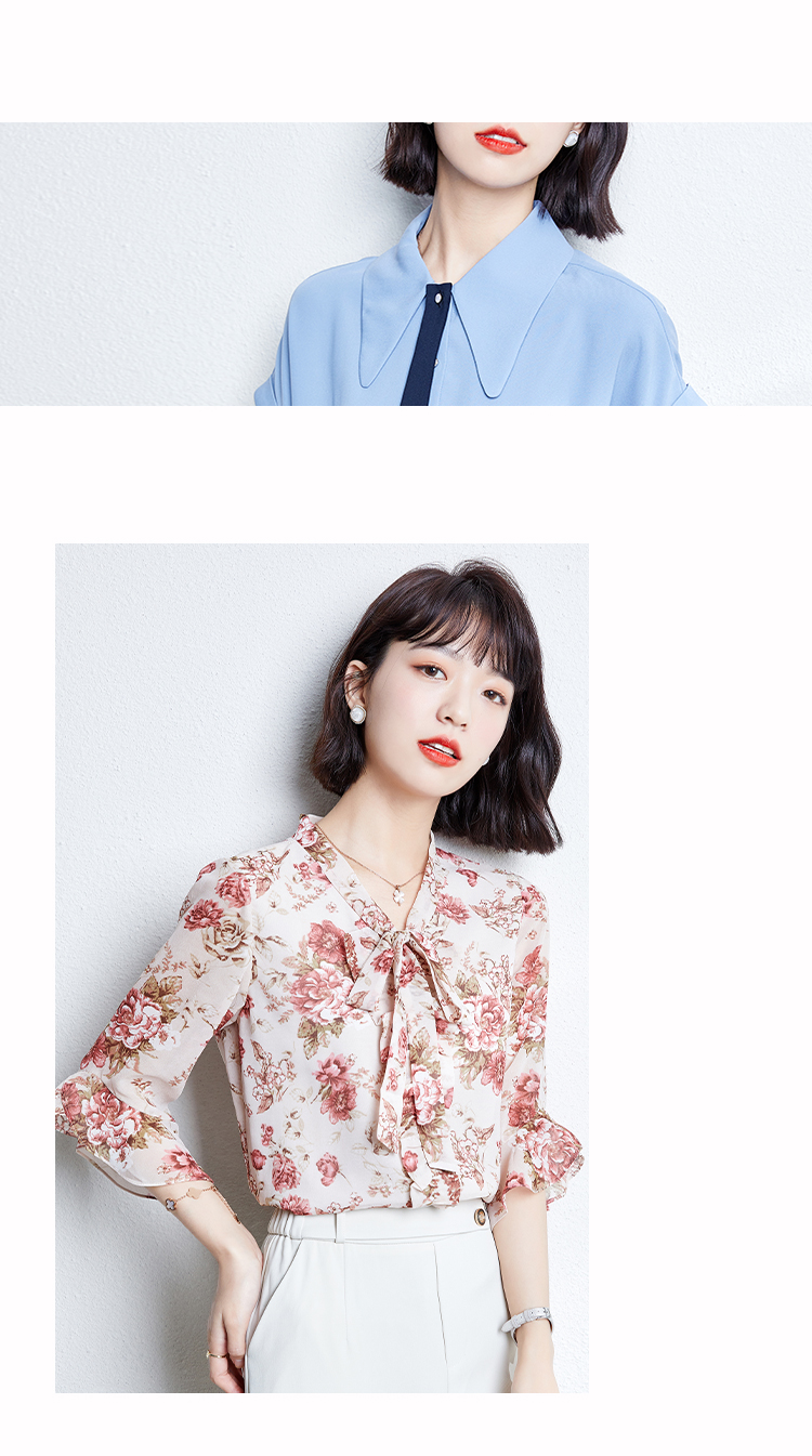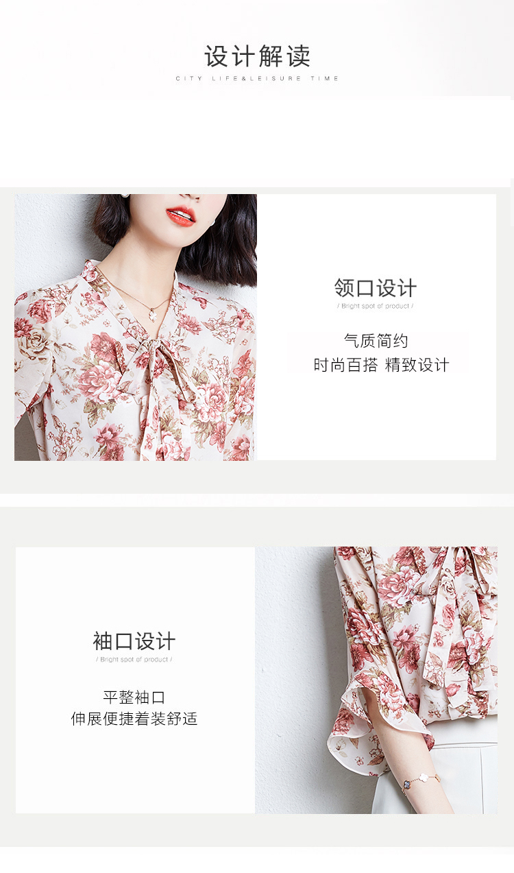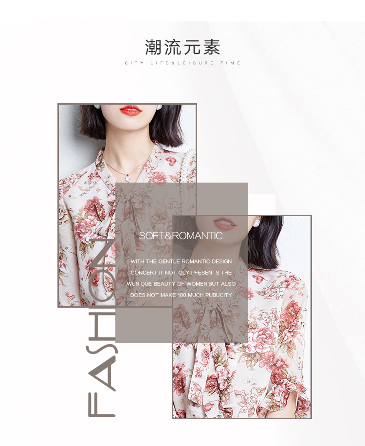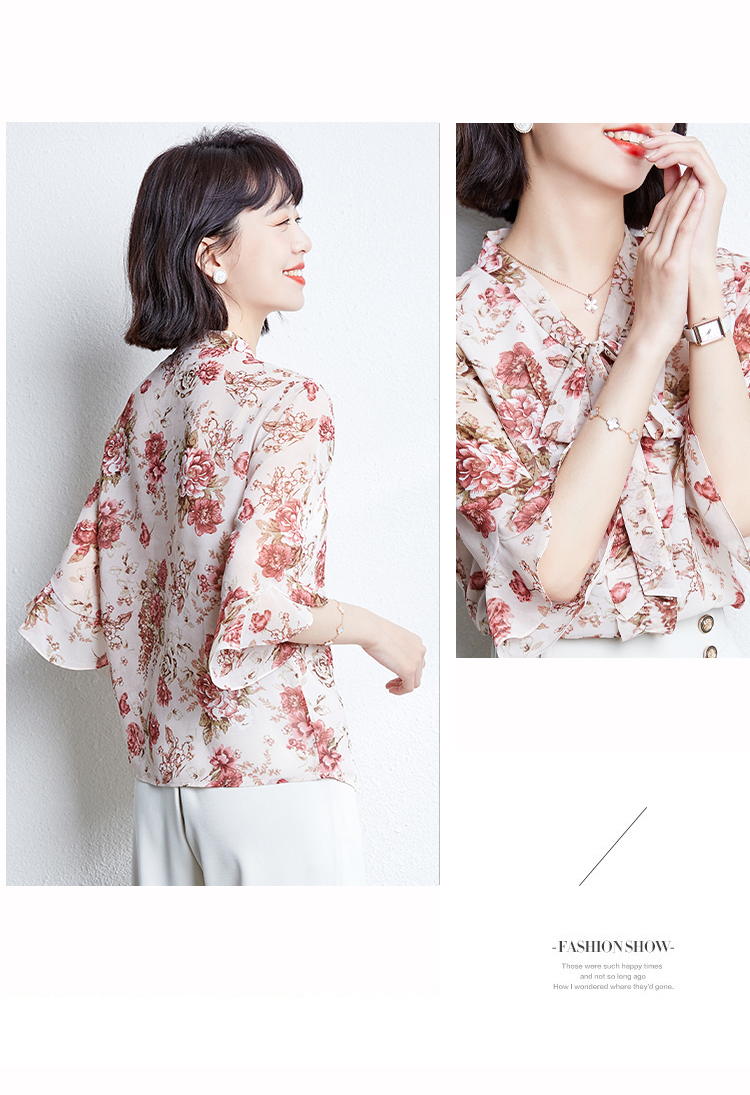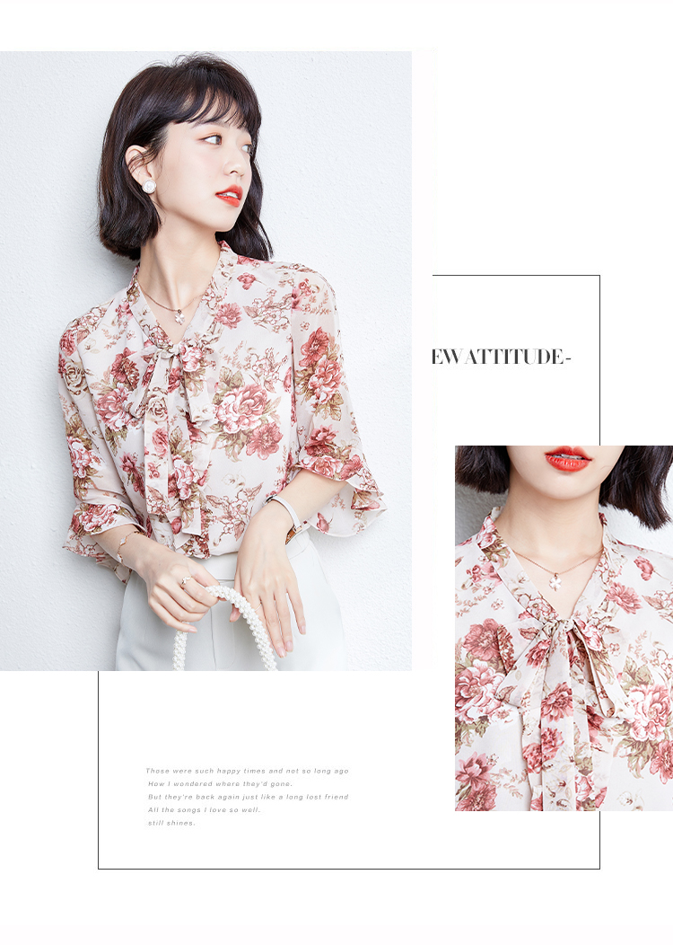 实拍2021夏装新款V领飘带小衫时尚花色五分袖套头印花上衣女