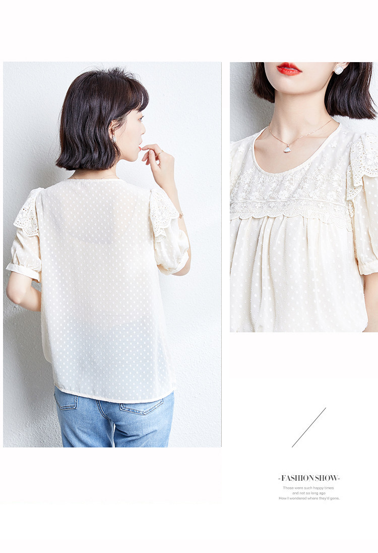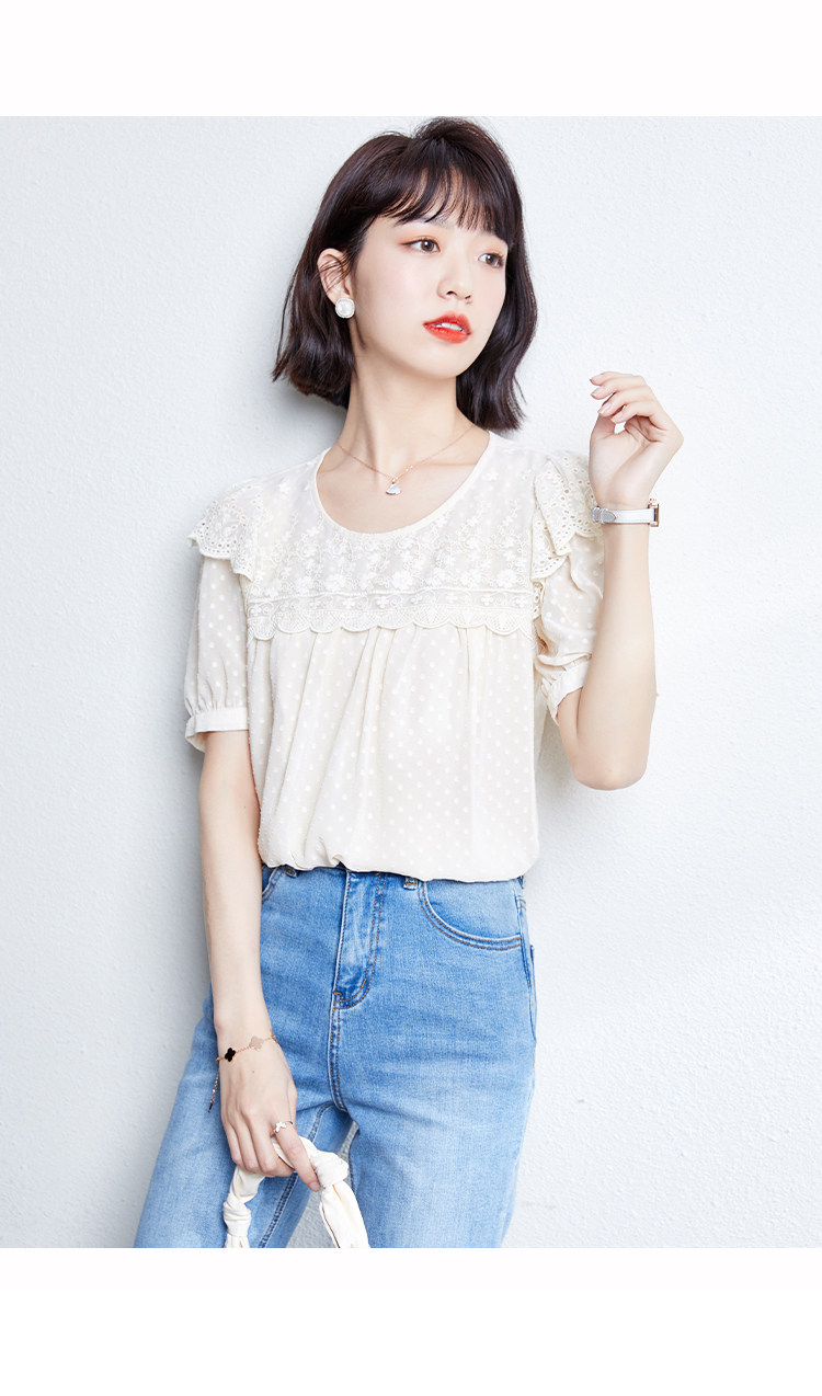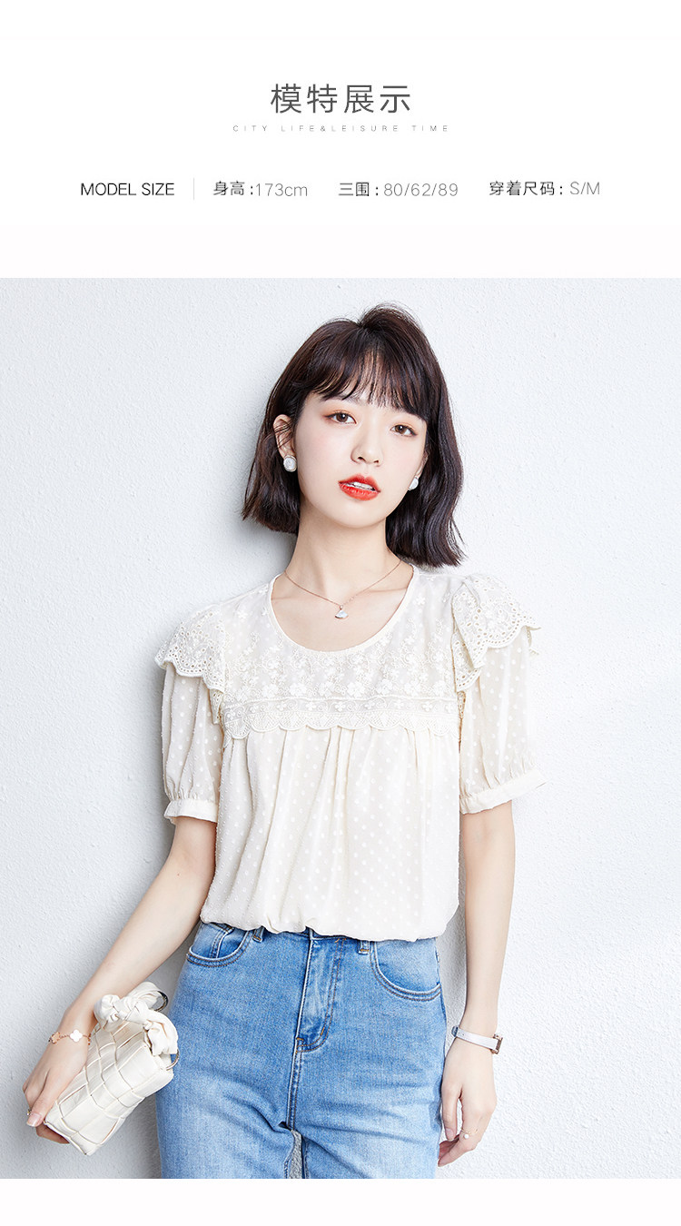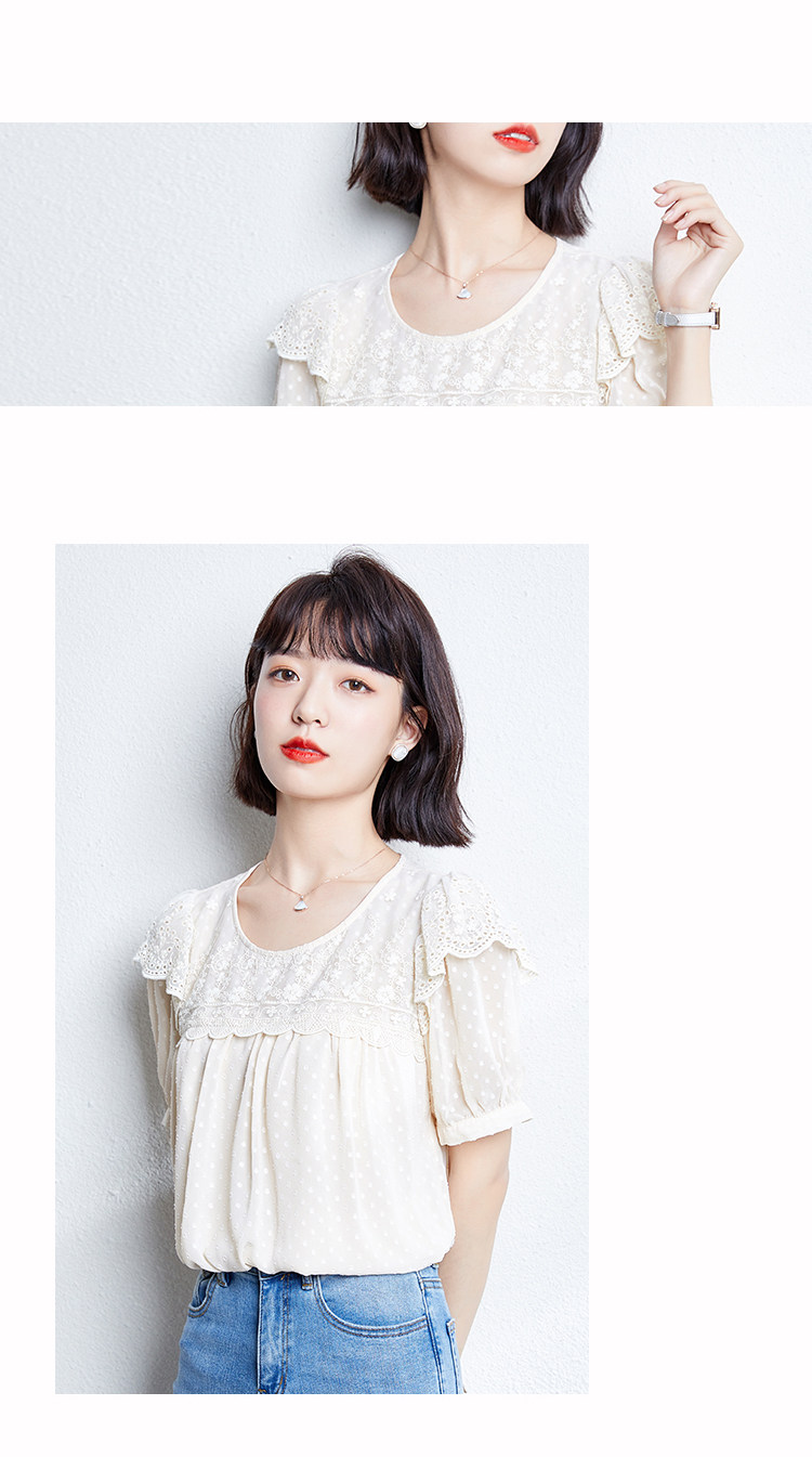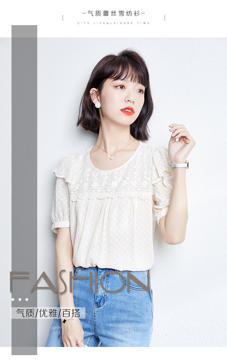实拍雪纺衬衫女2021夏季韩版显瘦圆领遮肚子短袖荷叶边小衫
