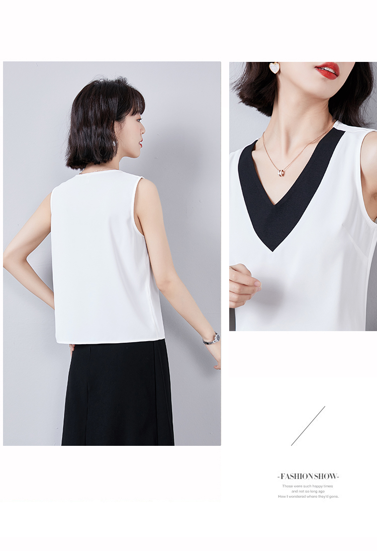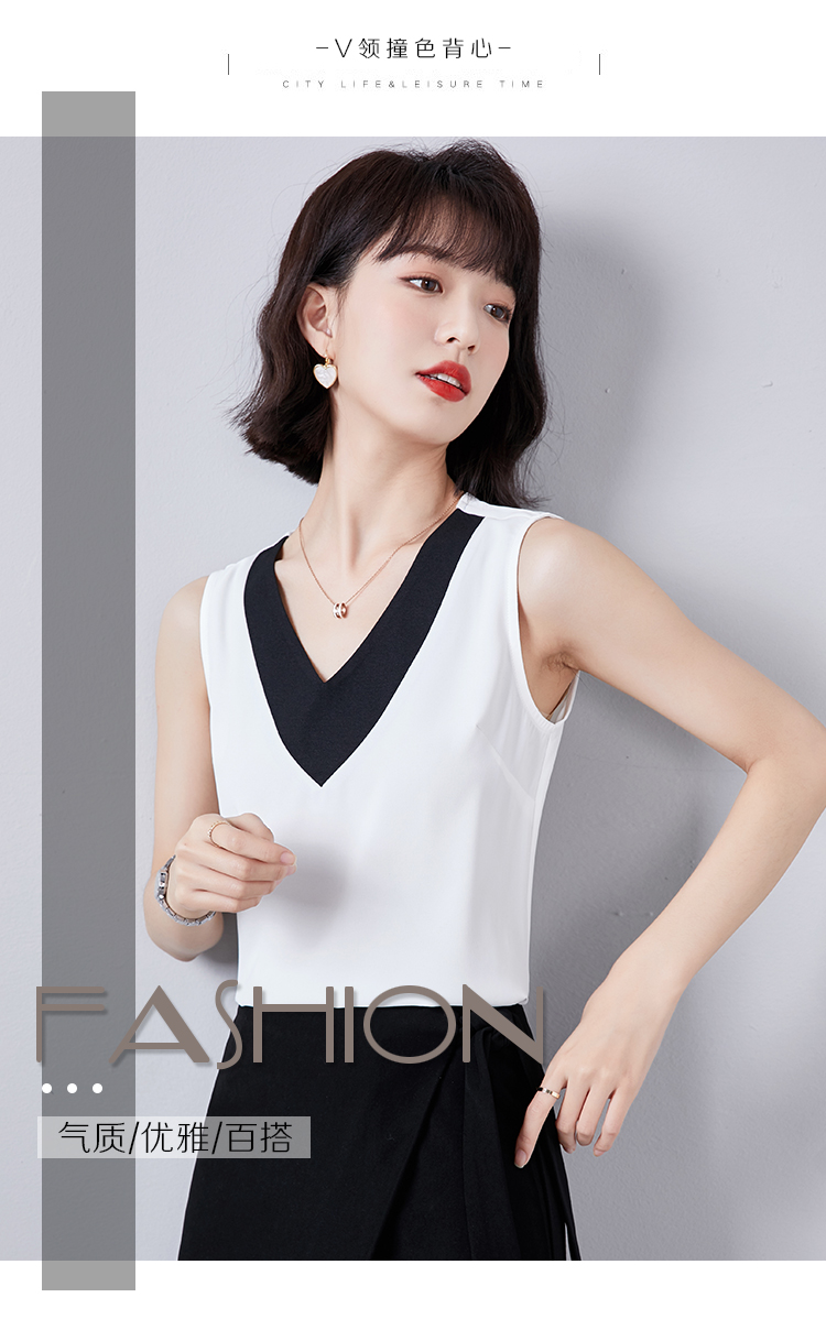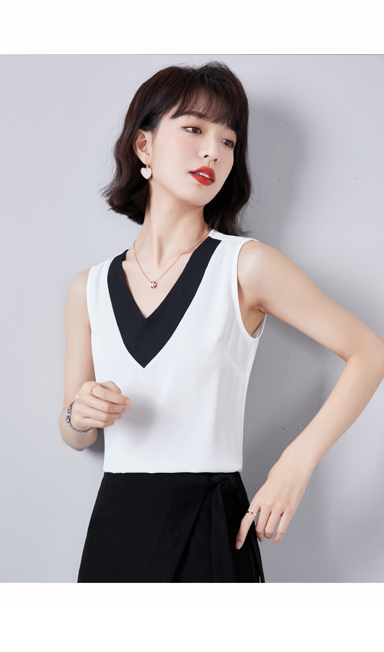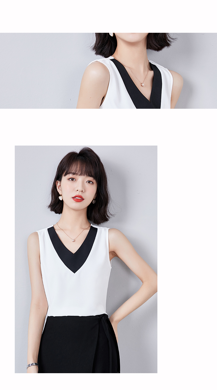 实拍大V领黑白拼色吊带背心女2021夏装新款外穿气质无袖雪纺衫
