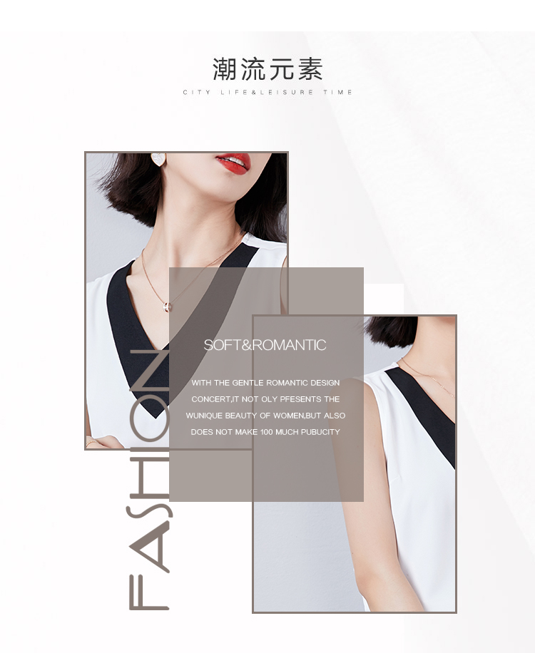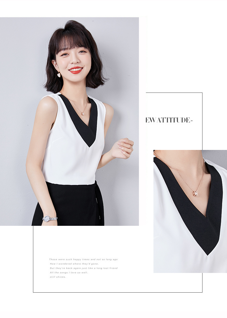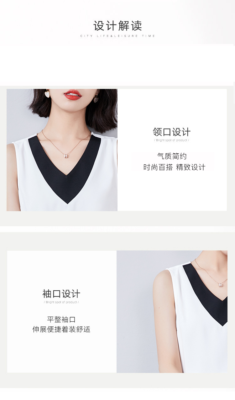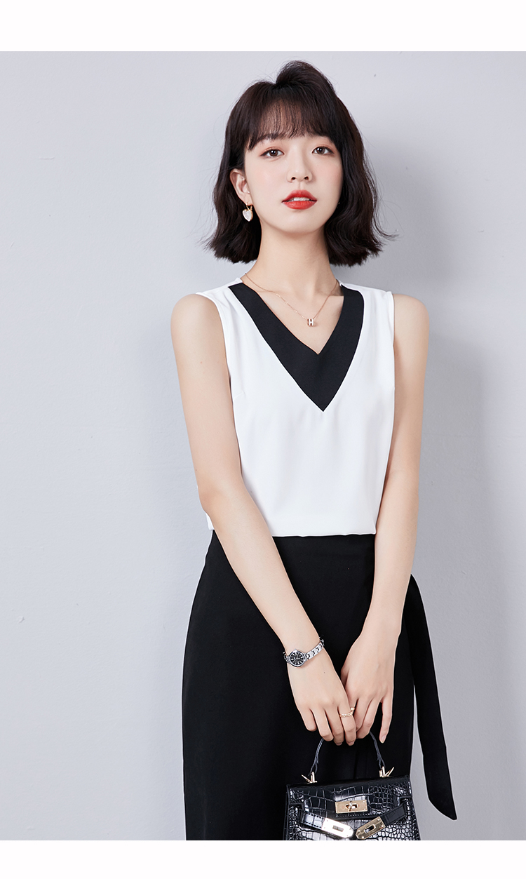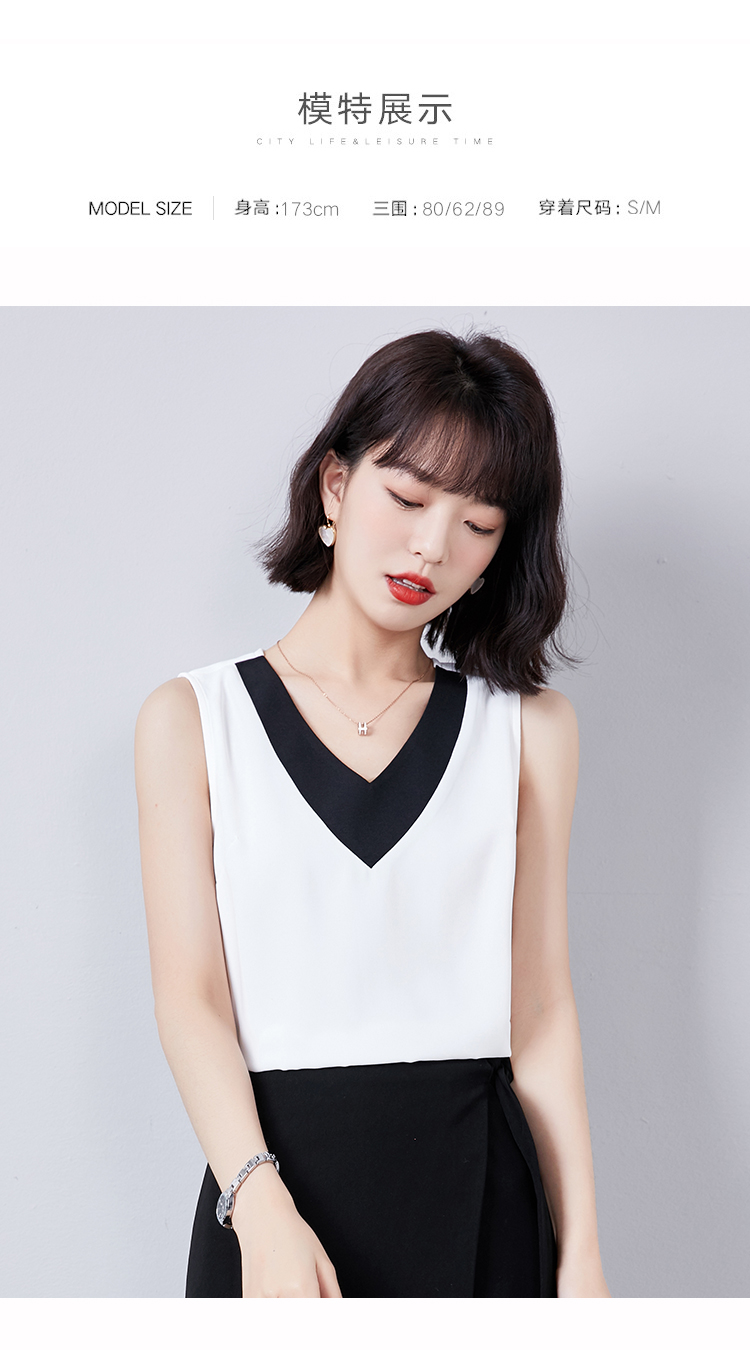 实拍大V领黑白拼色吊带背心女2021夏装新款外穿气质无袖雪纺衫