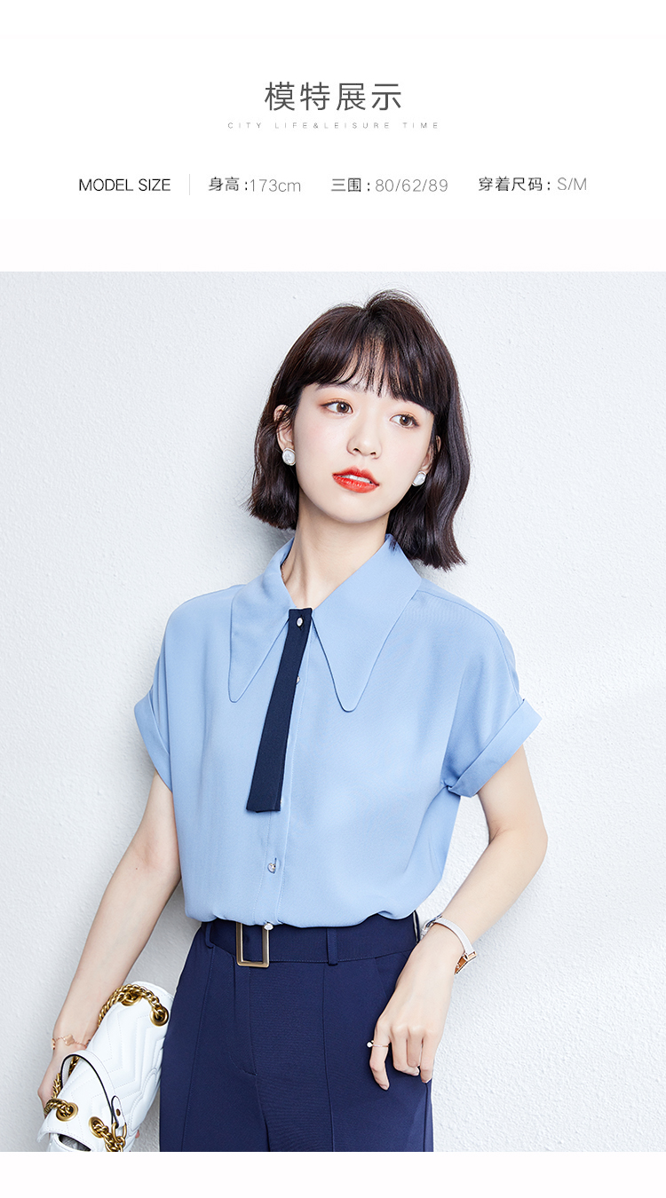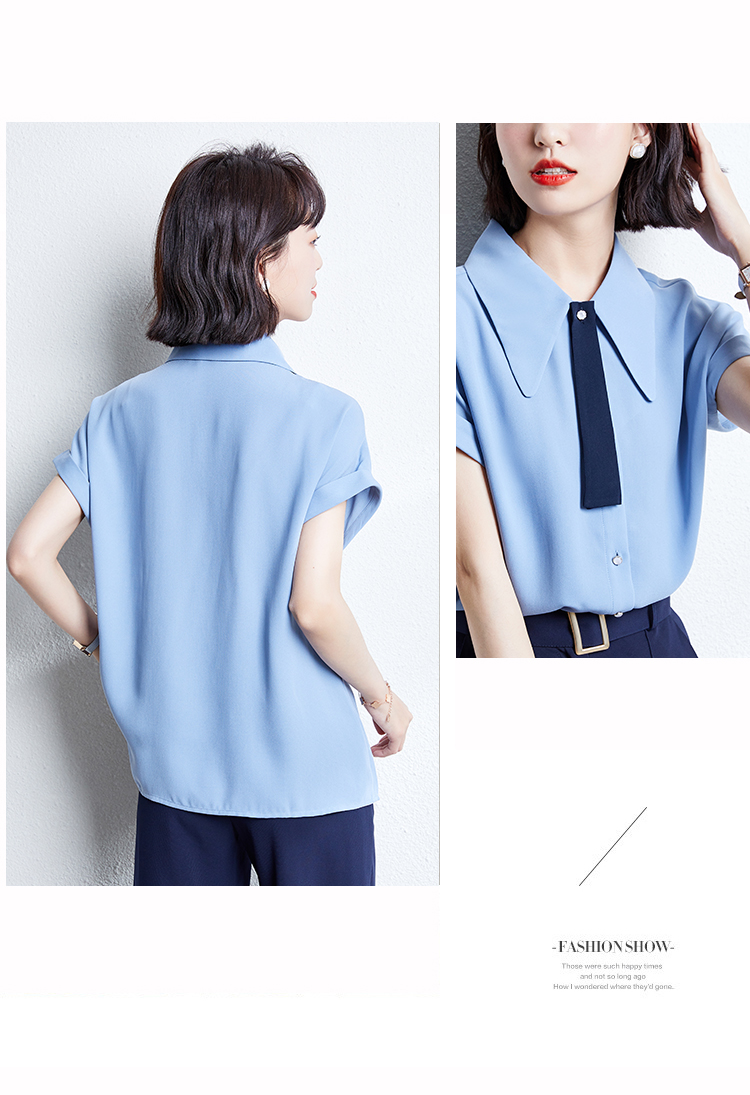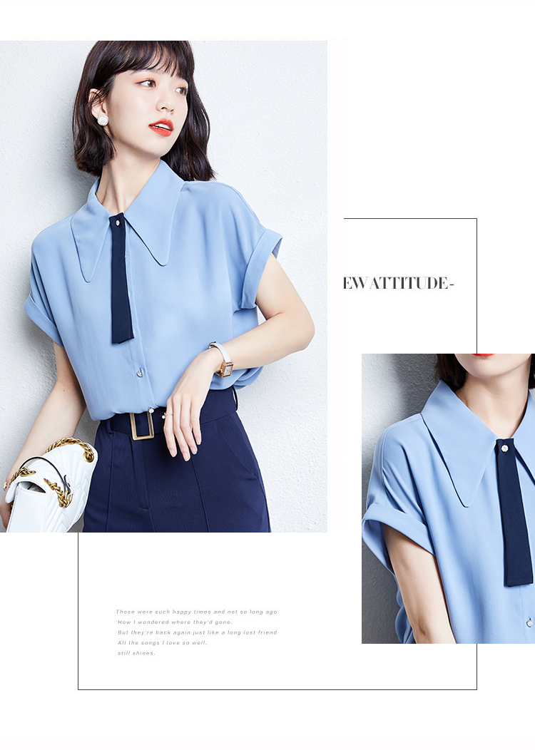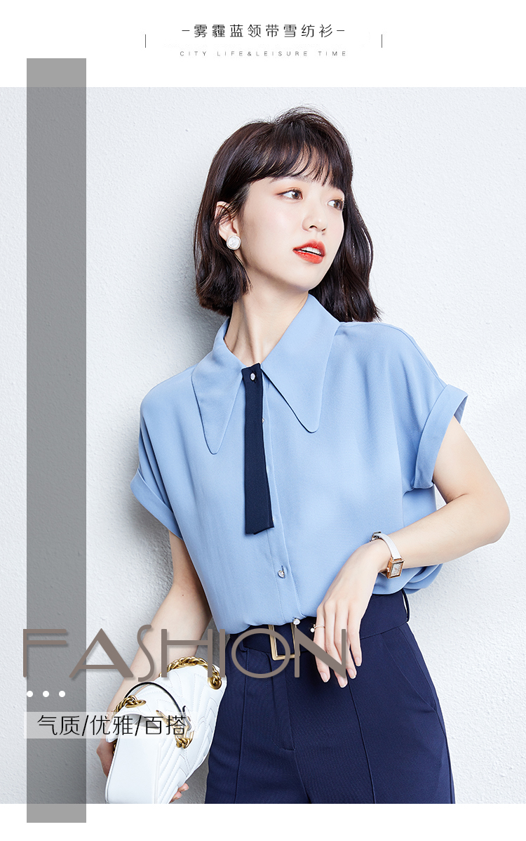 实拍雾霾蓝雪纺衬衫女夏新款短袖2021新款系带设计感气质小衫