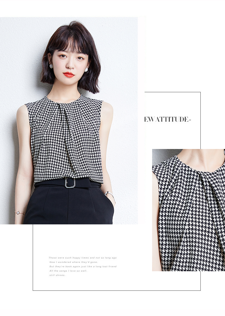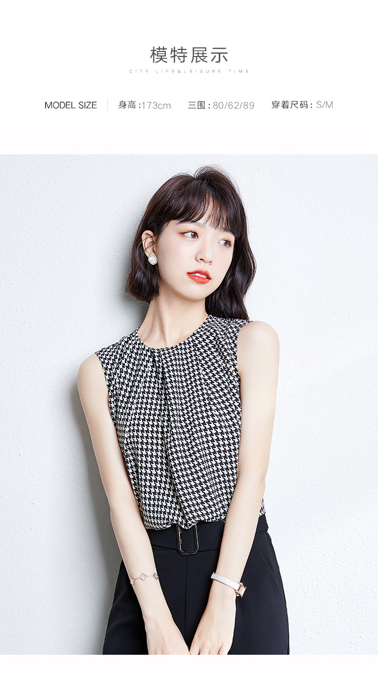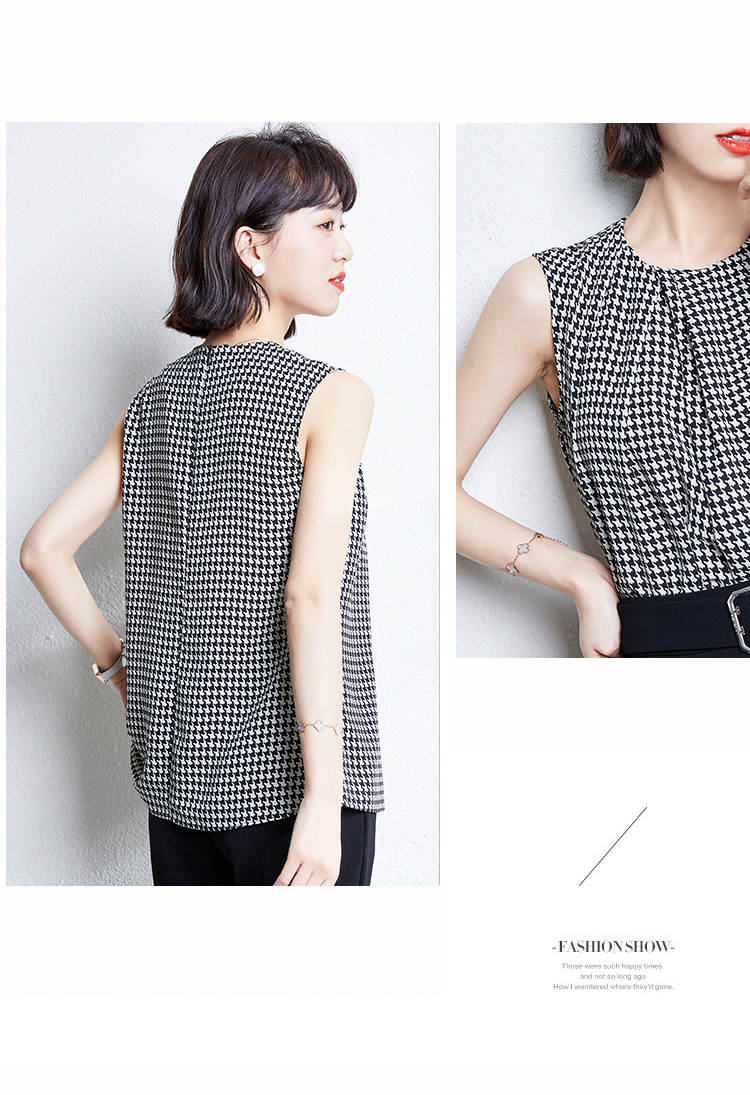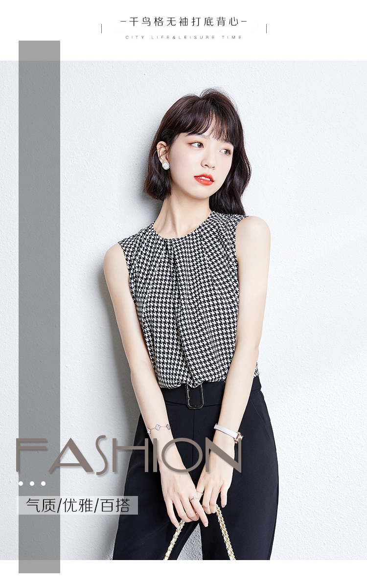 实拍~2021夏新装格子吊带圆领宽松百搭千鸟格无袖雪纺衫衬衣女