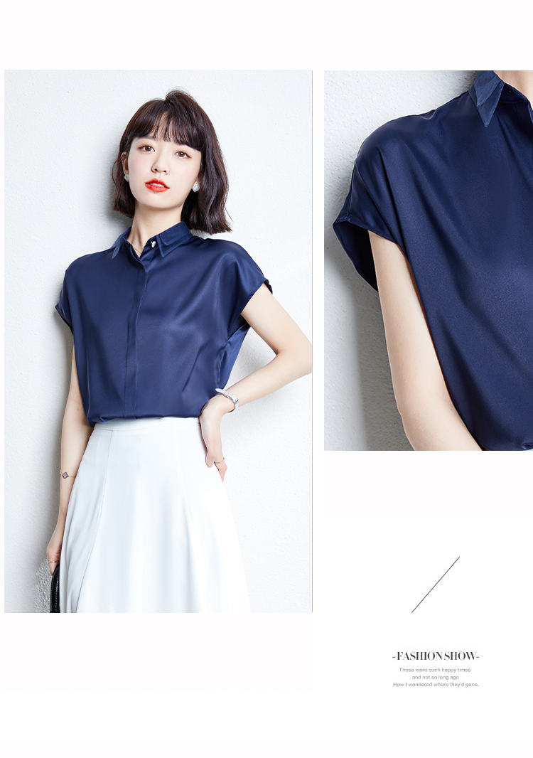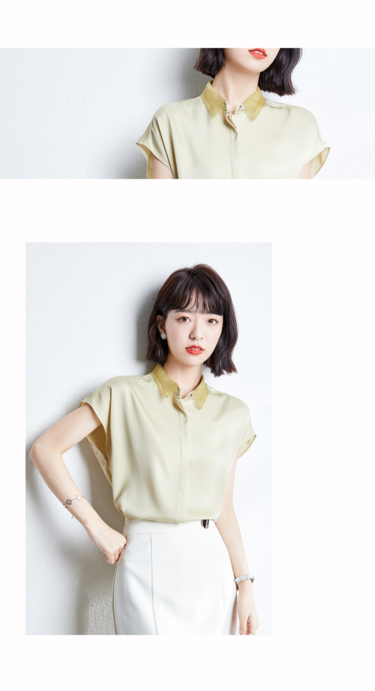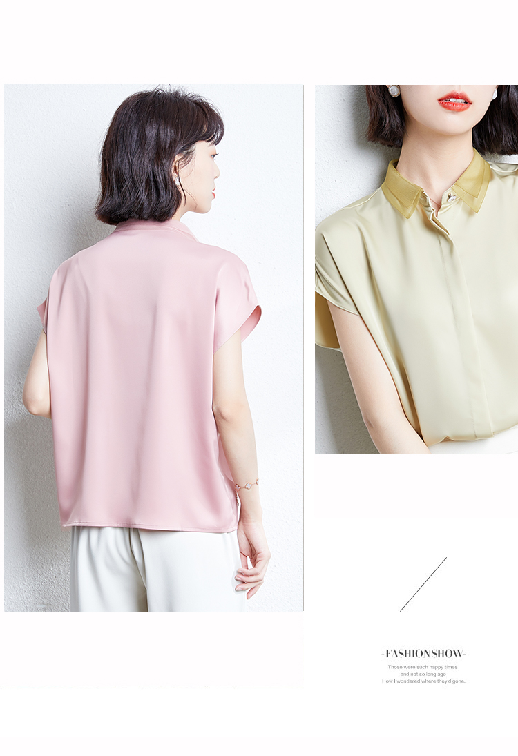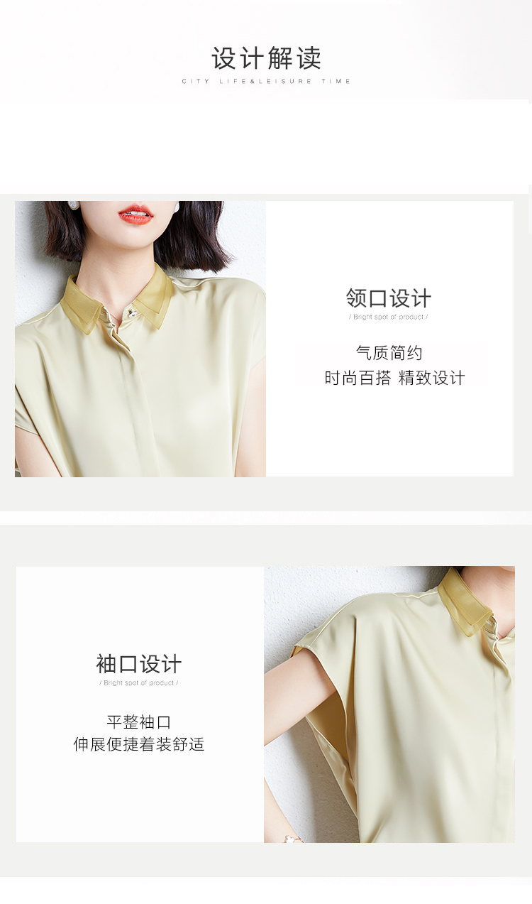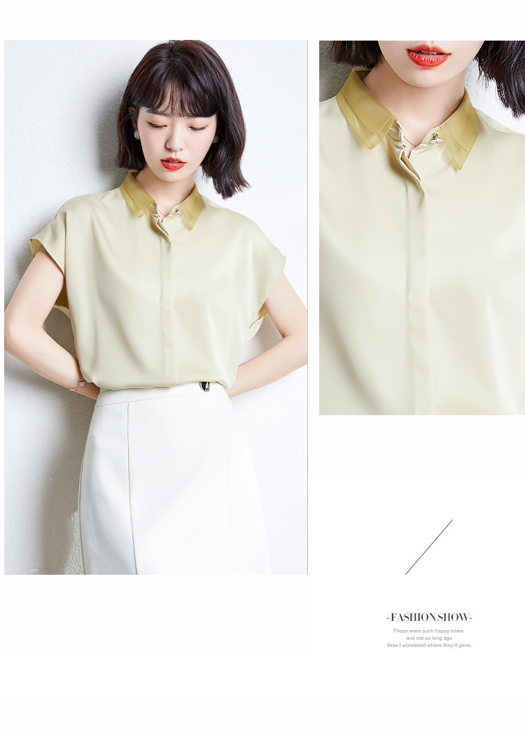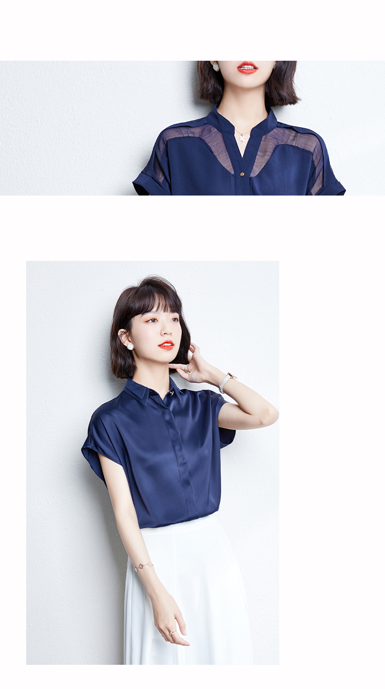实拍缎面衬衫设计感小众气质雪纺衫纯色宽松短袖网纱拼接上衣