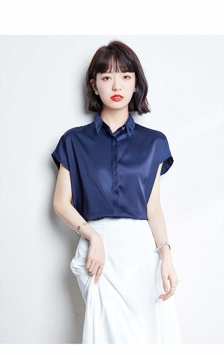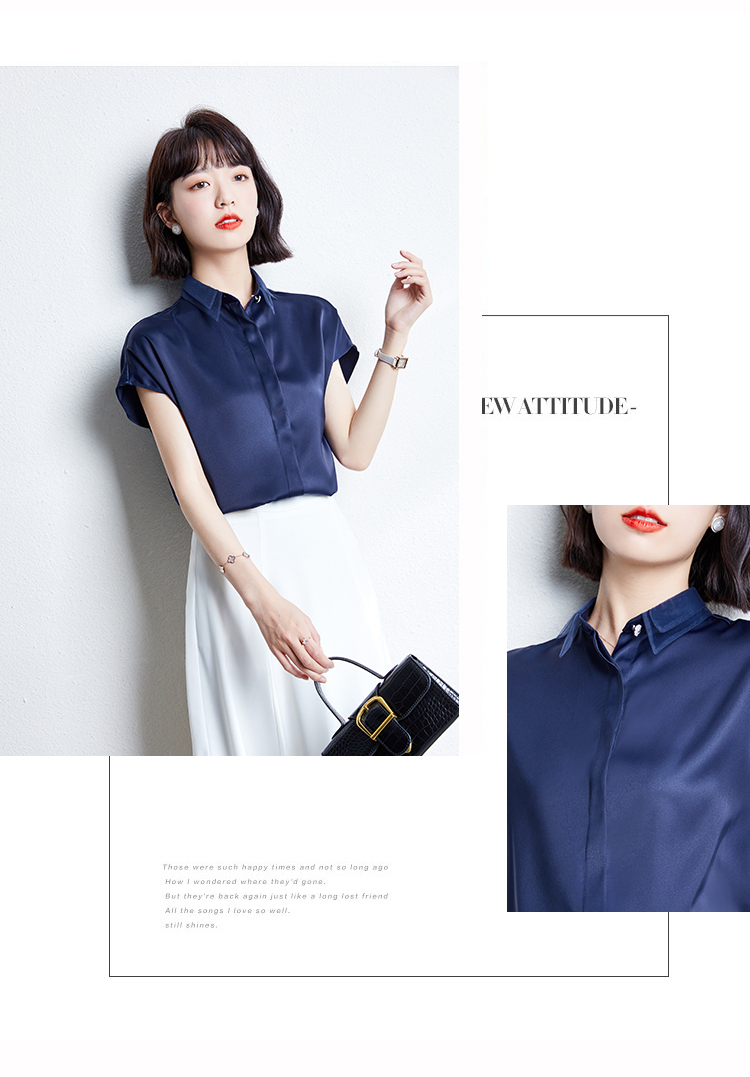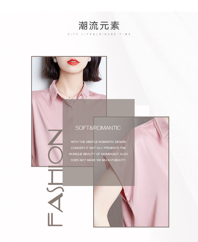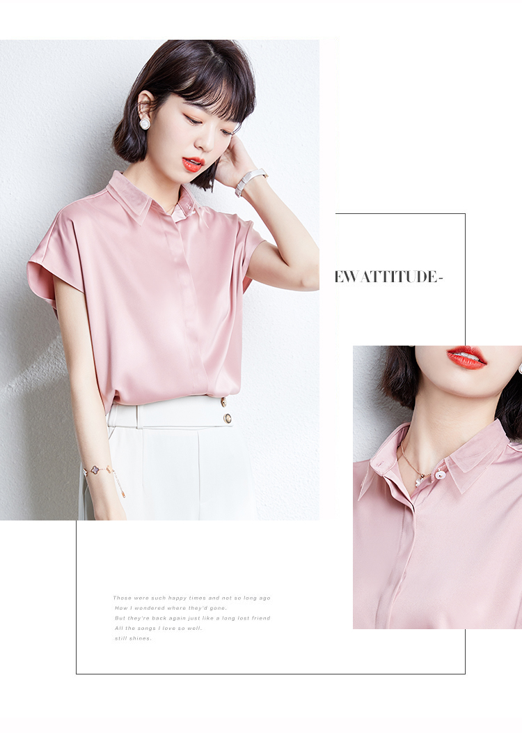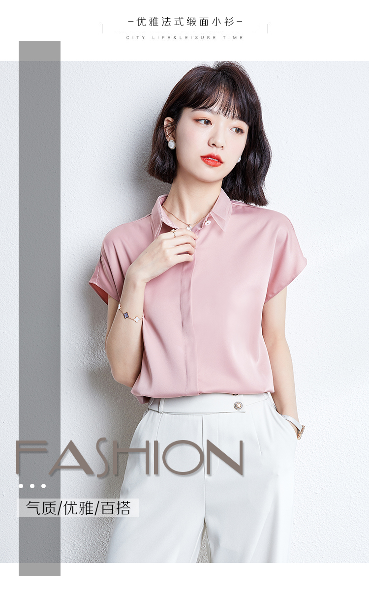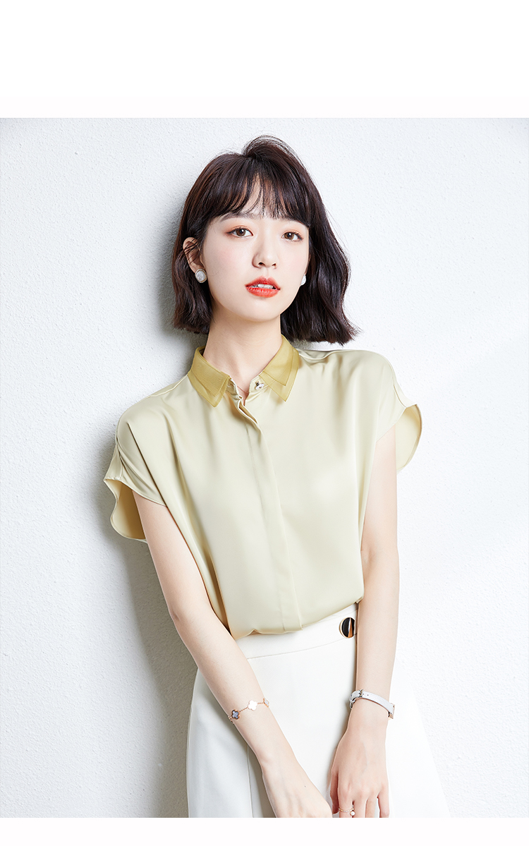 实拍缎面衬衫设计感小众气质雪纺衫纯色宽松短袖网纱拼接上衣
