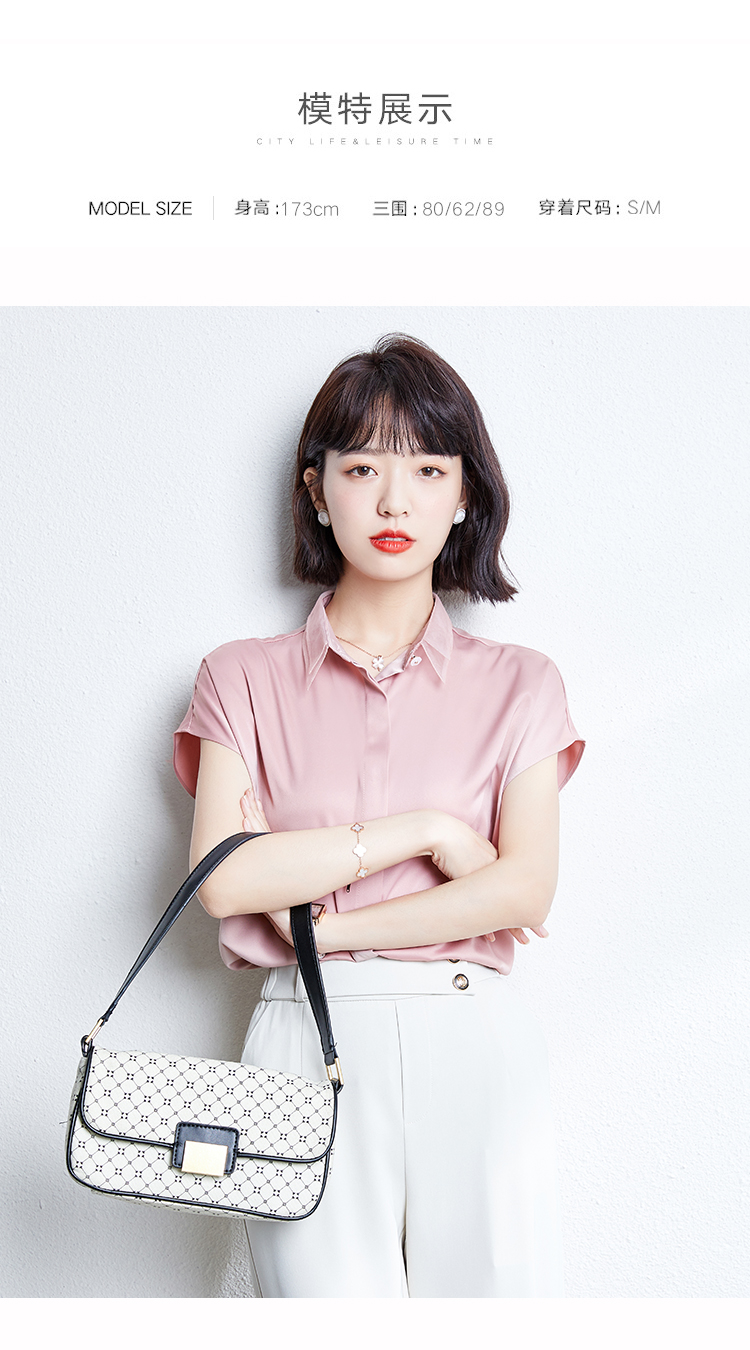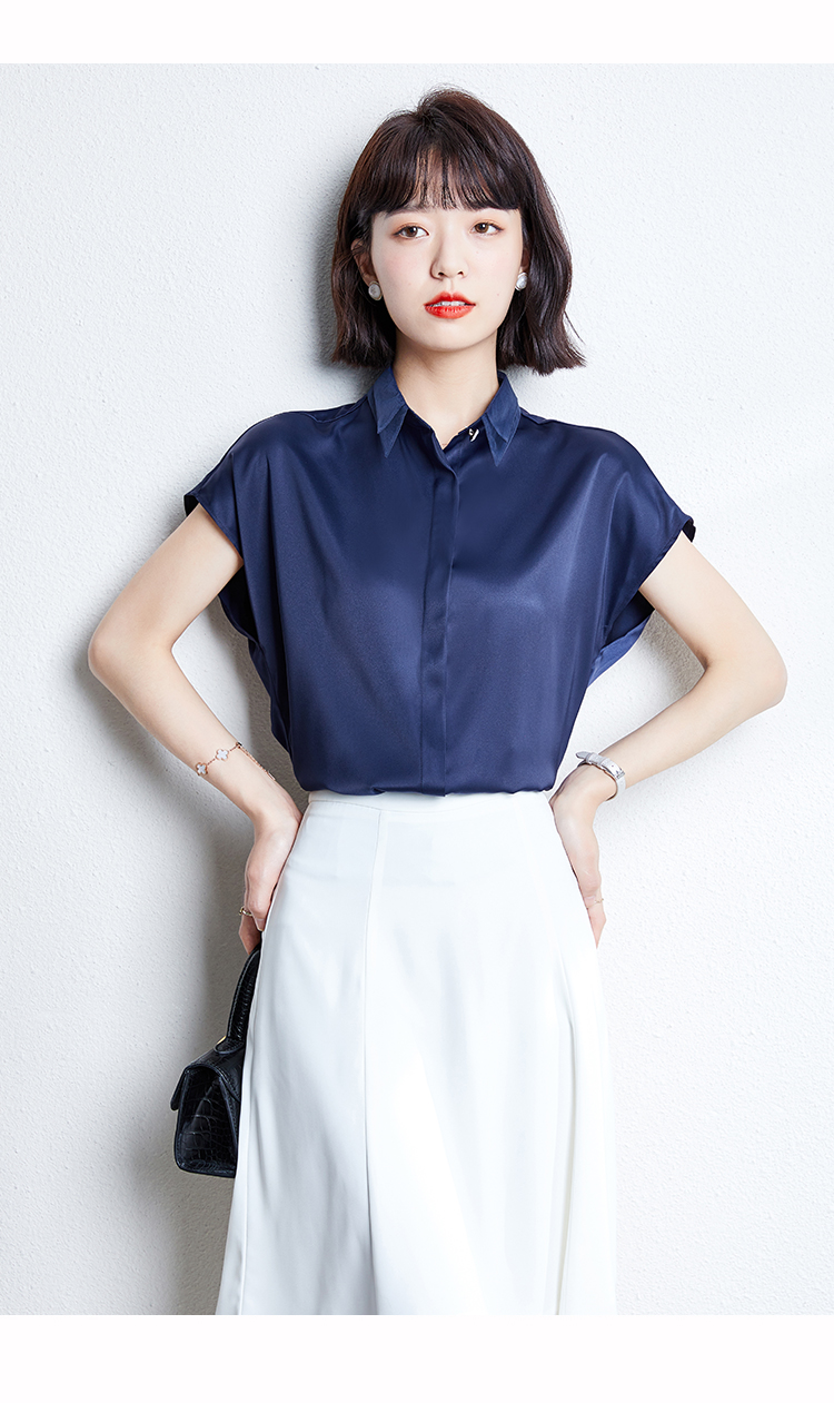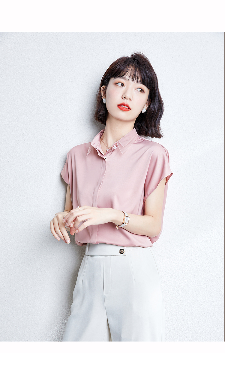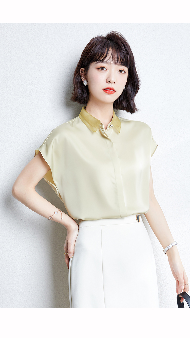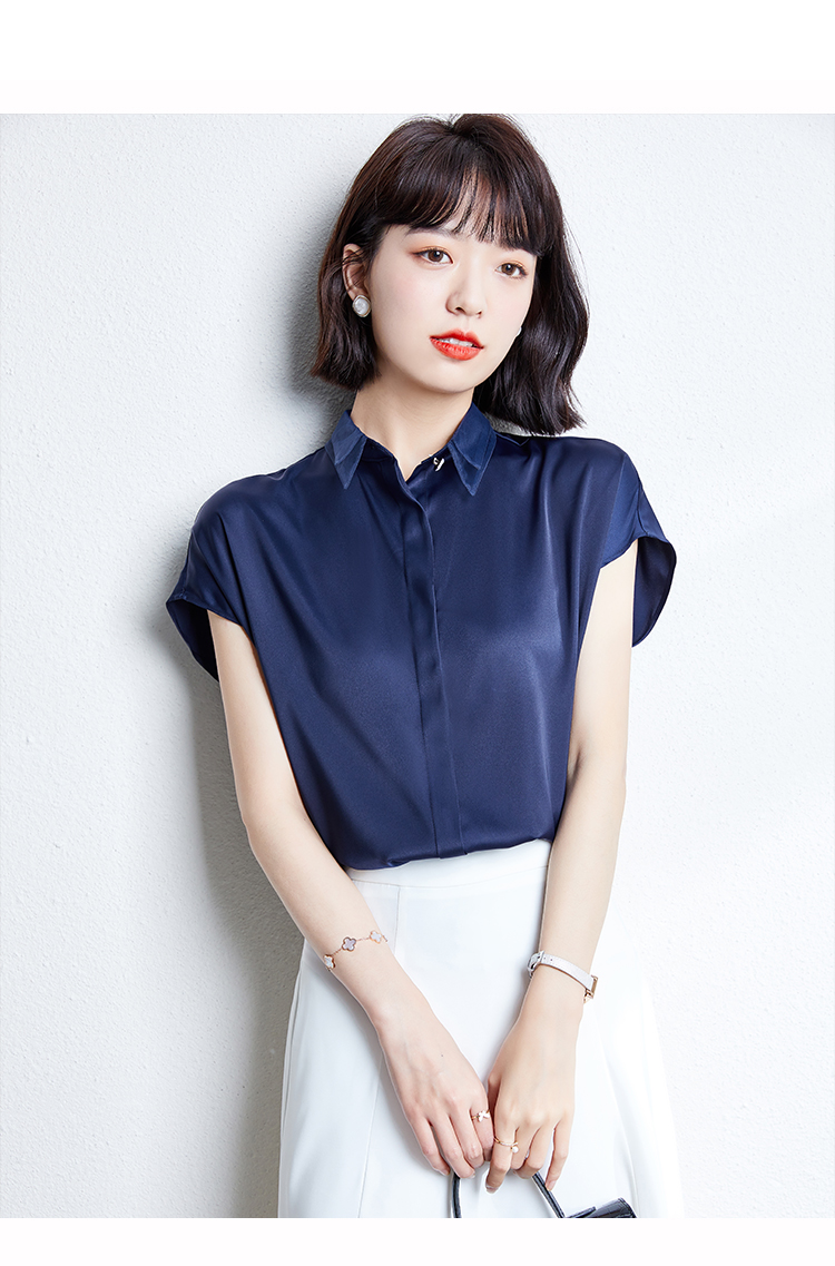 实拍缎面衬衫设计感小众气质雪纺衫纯色宽松短袖网纱拼接上衣