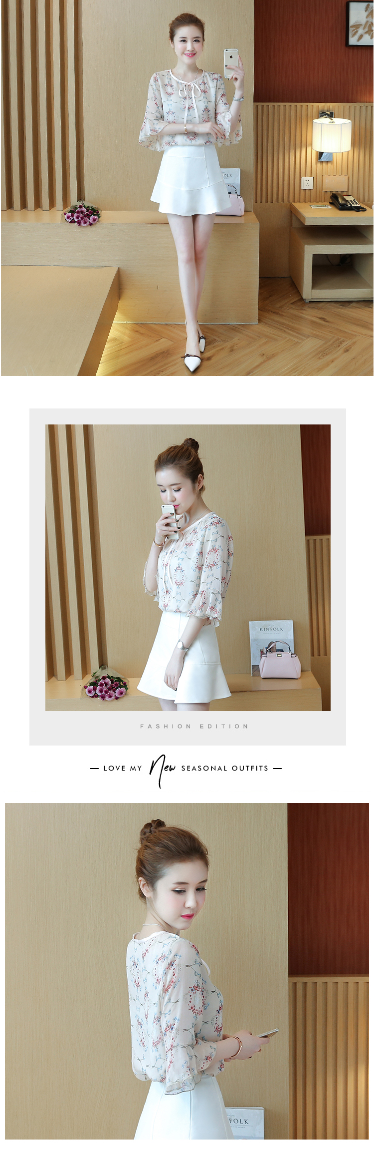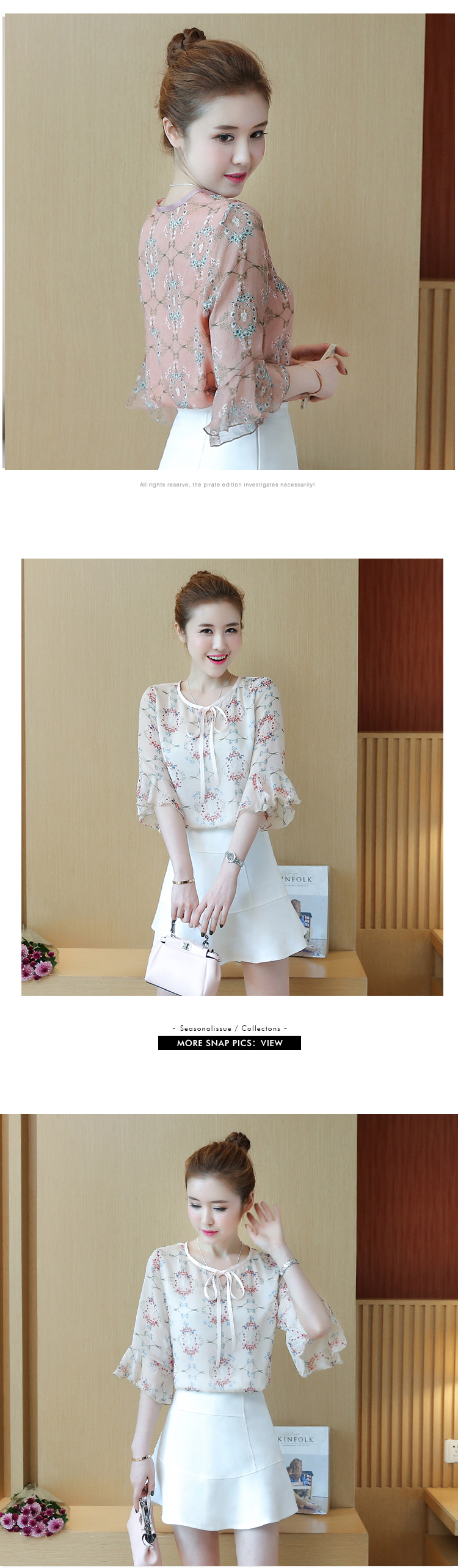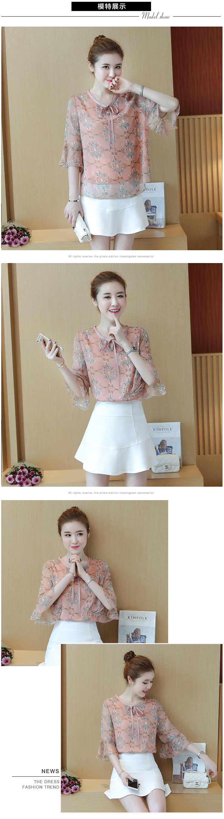 实拍2021夏新款雪纺衫时尚甜美蝴蝶结喇叭袖花色五分袖小衫