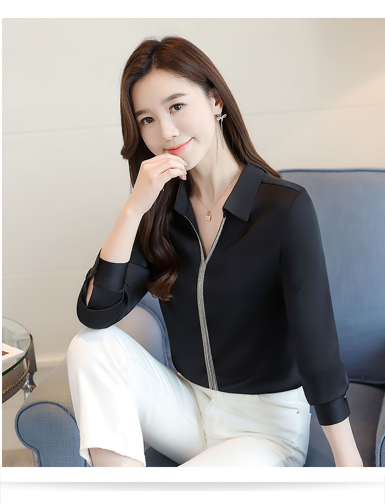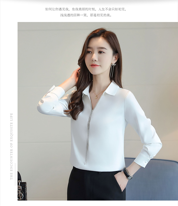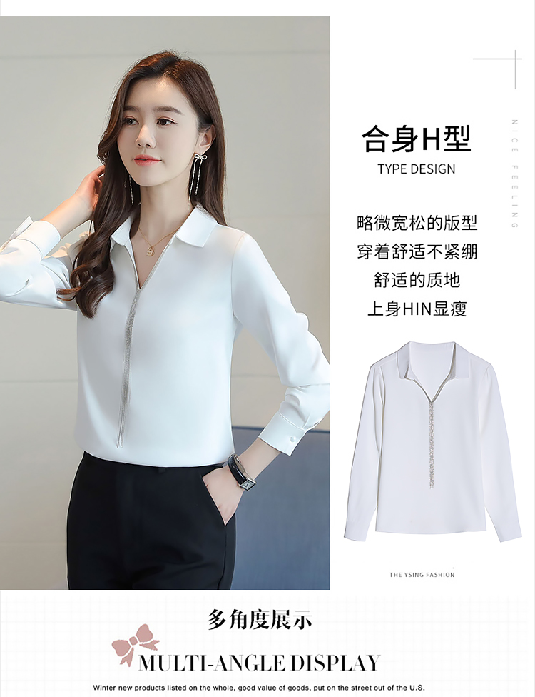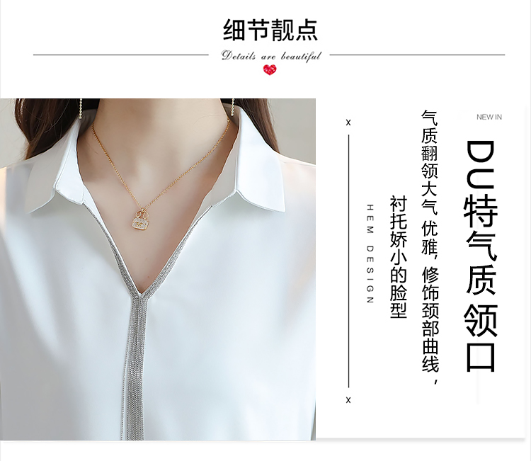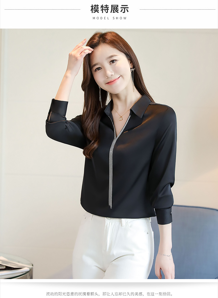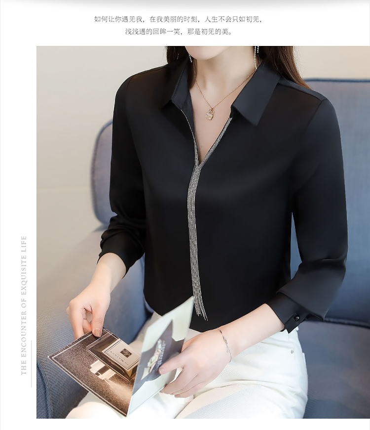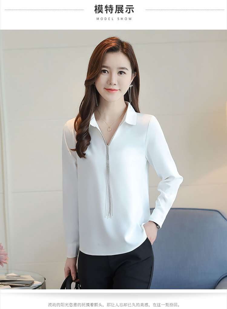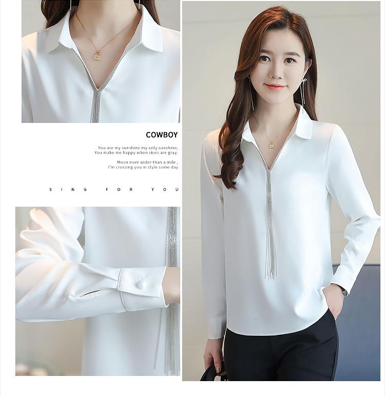 实拍春装新款长袖简约缎面V领纯色流苏职业衬衣通勤百搭小衫