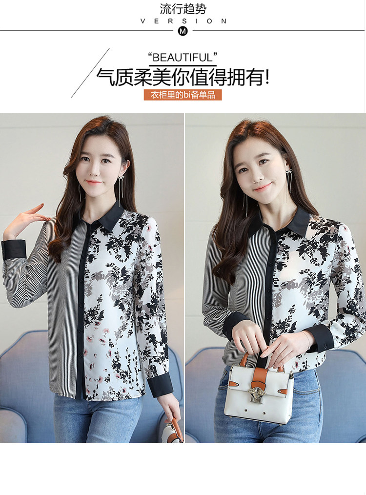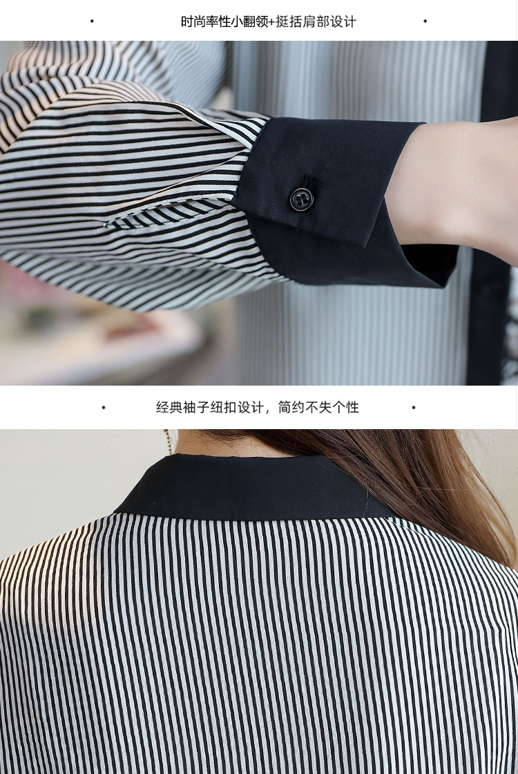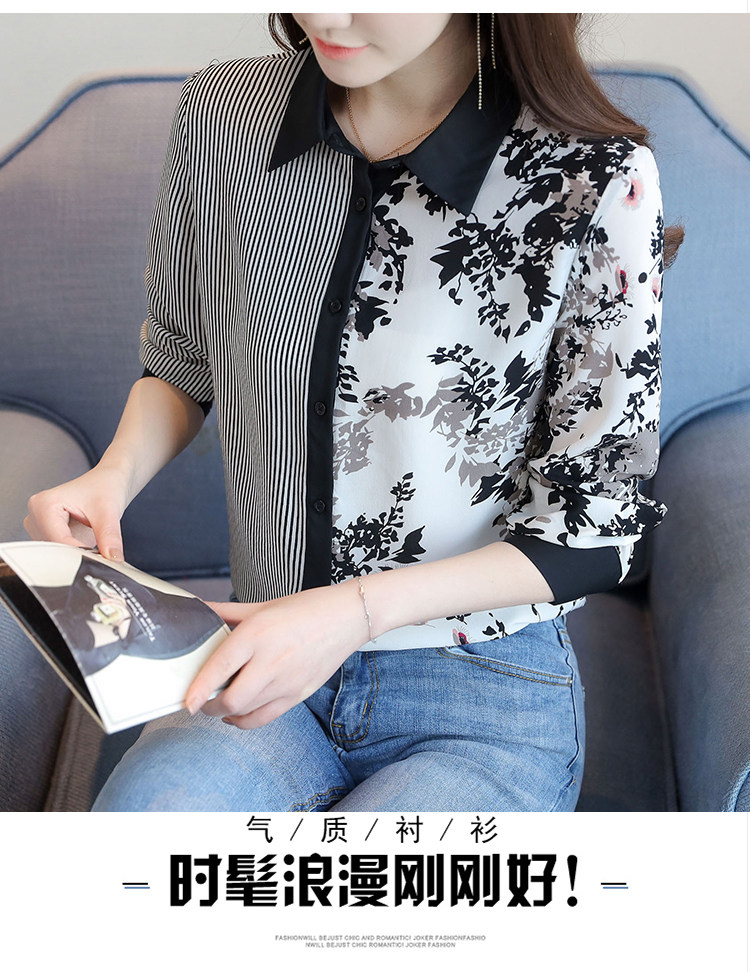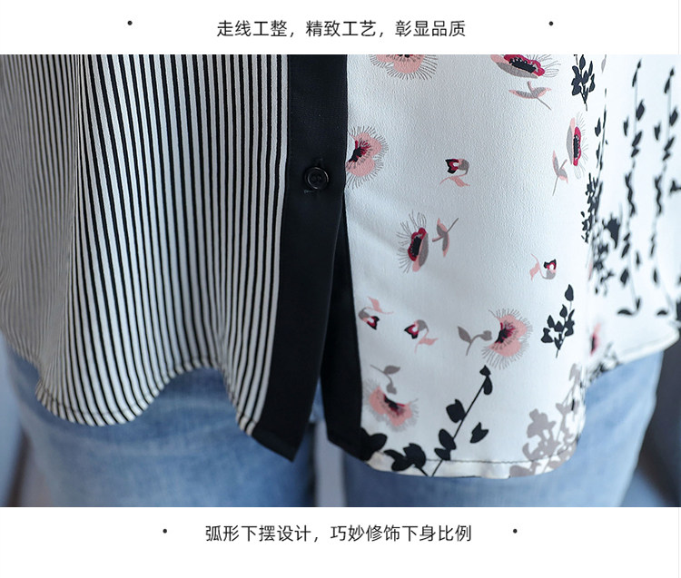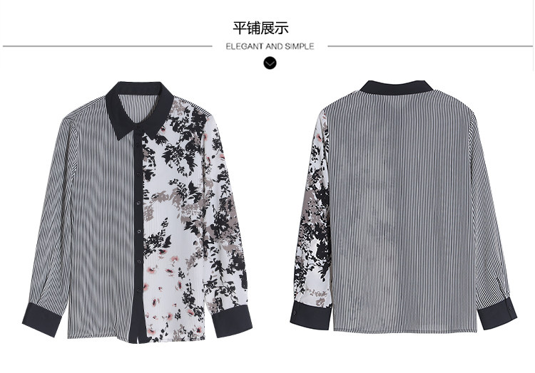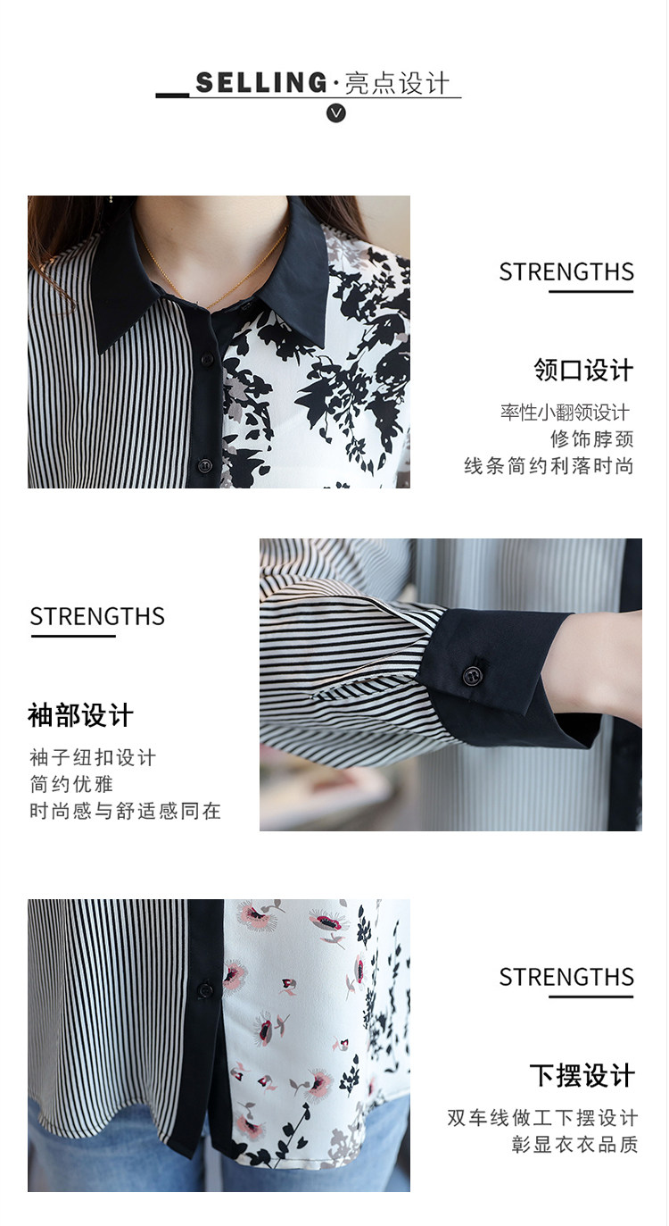 实拍2021春款花色雪纺长袖欧货条纹拼接撞色百搭衬衣打底衫