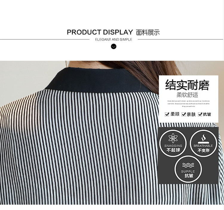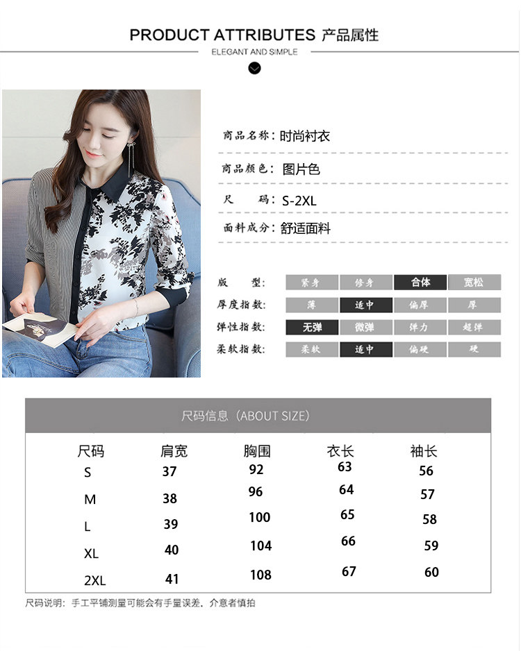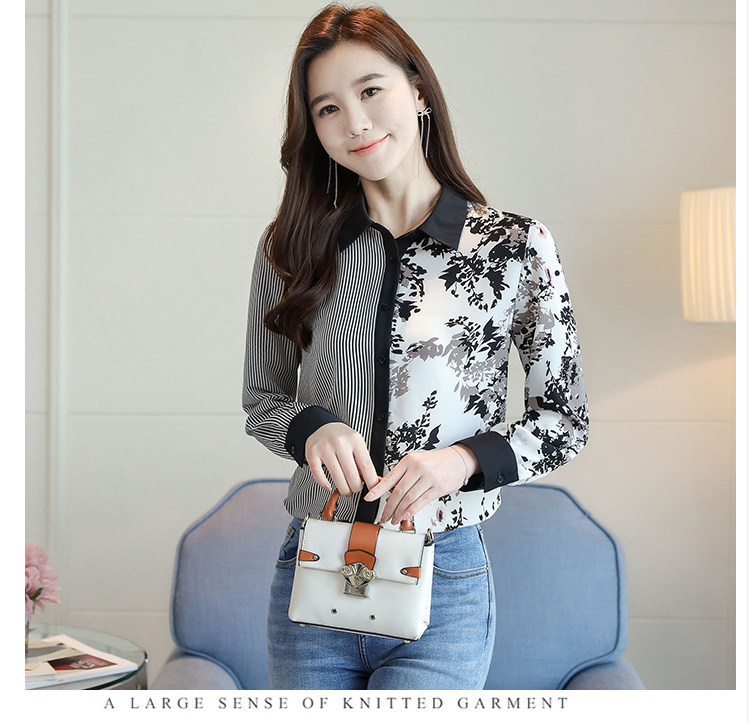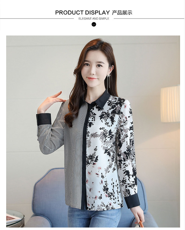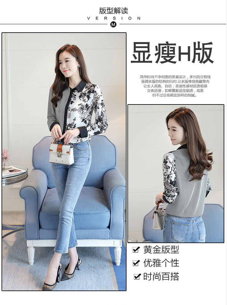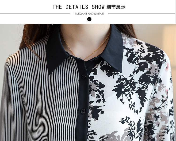 实拍2021春款花色雪纺长袖欧货条纹拼接撞色百搭衬衣打底衫