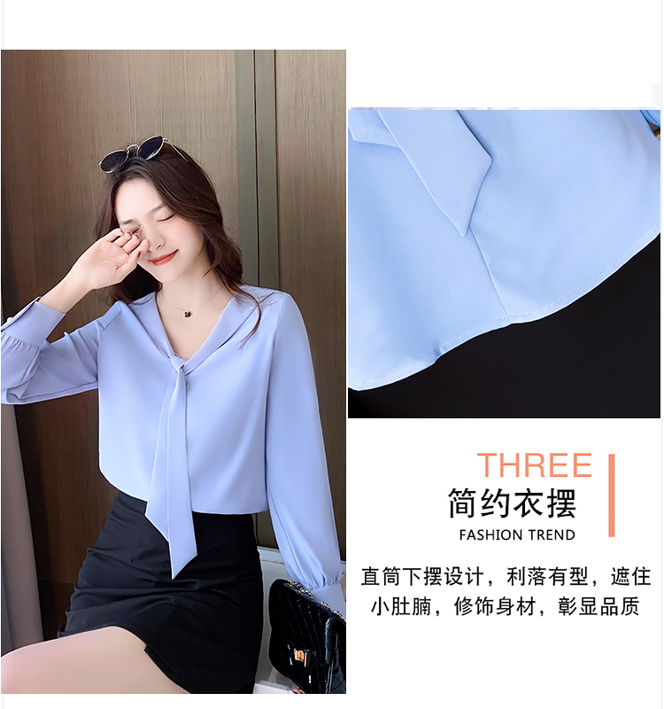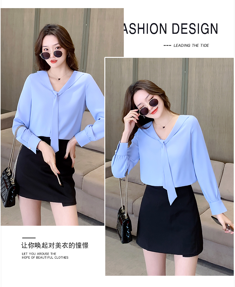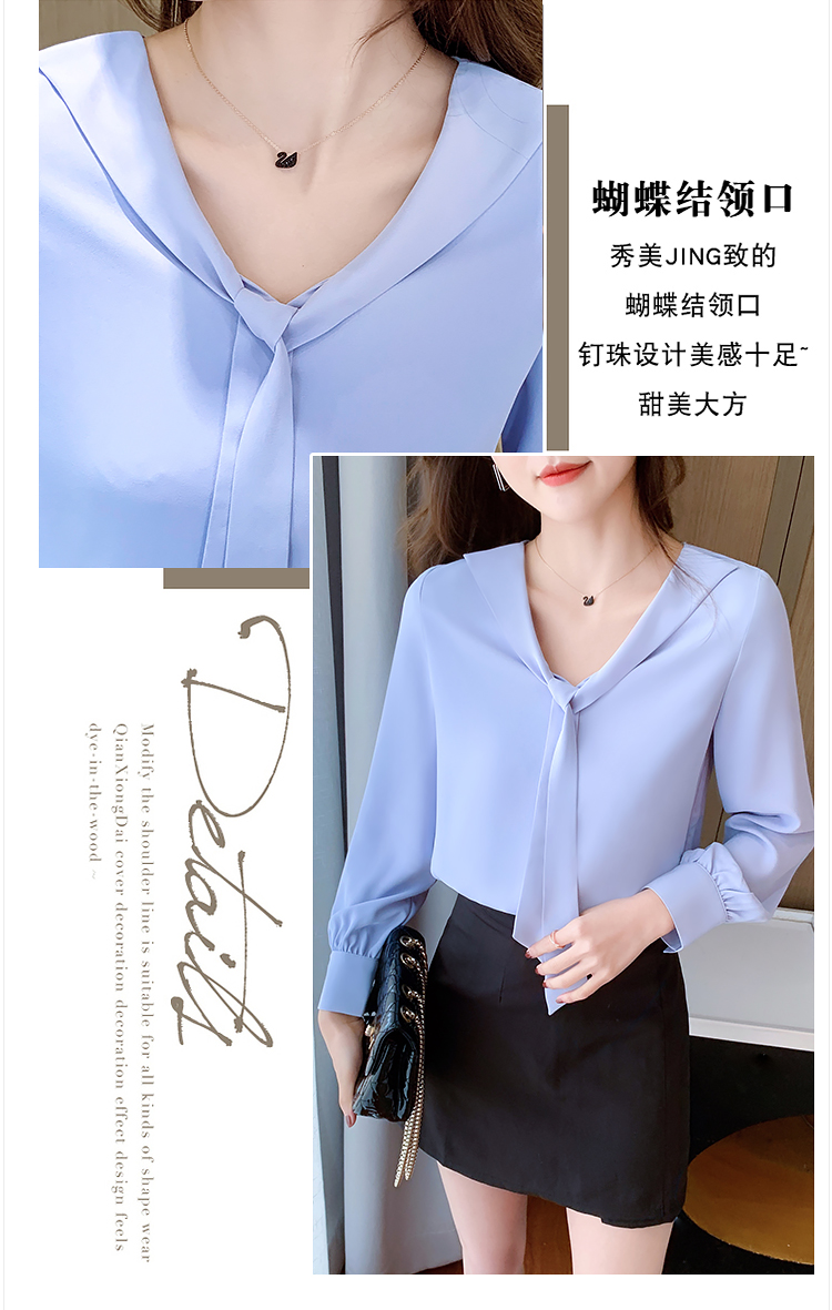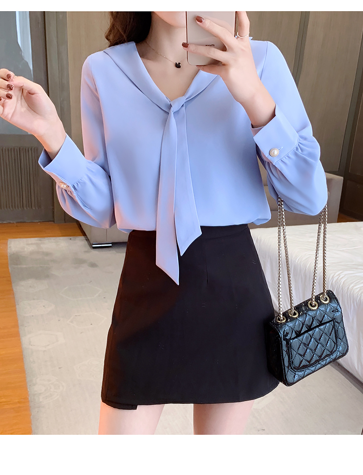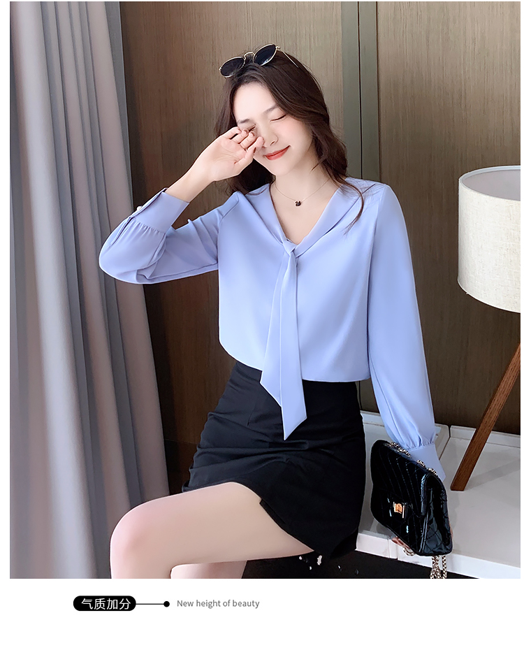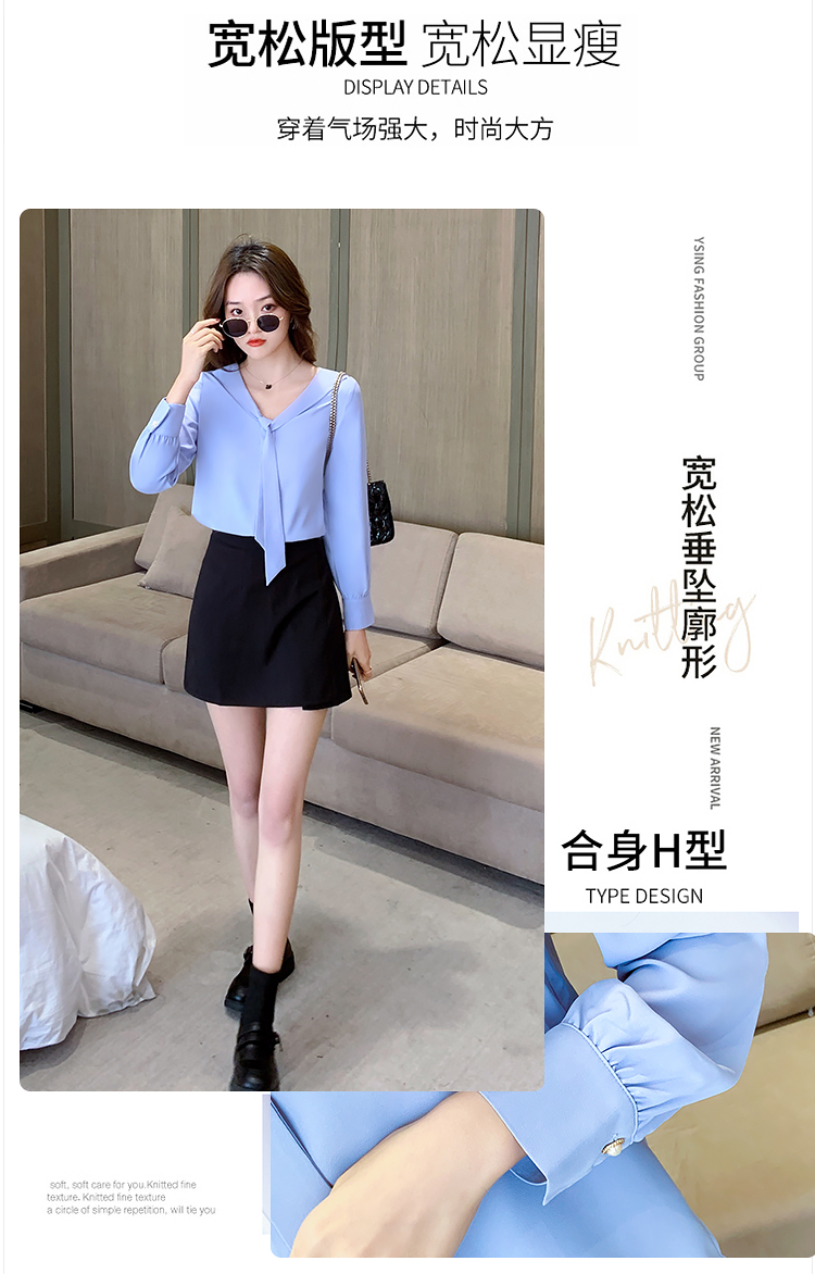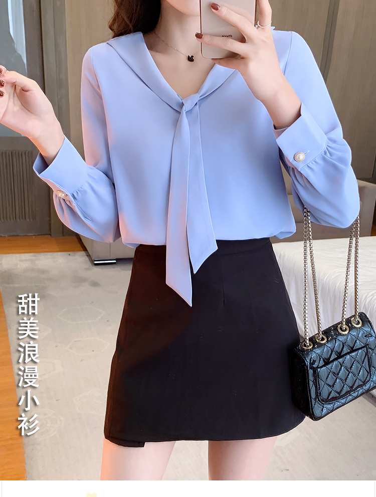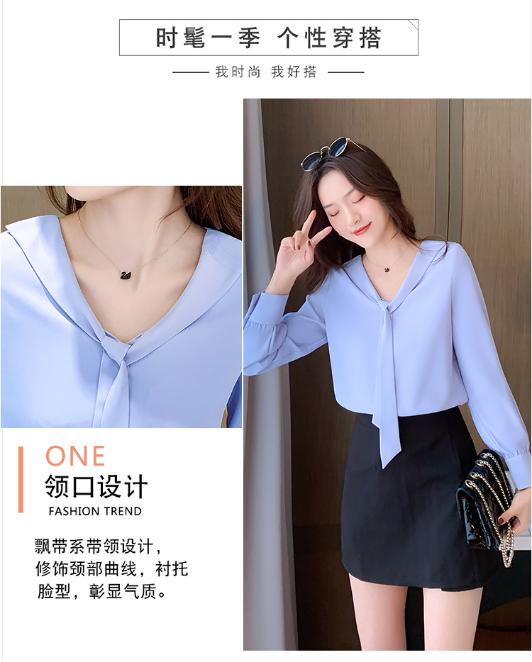 实拍蓝色雪纺衫2021春季新款飘带通勤OL设计感小众长袖上衣