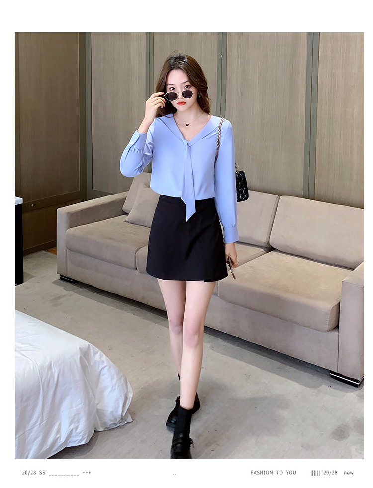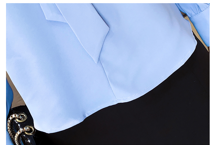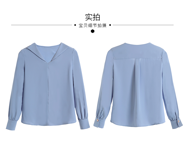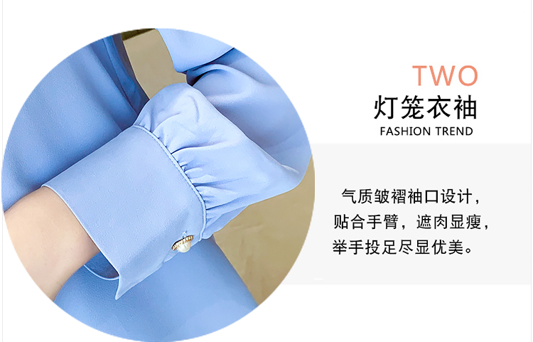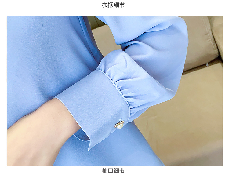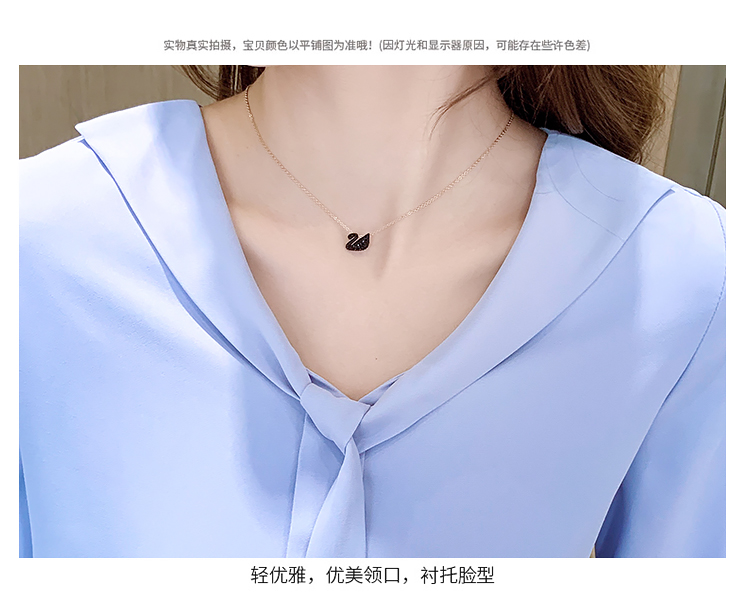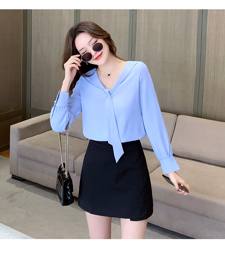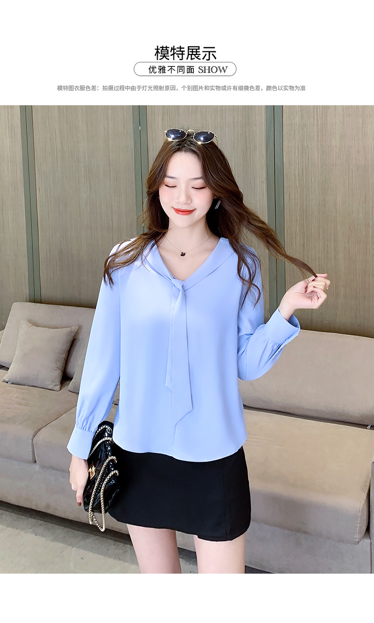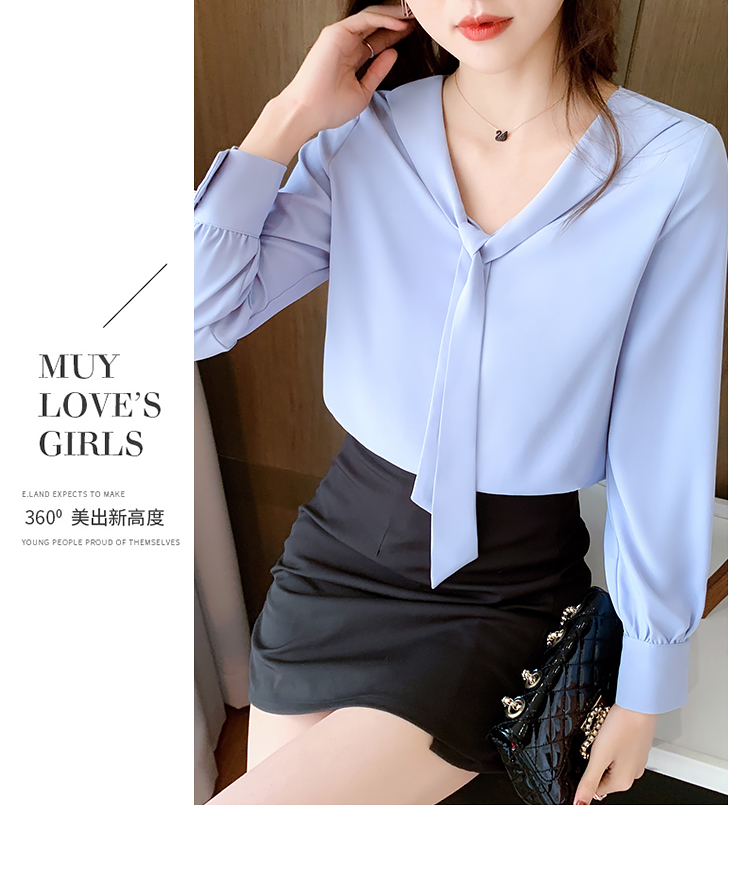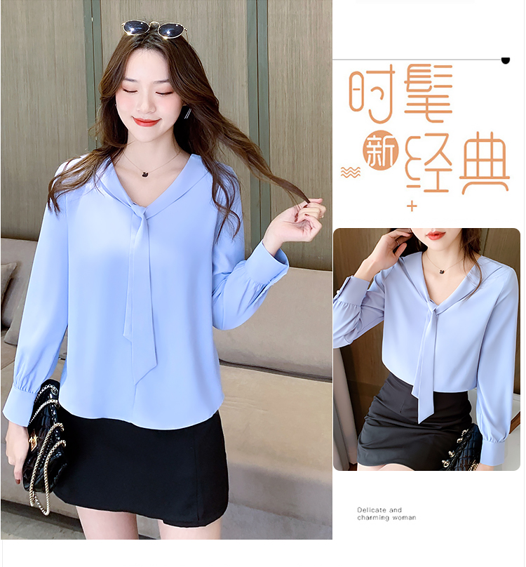 实拍蓝色雪纺衫2021春季新款飘带通勤OL设计感小众长袖上衣