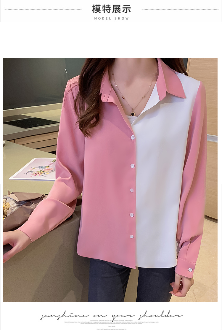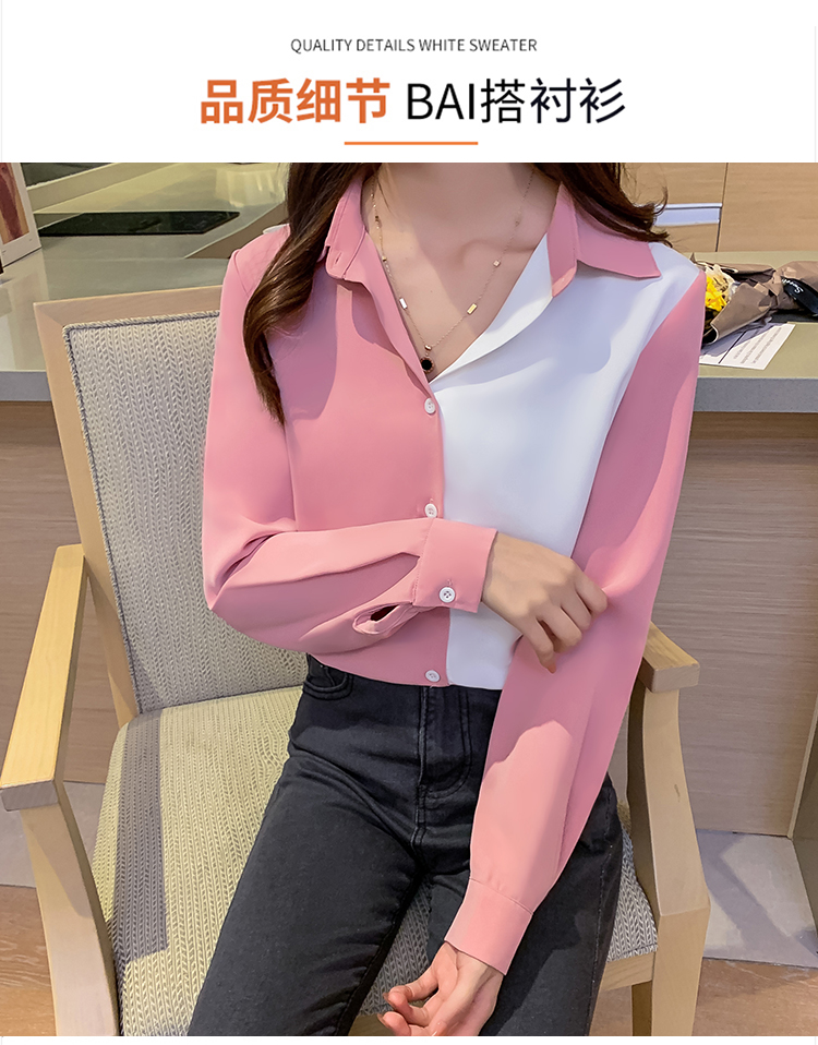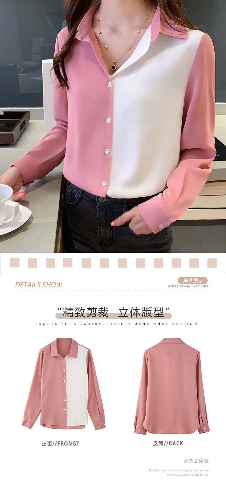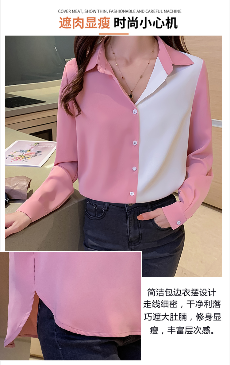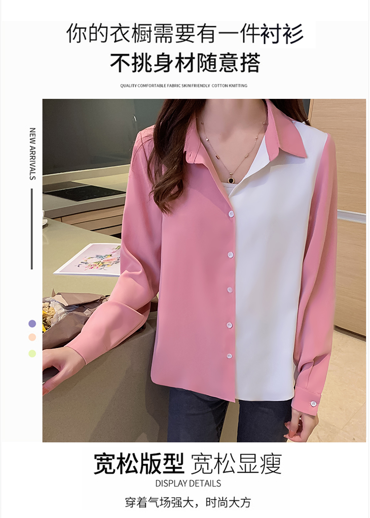 实拍2021春装新款长袖简约拼接撞色雪纺衫时尚百搭欧货上衣