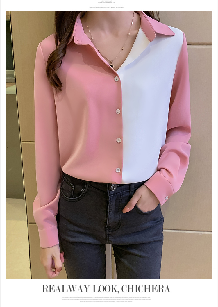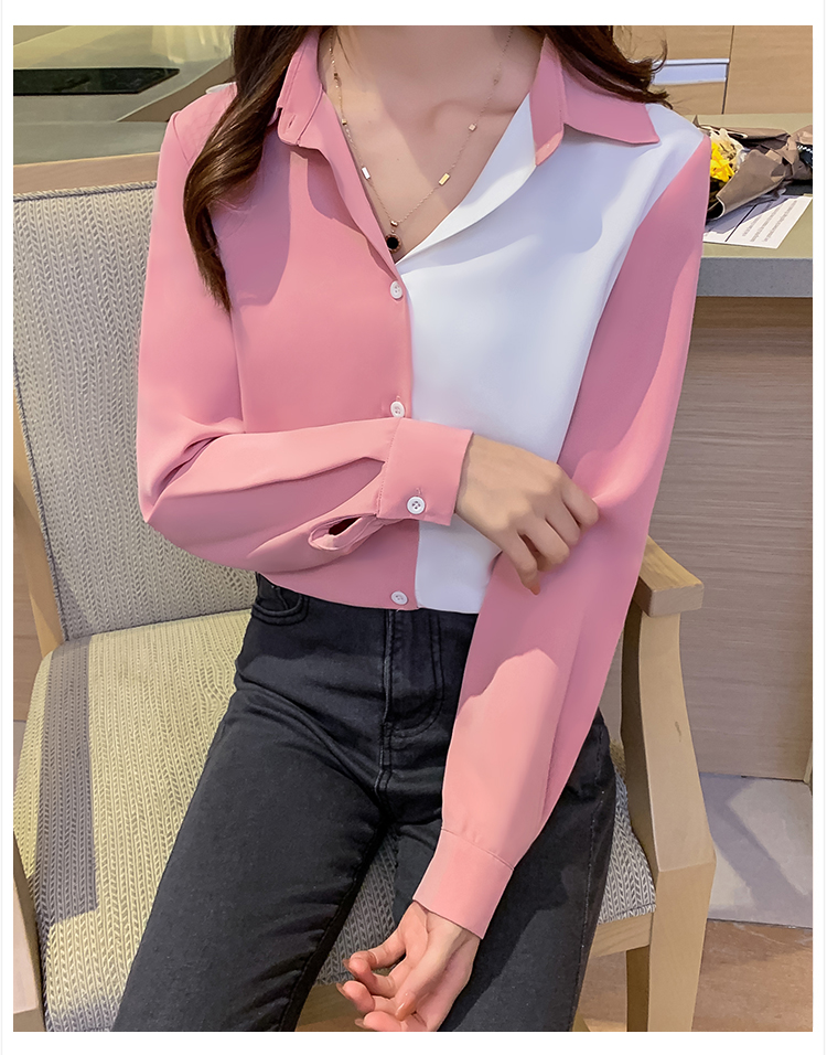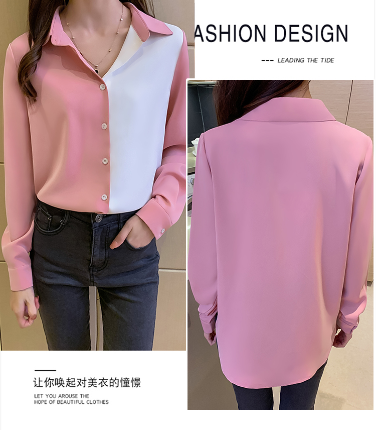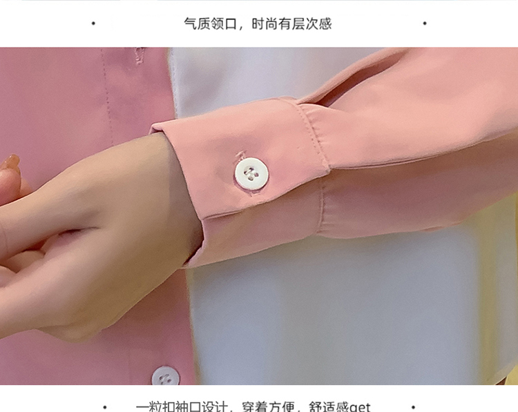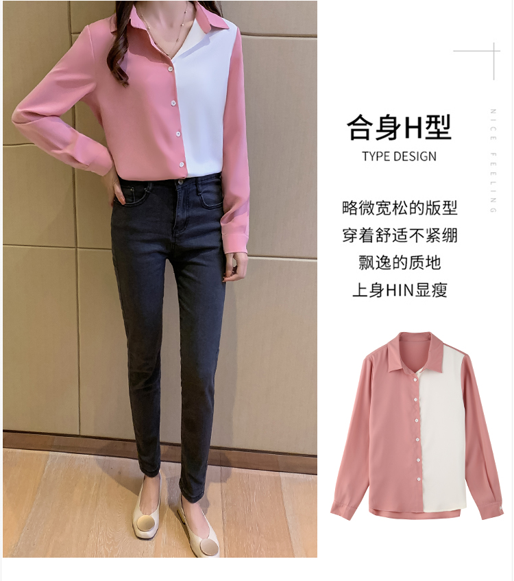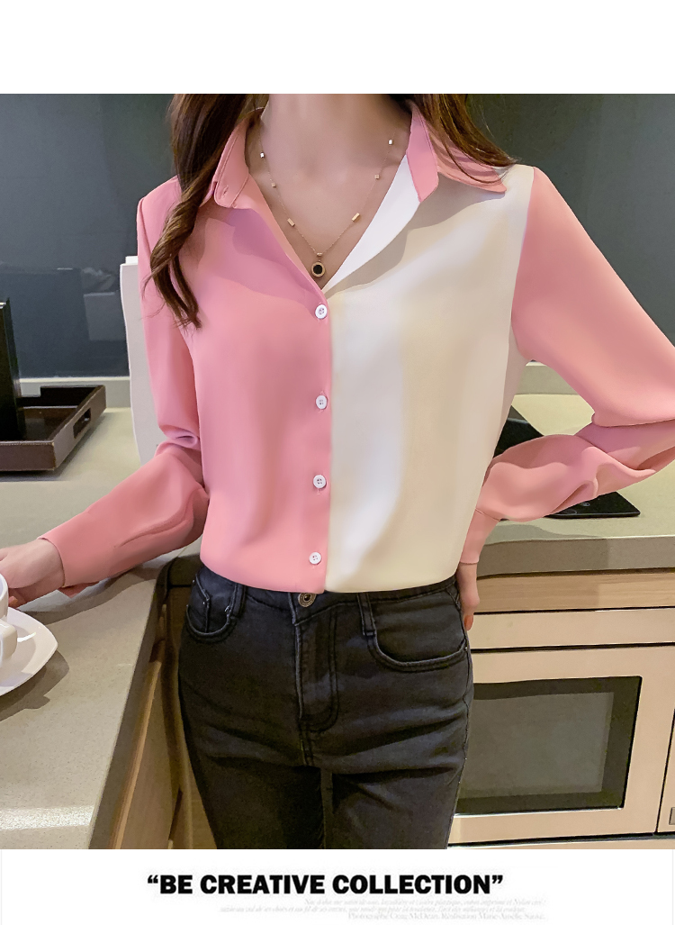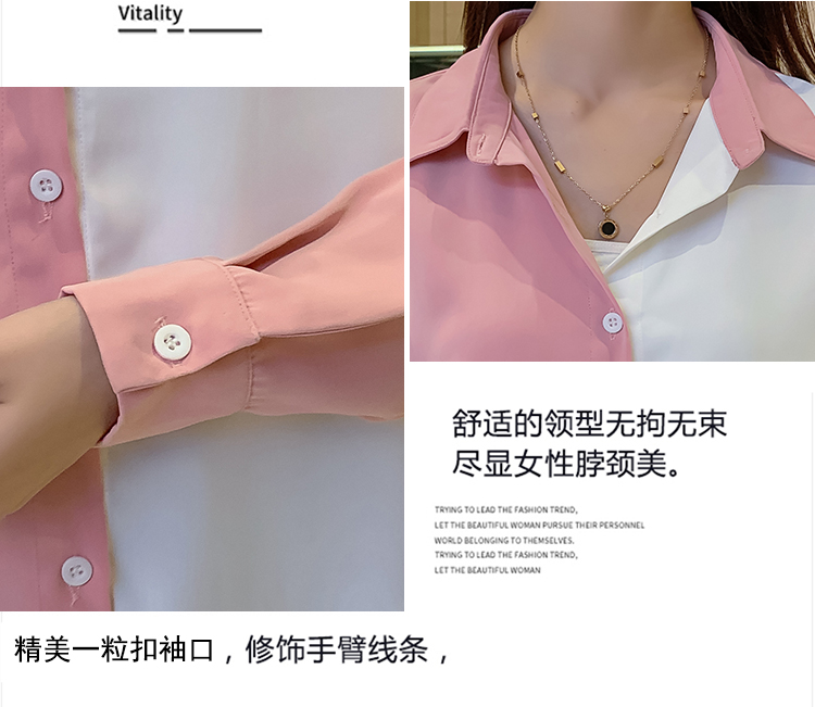 实拍2021春装新款长袖简约拼接撞色雪纺衫时尚百搭欧货上衣