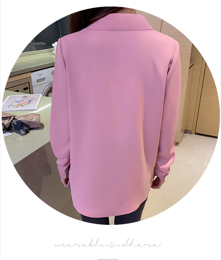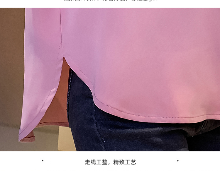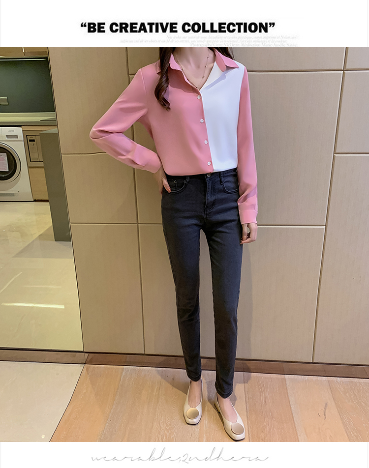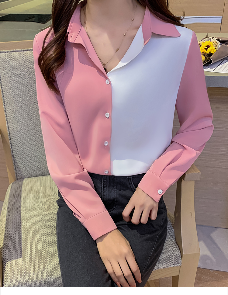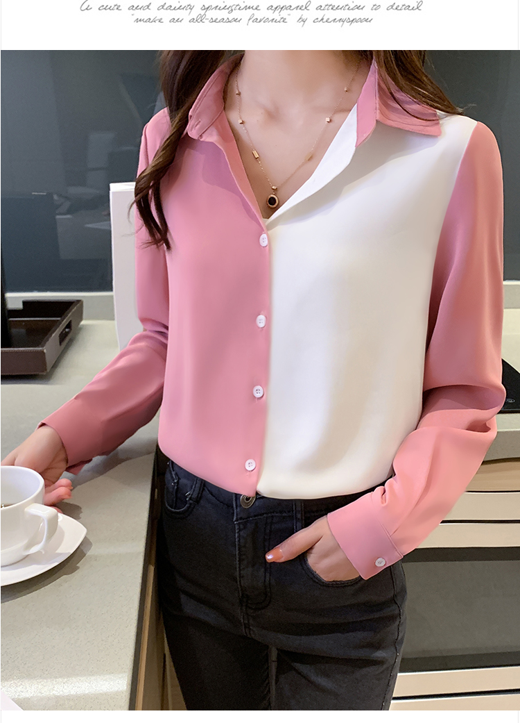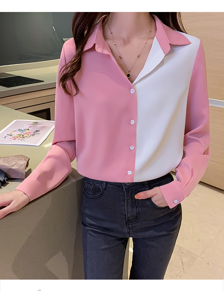 实拍2021春装新款长袖简约拼接撞色雪纺衫时尚百搭欧货上衣