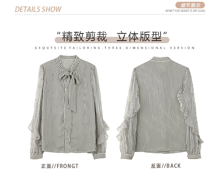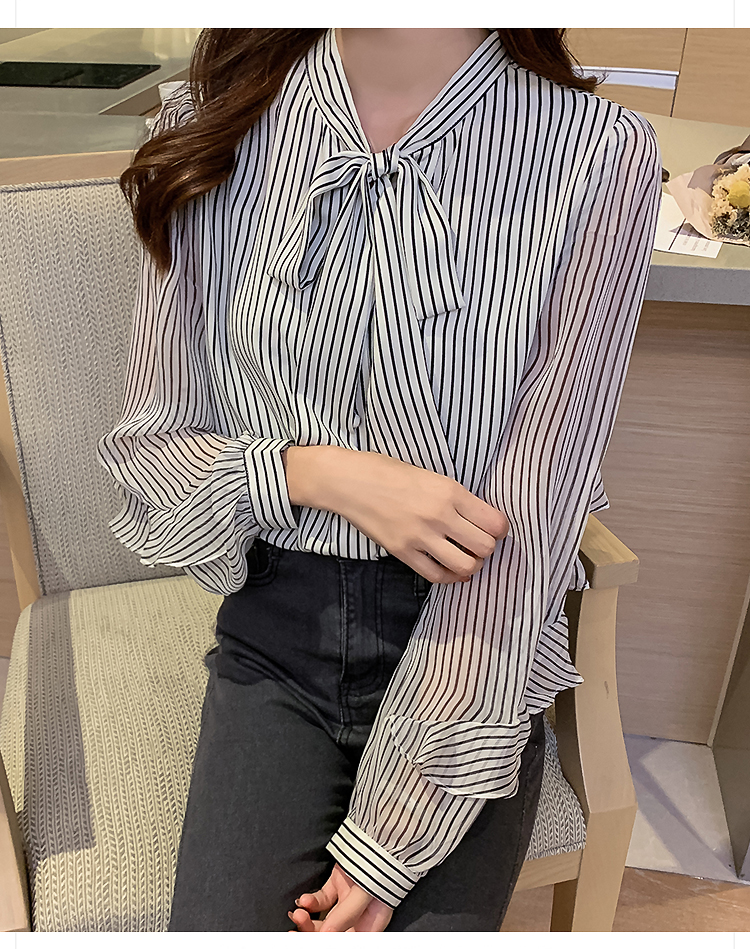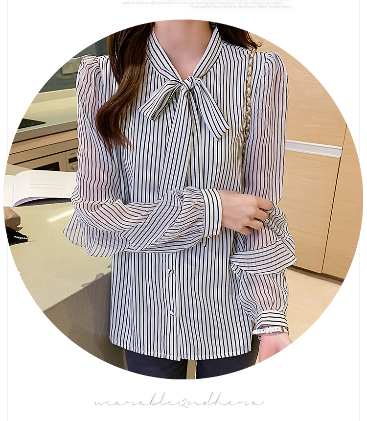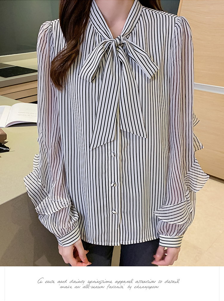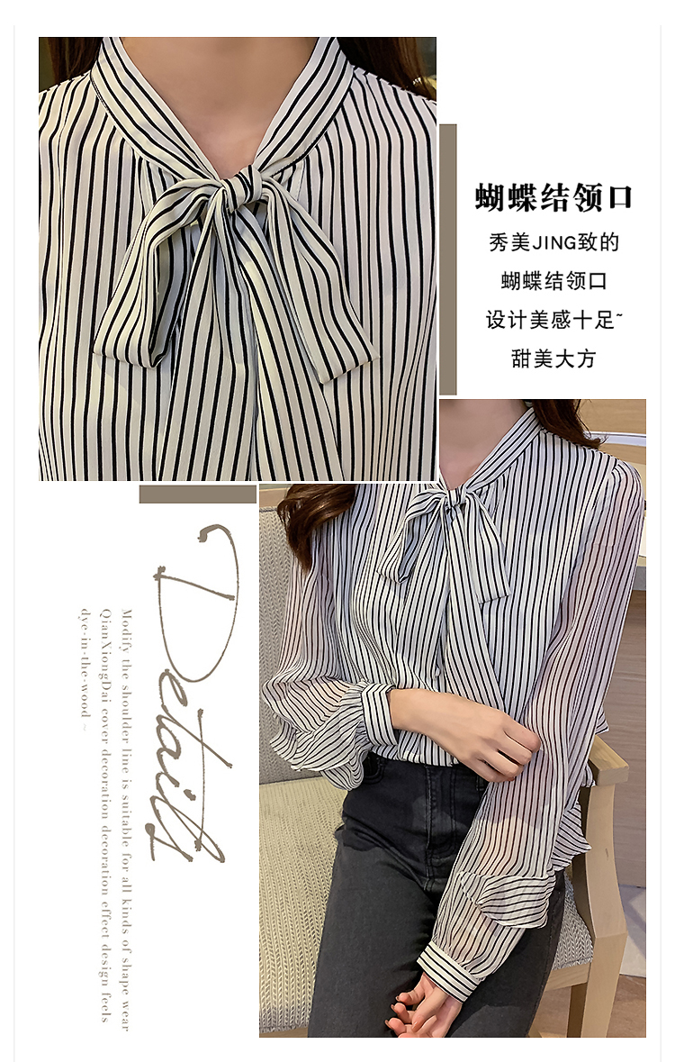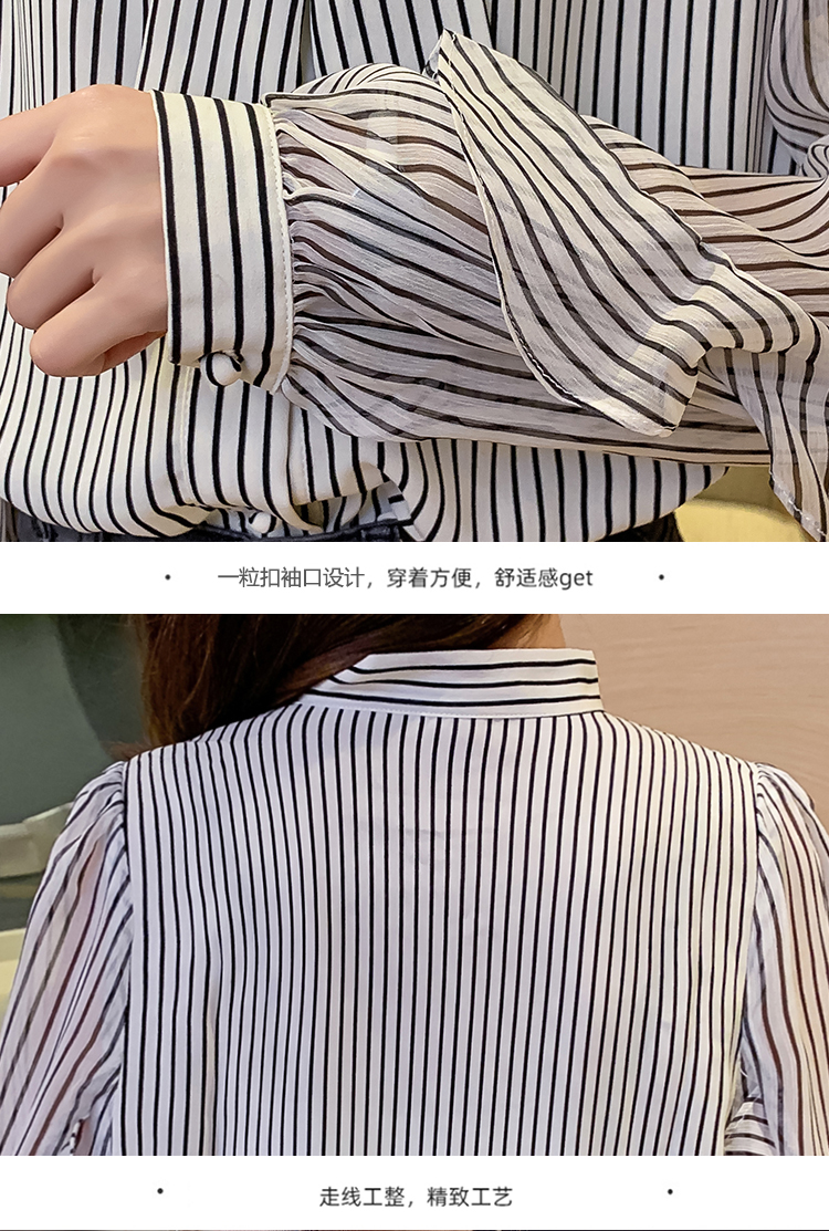 实拍2021春装新款浪漫法式雪纺衫长袖荷叶边袖飘带竖条纹女