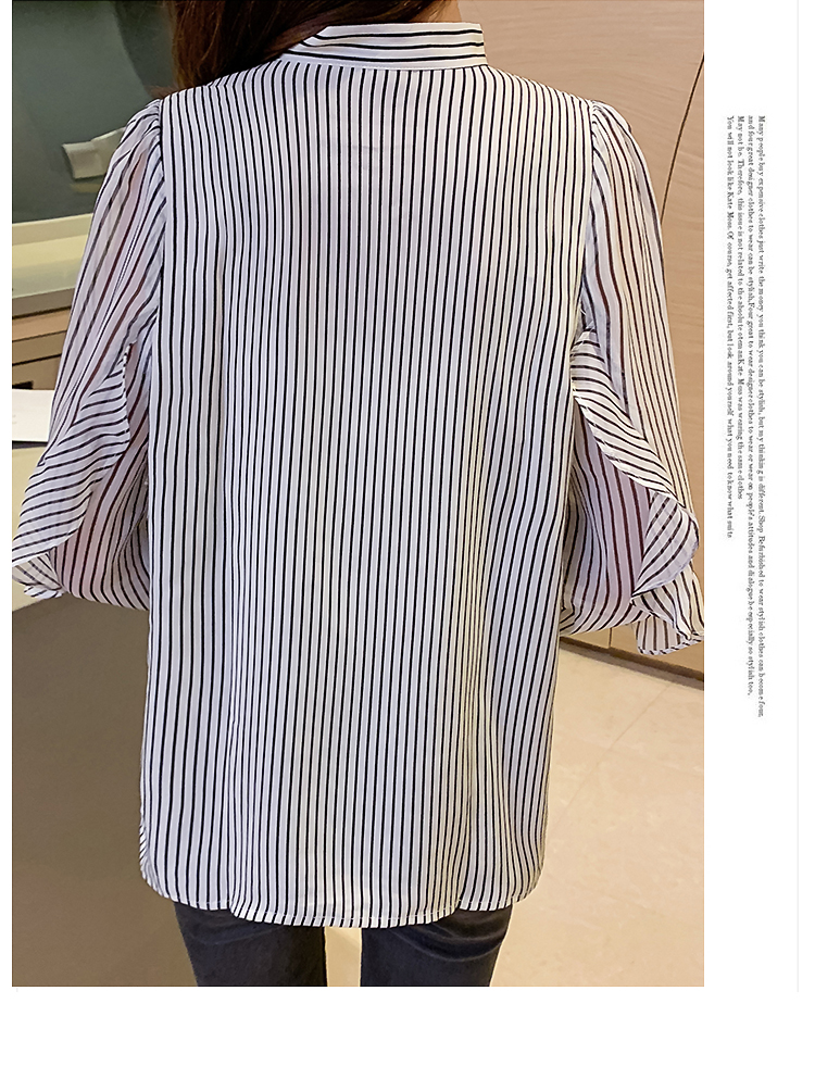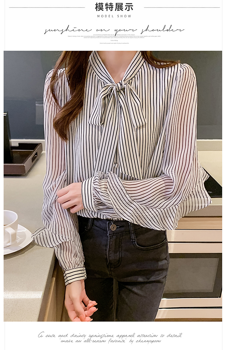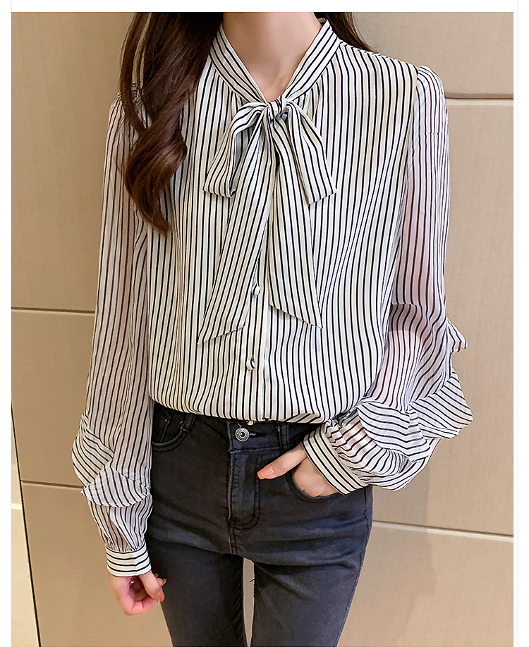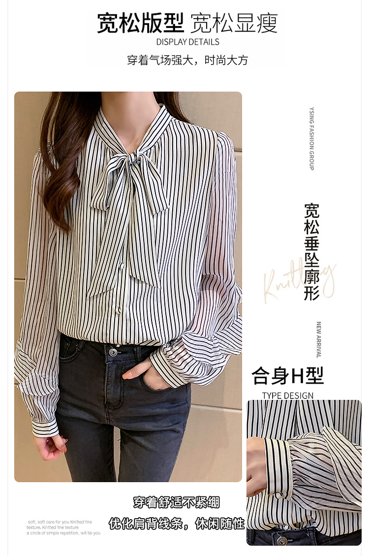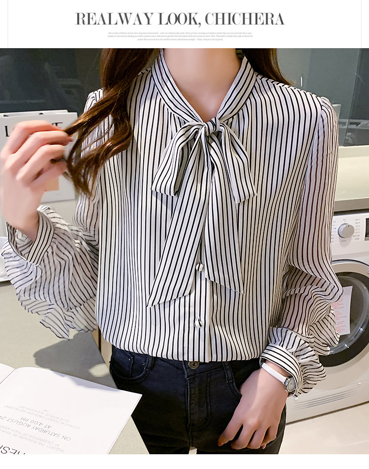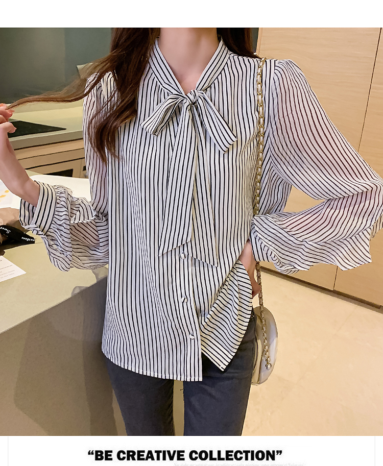 实拍2021春装新款浪漫法式雪纺衫长袖荷叶边袖飘带竖条纹女