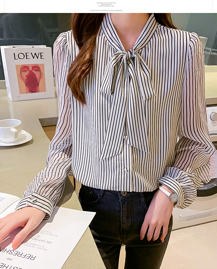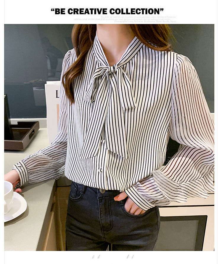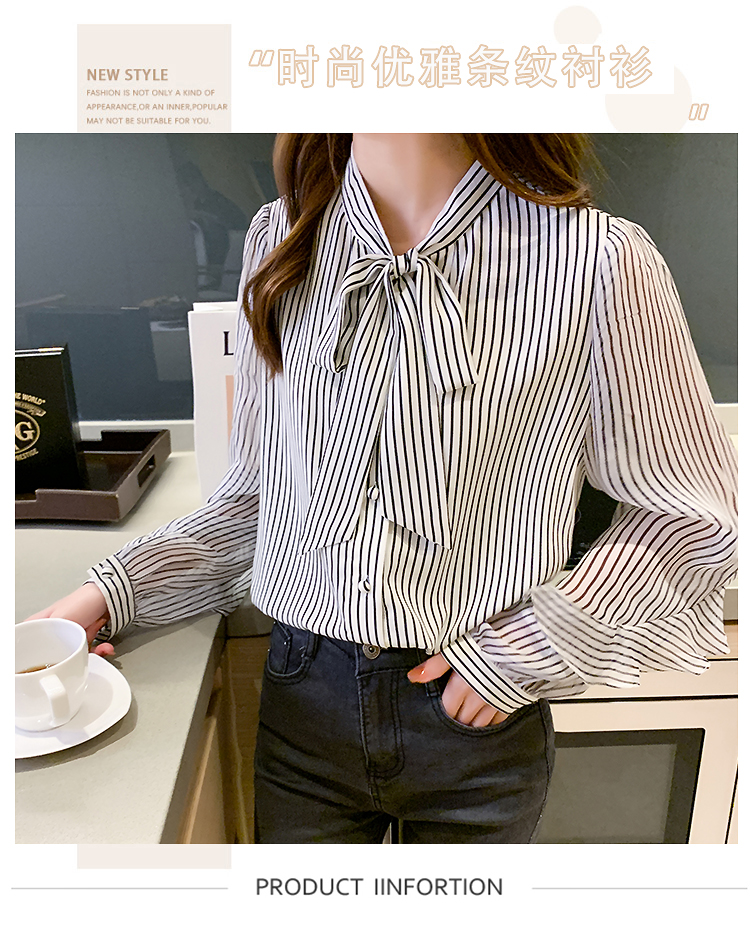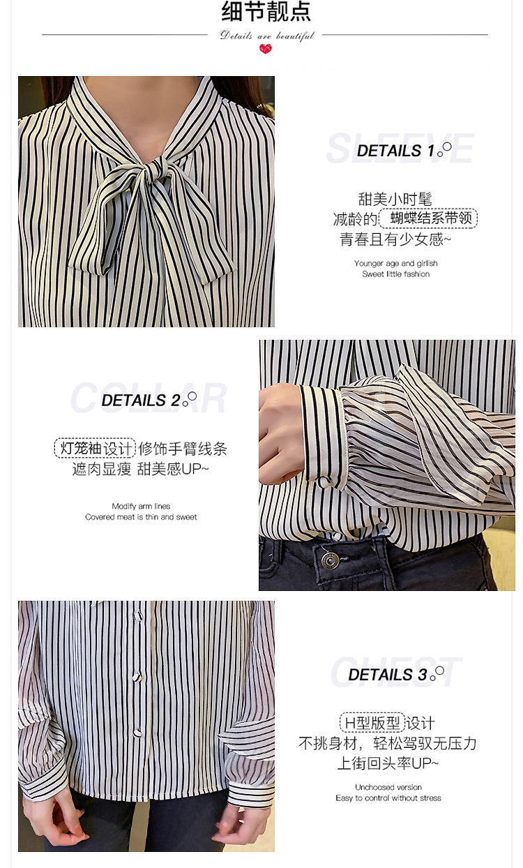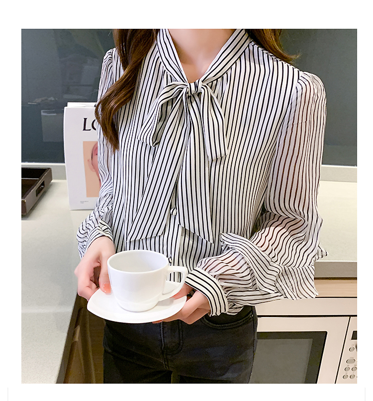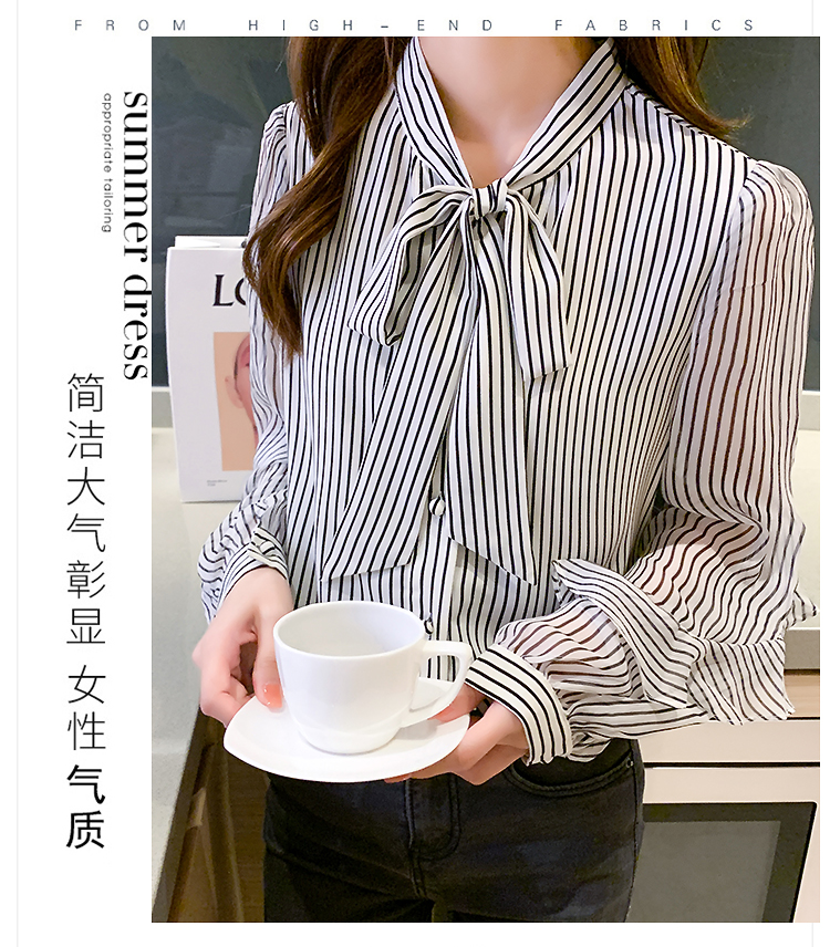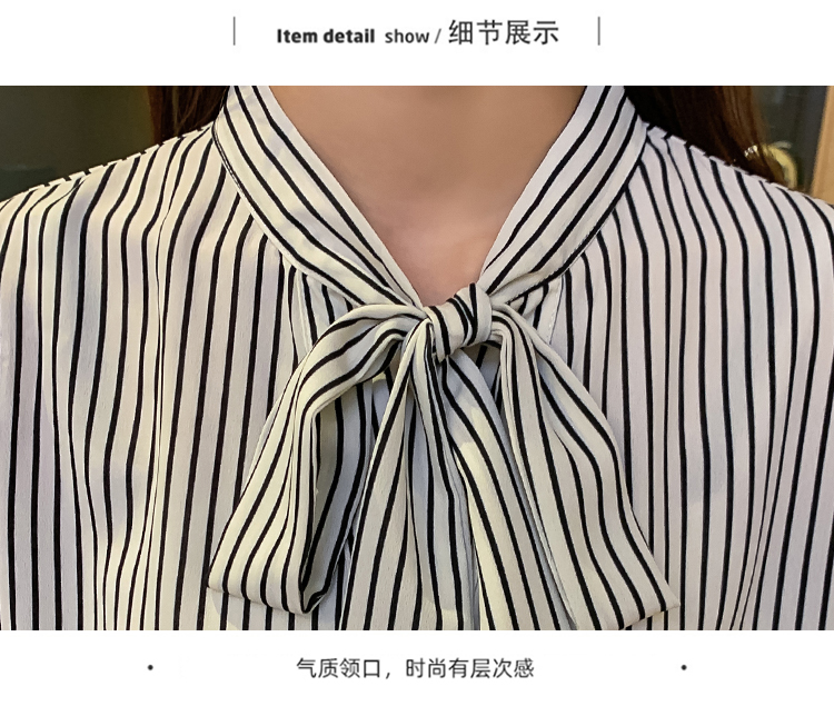 实拍2021春装新款浪漫法式雪纺衫长袖荷叶边袖飘带竖条纹女