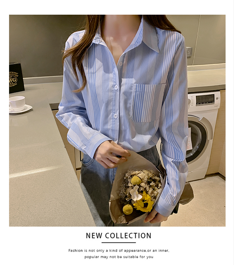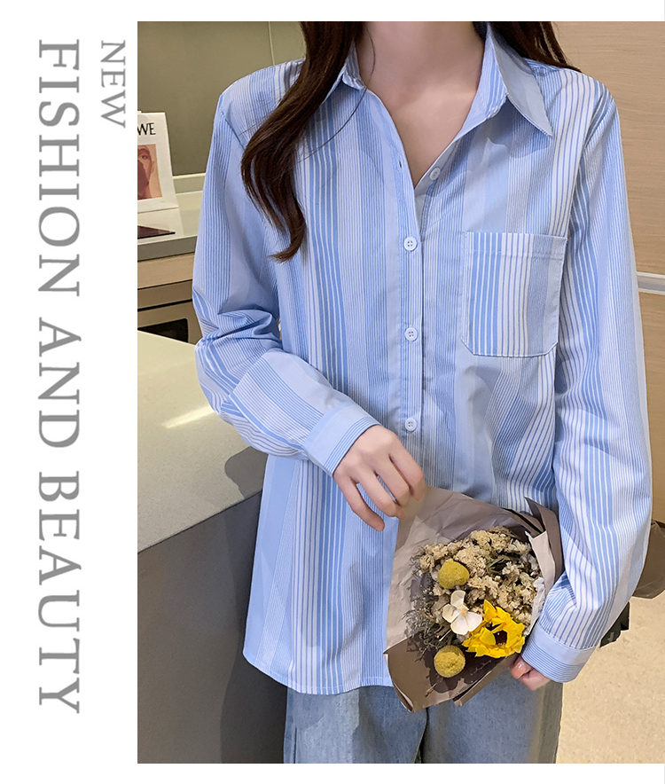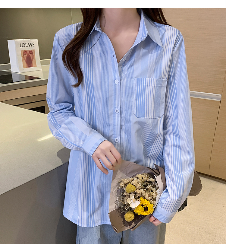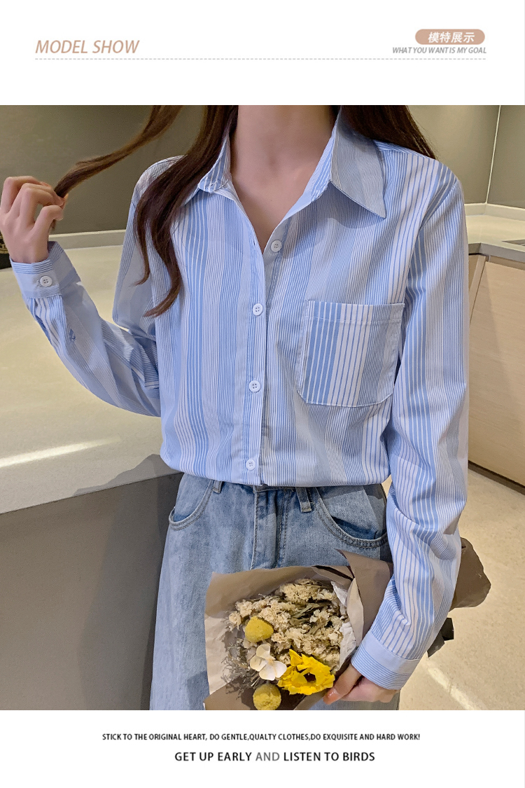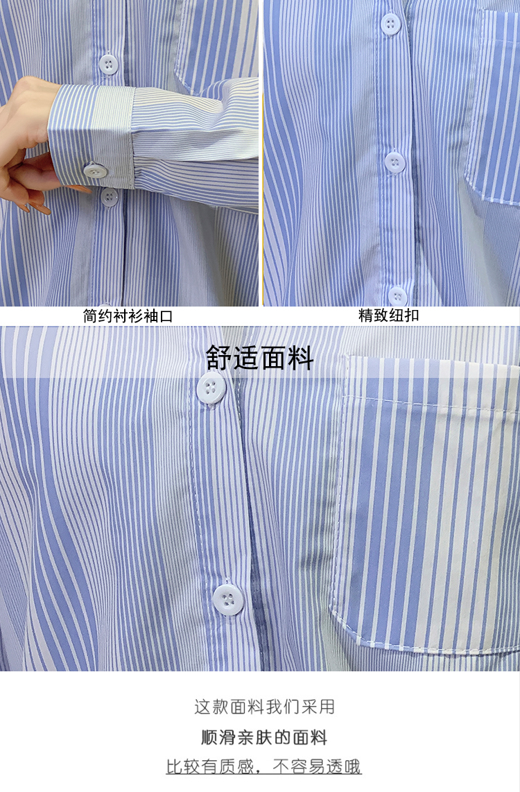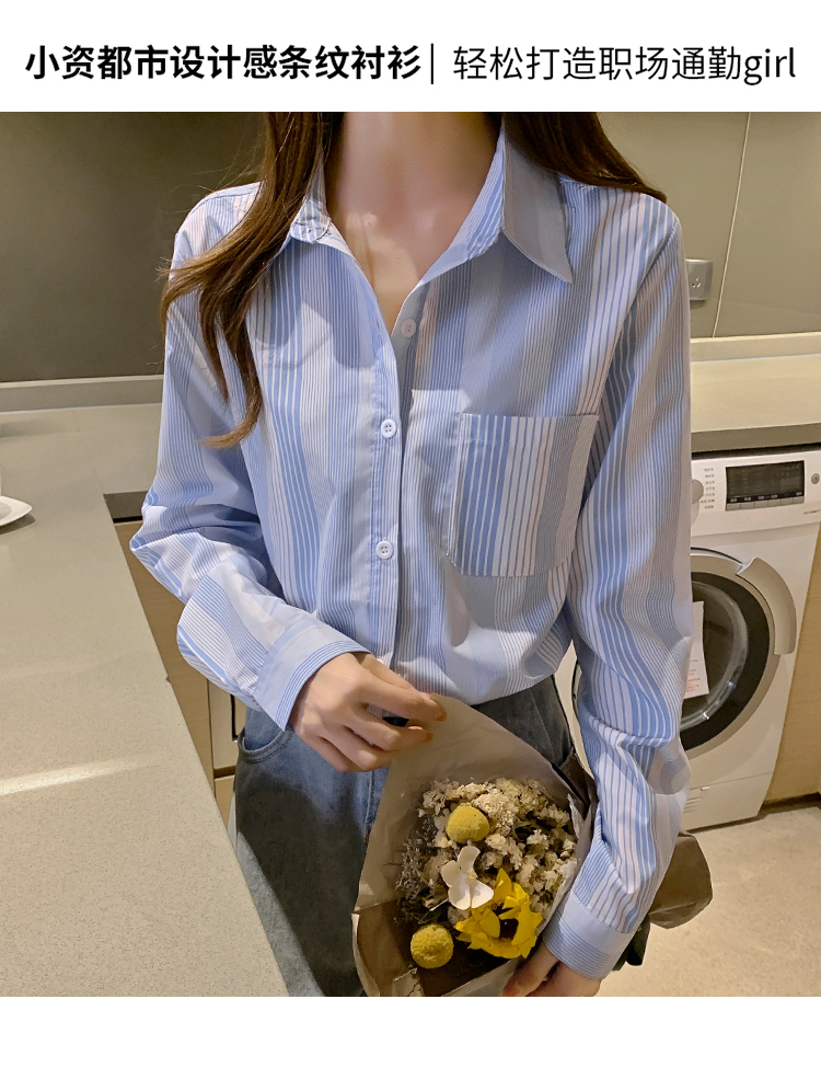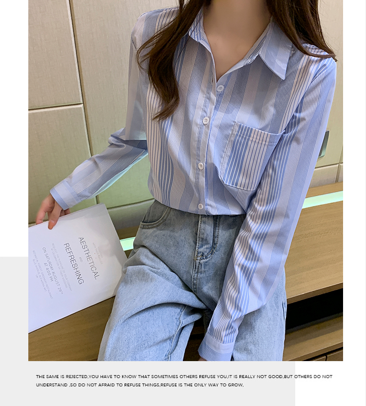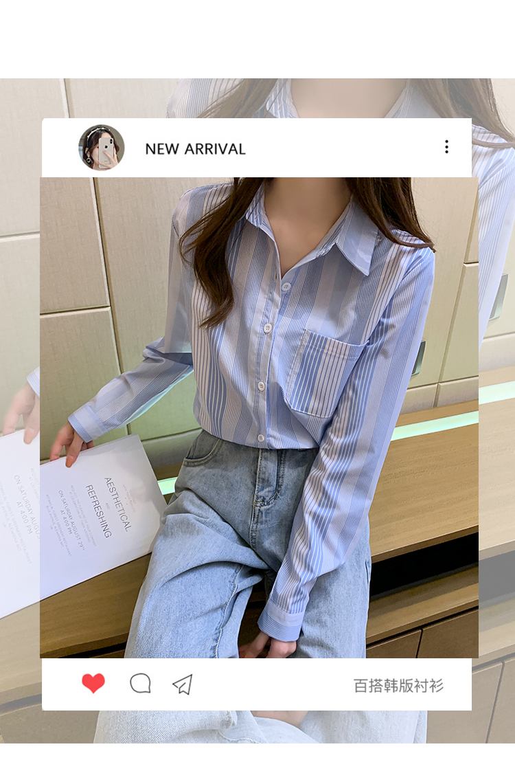 实拍2021春装新款蓝色条纹衬衫时尚韩版简约百搭衬衣小衫女