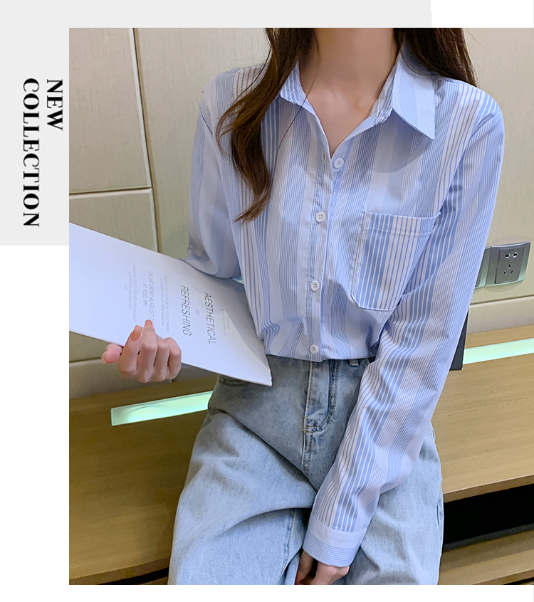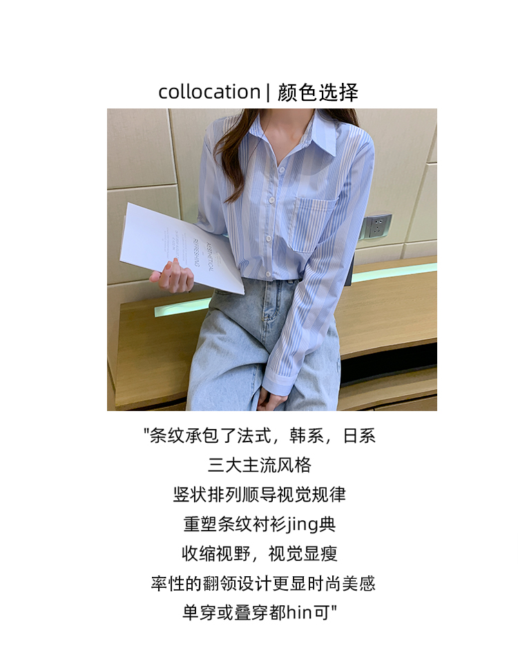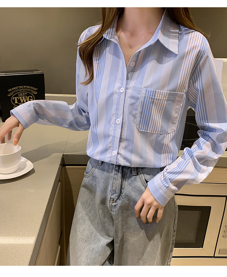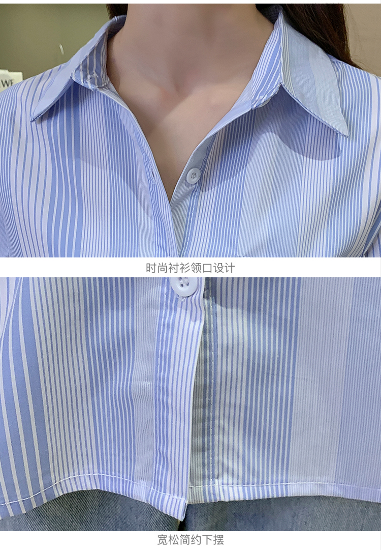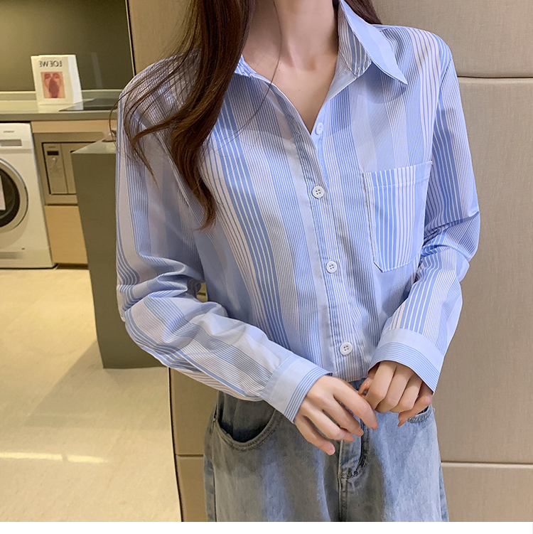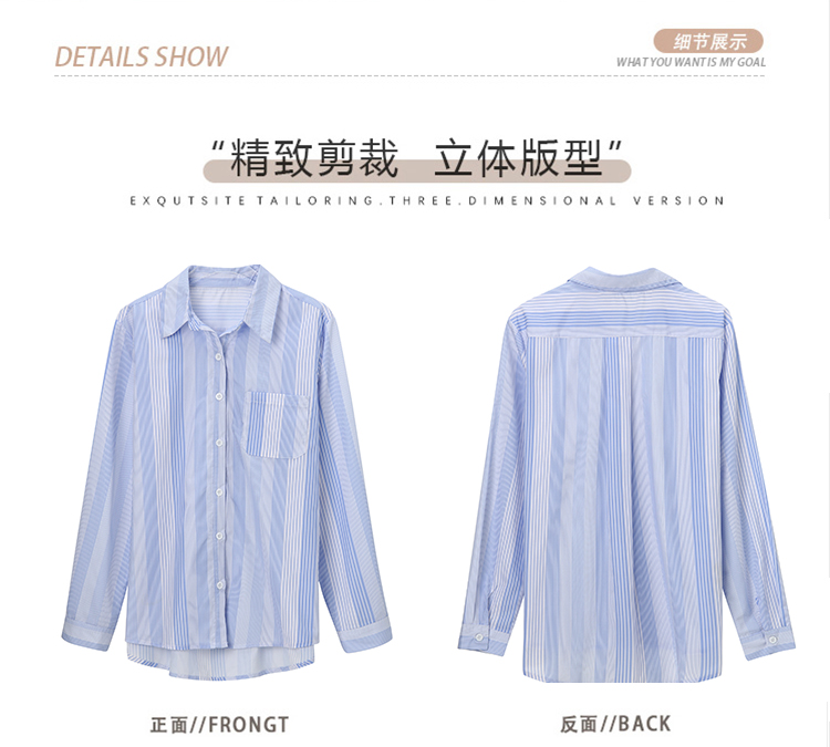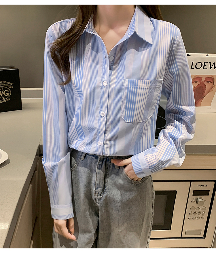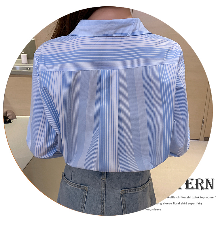 实拍2021春装新款蓝色条纹衬衫时尚韩版简约百搭衬衣小衫女