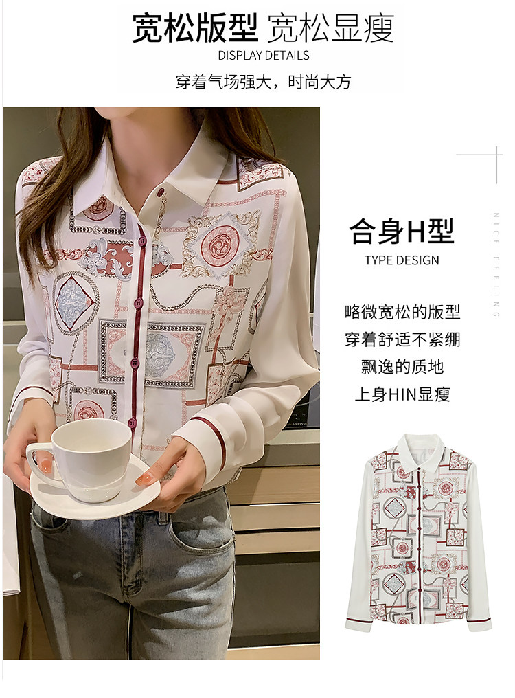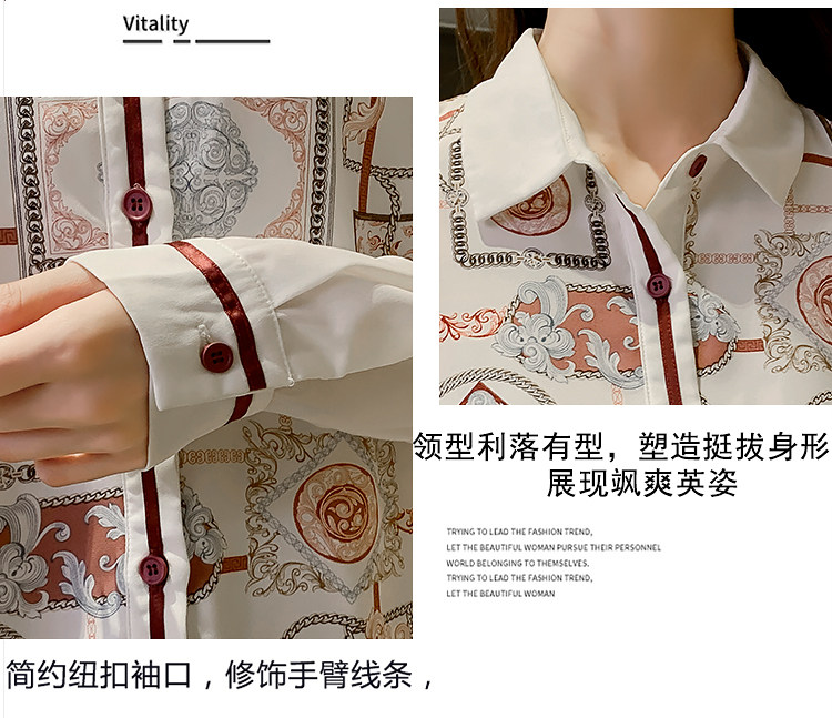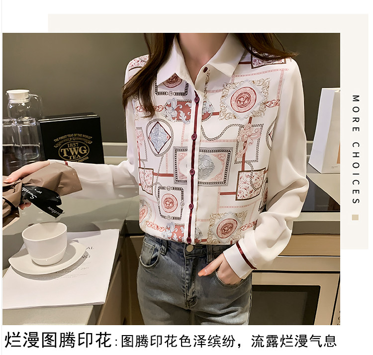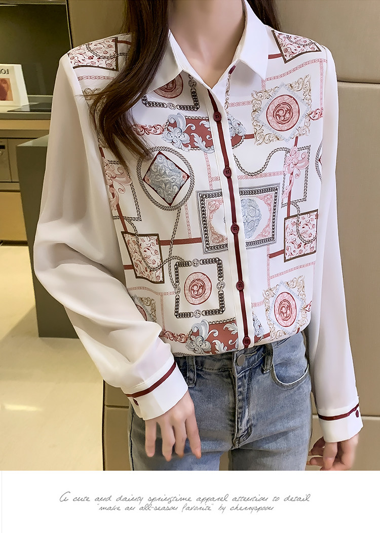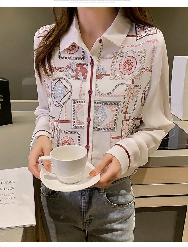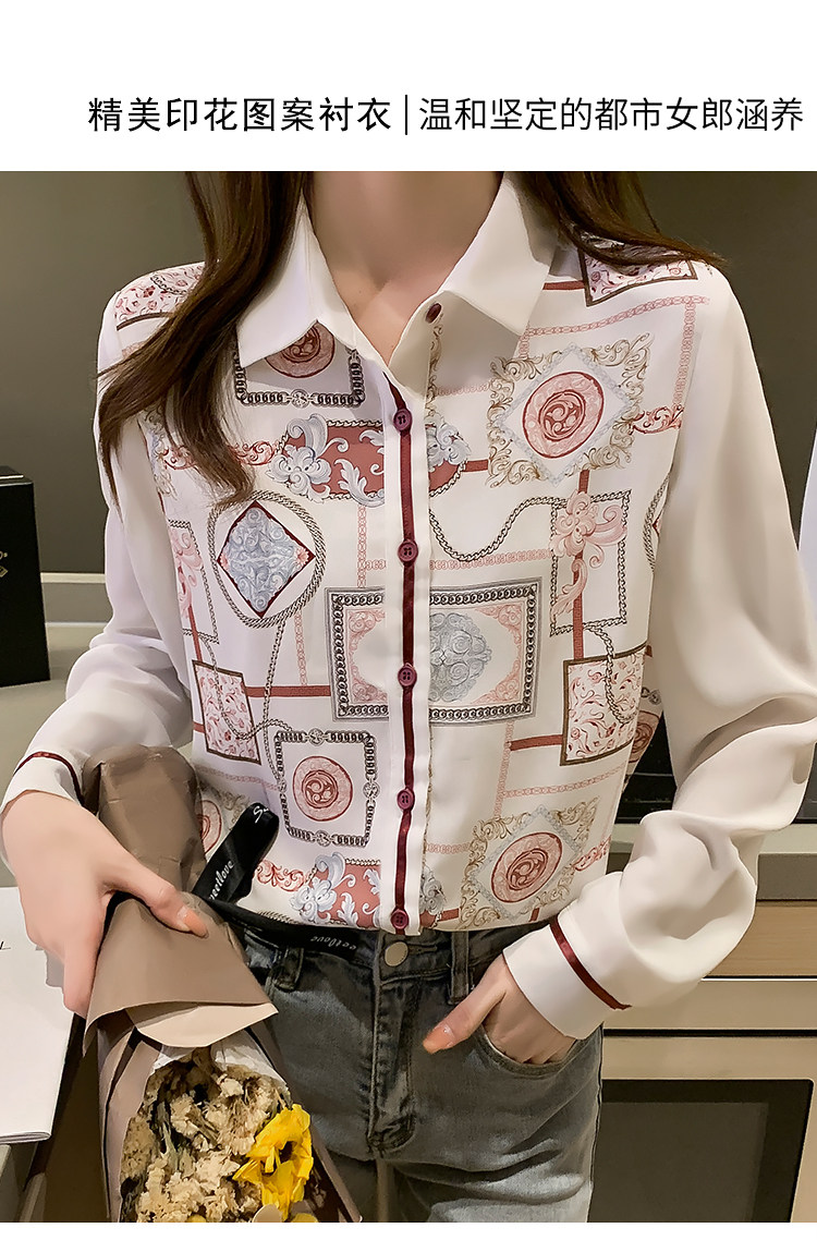 实拍2021春装新款复古Polo领显瘦印花长袖雪纺衫衬衫洋气小衫