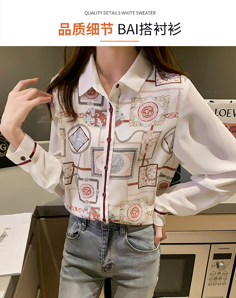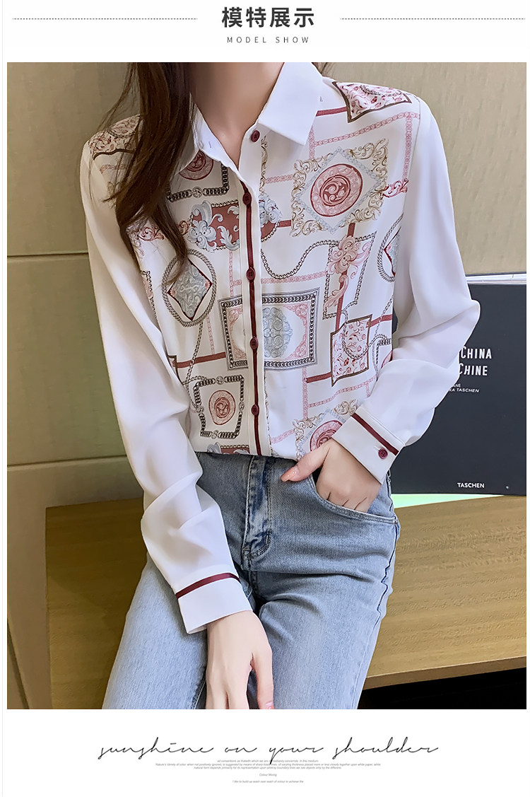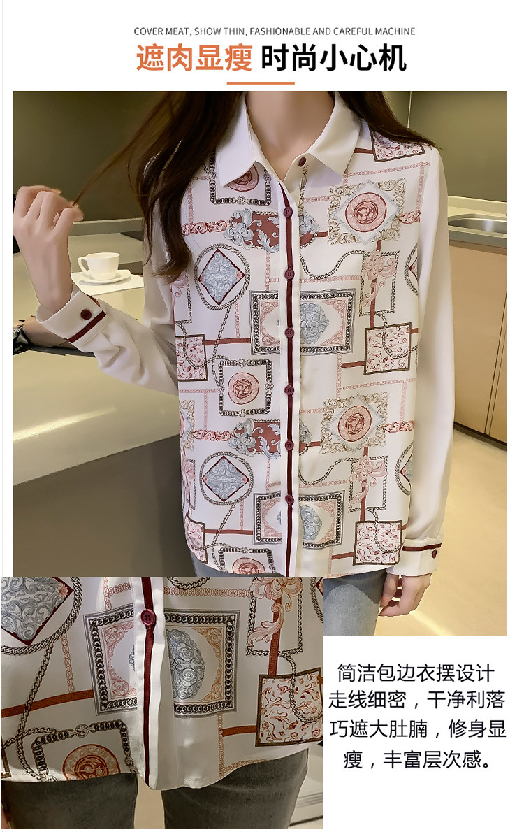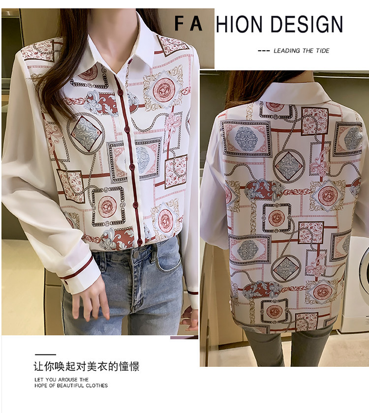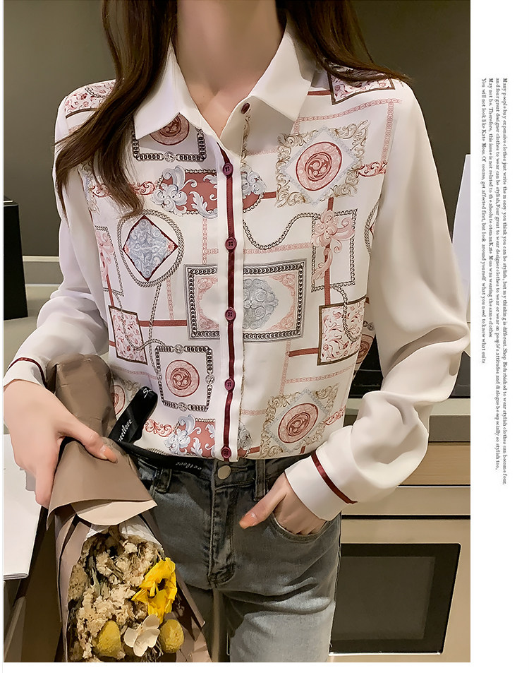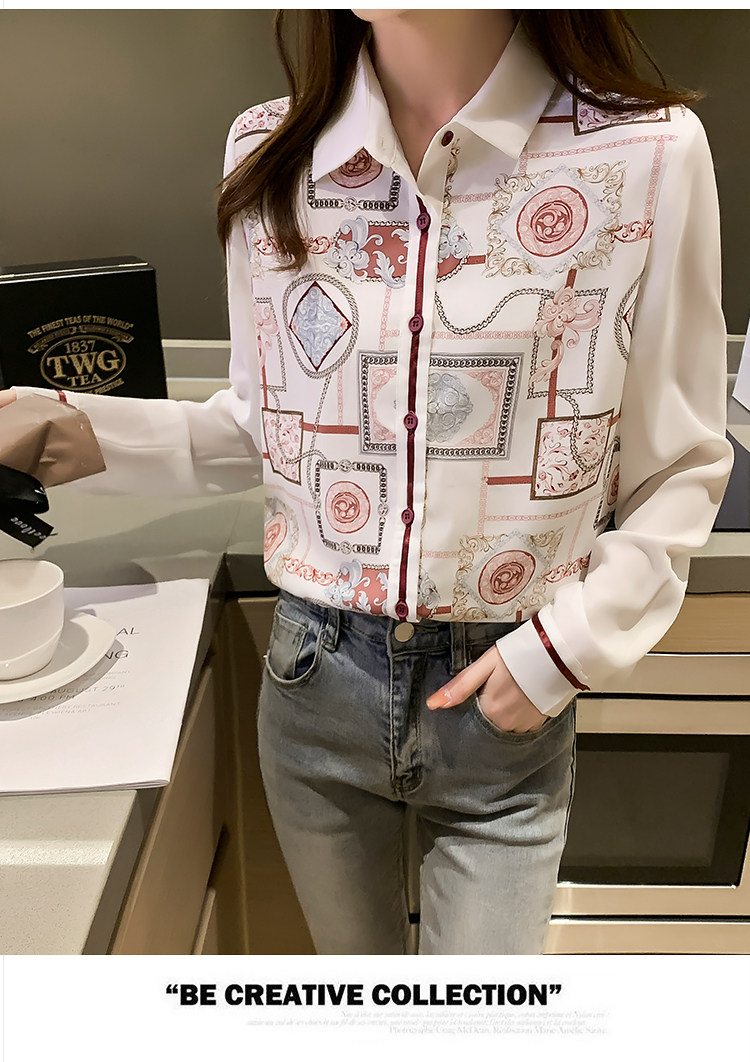 实拍2021春装新款复古Polo领显瘦印花长袖雪纺衫衬衫洋气小衫