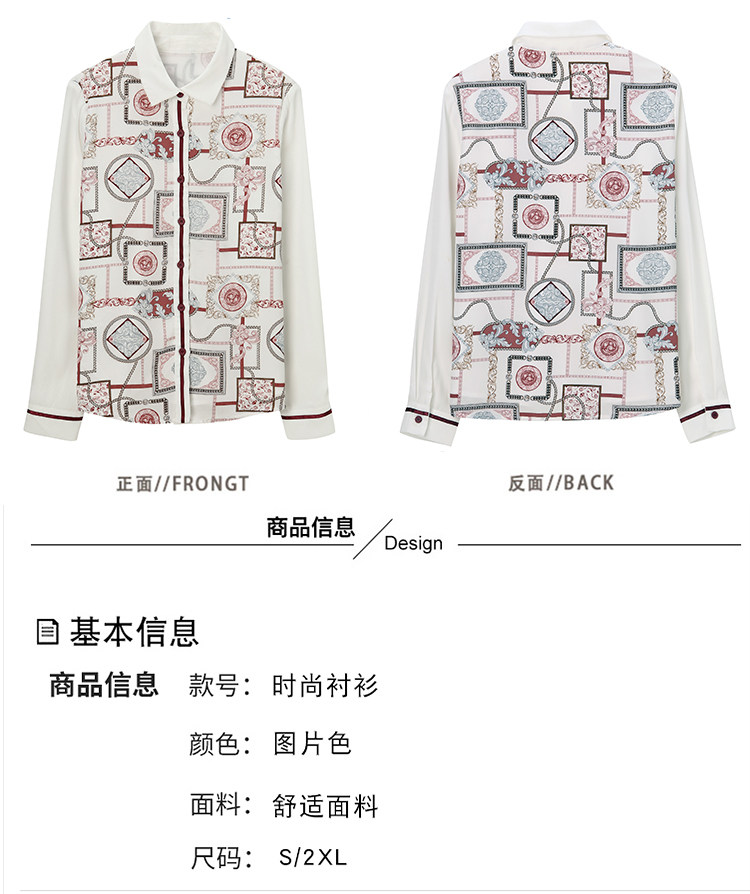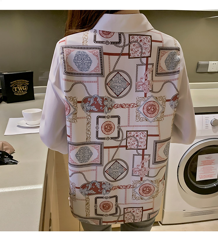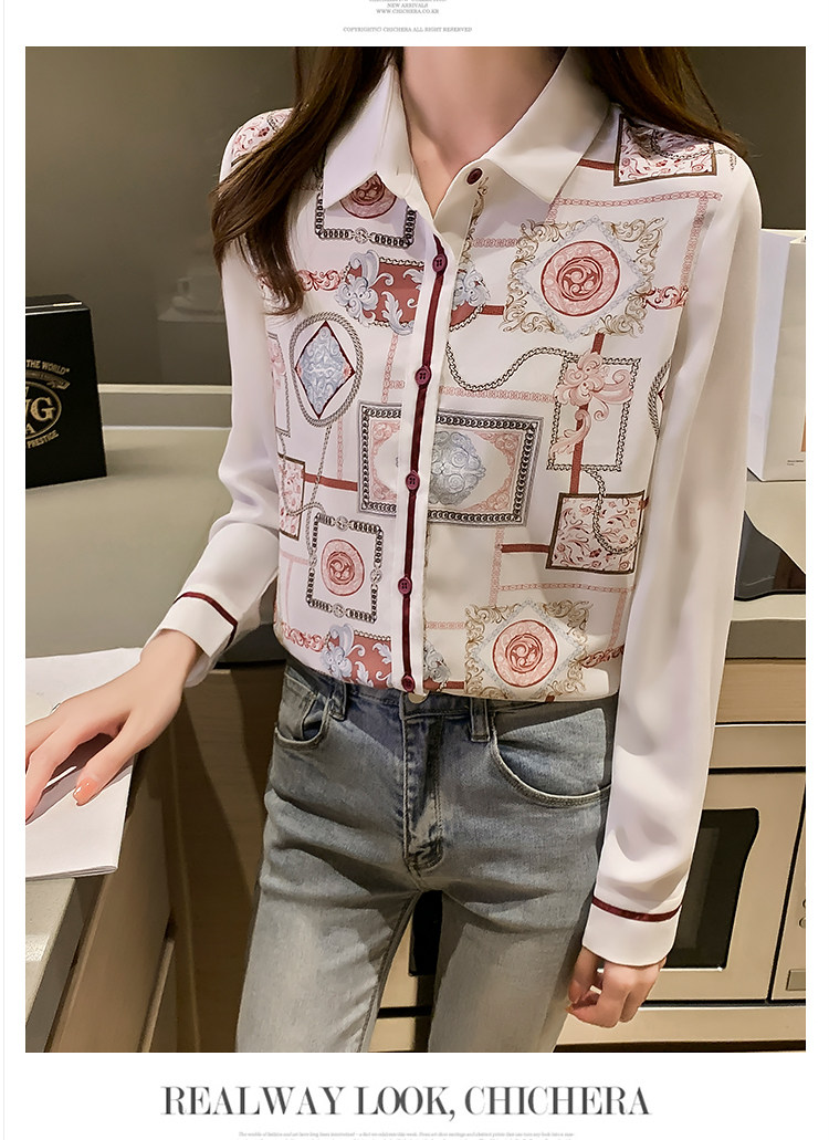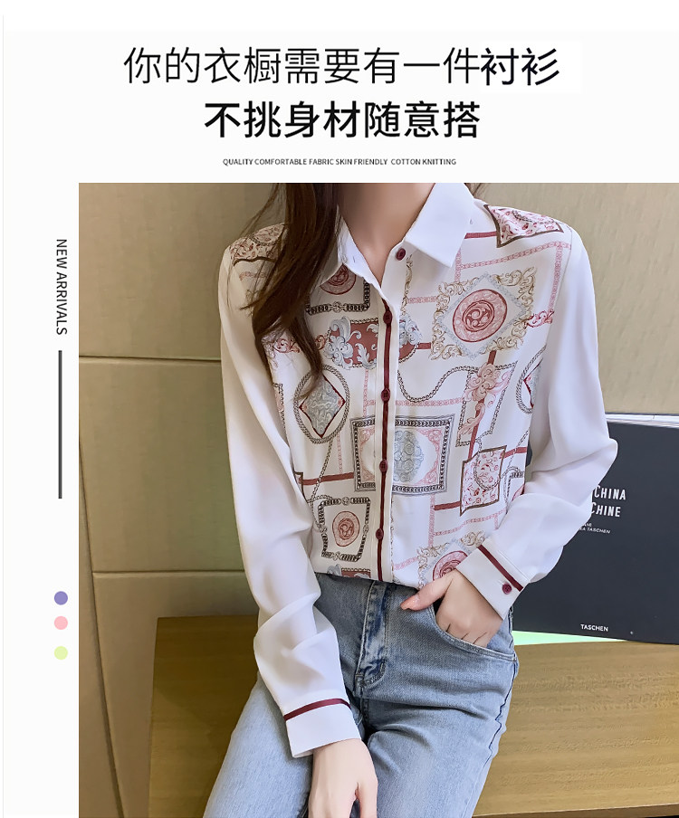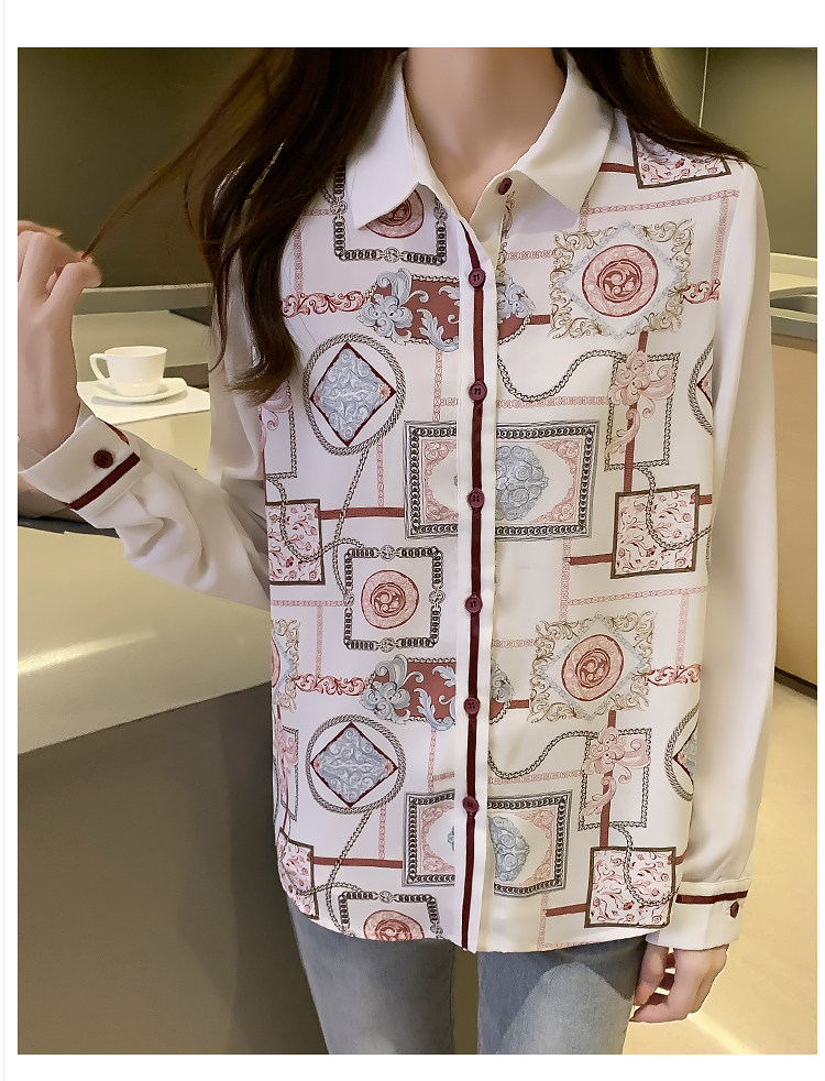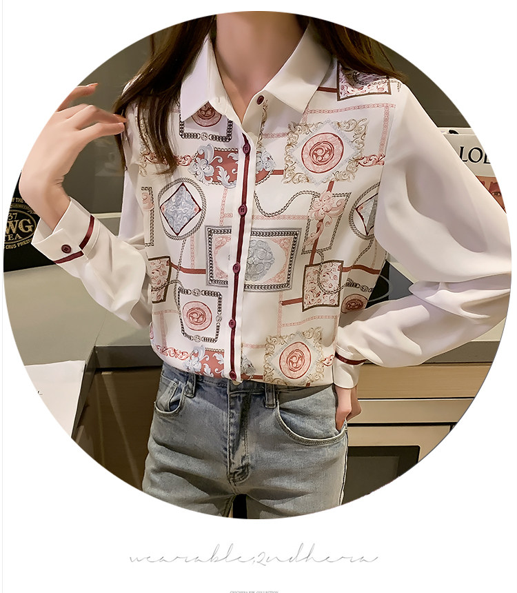 实拍2021春装新款复古Polo领显瘦印花长袖雪纺衫衬衫洋气小衫