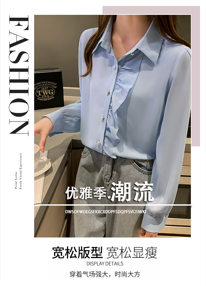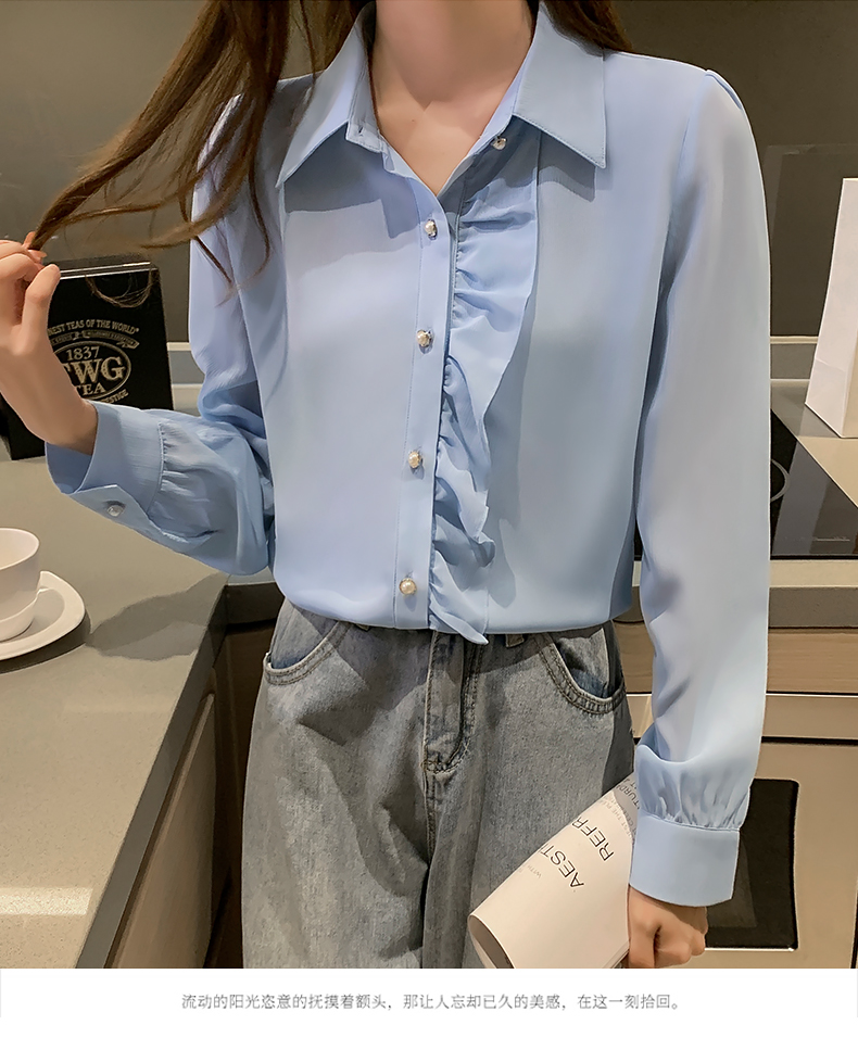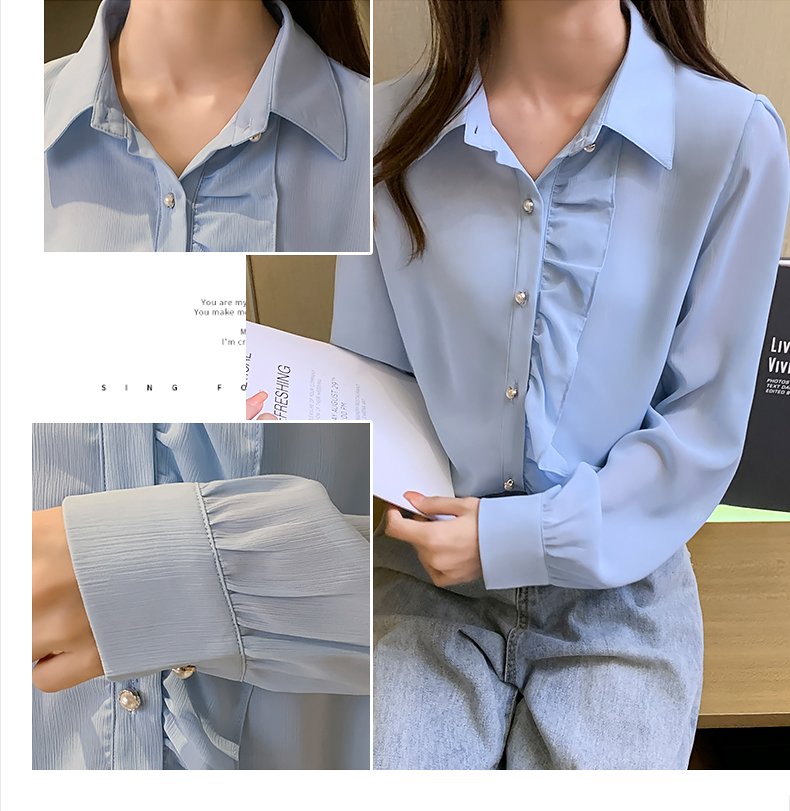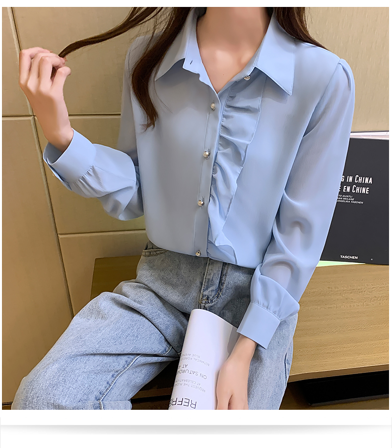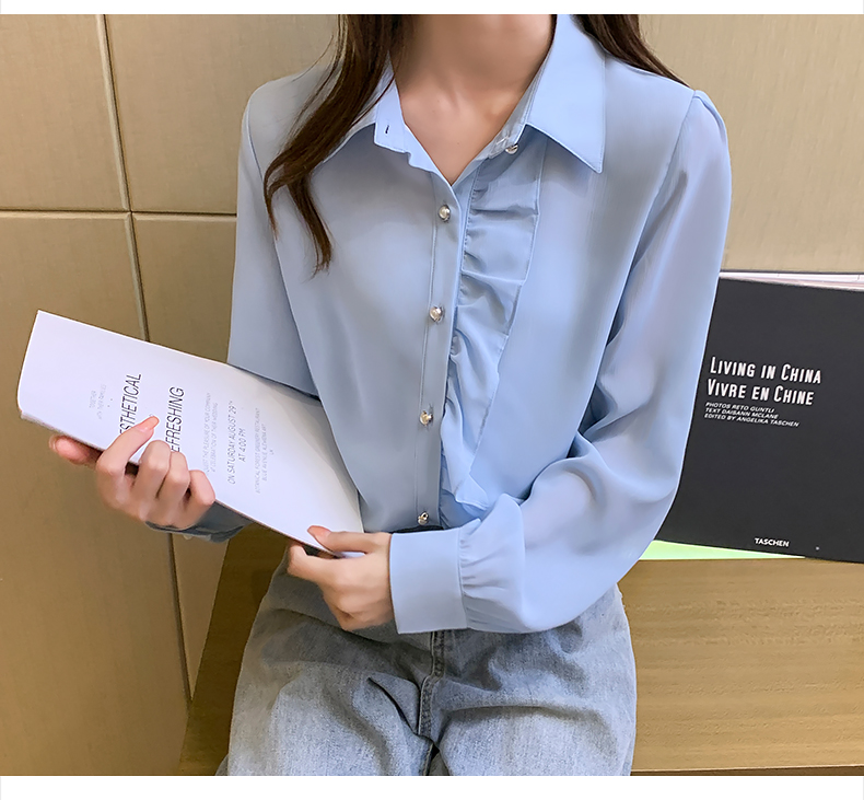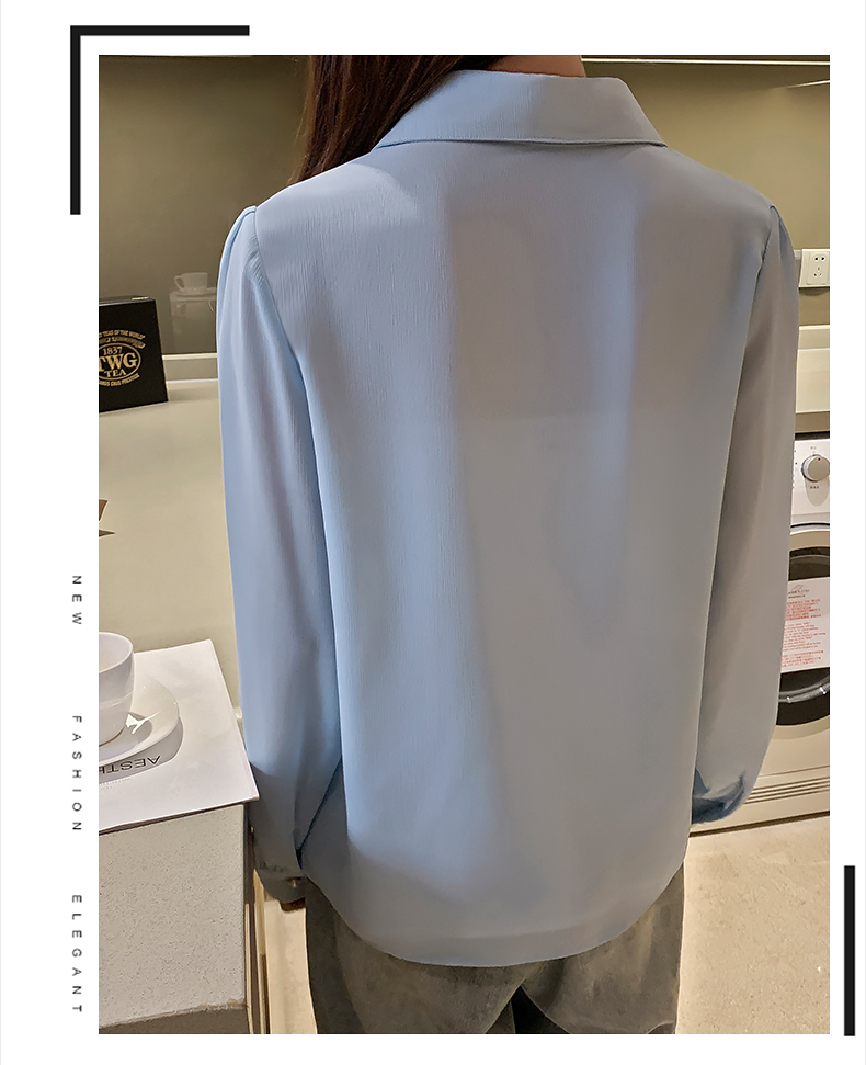 实拍2021春装新款韩版宽松洋气上衣时尚港风蓝色衬衣雪纺衫