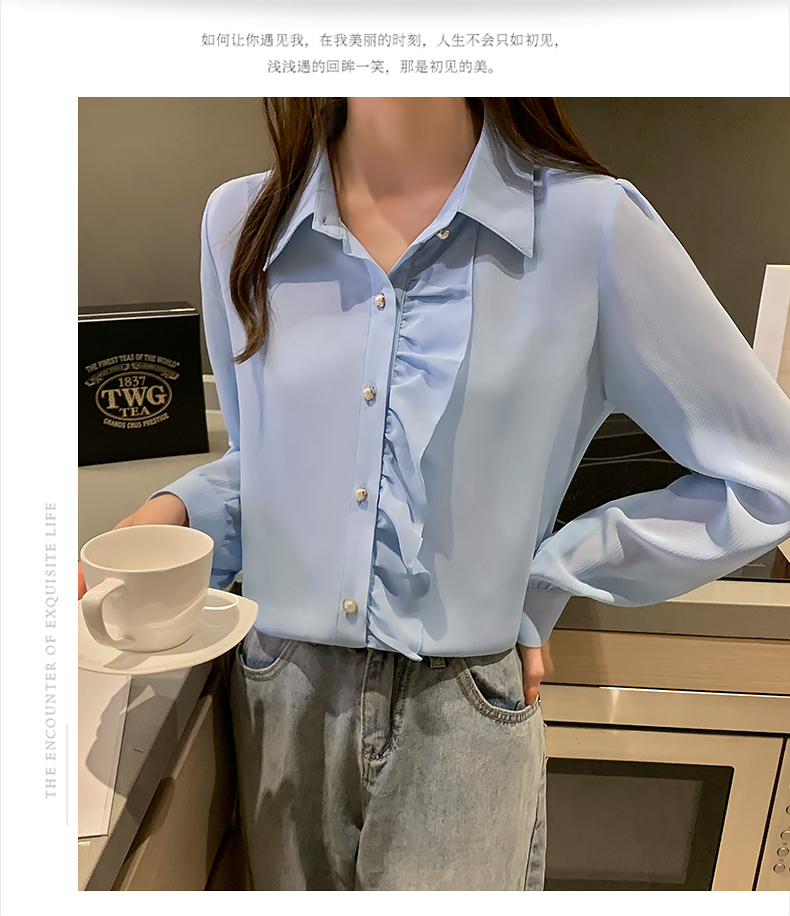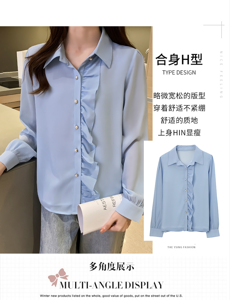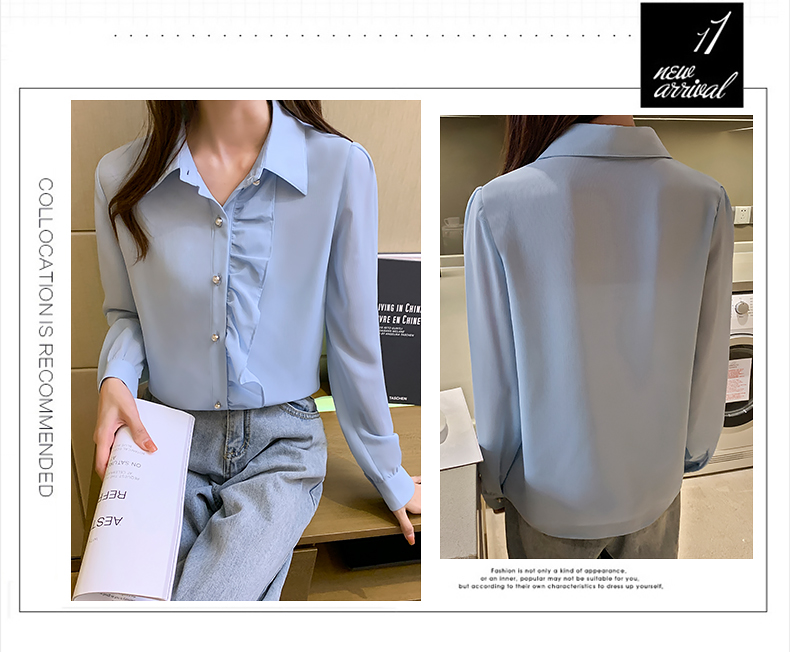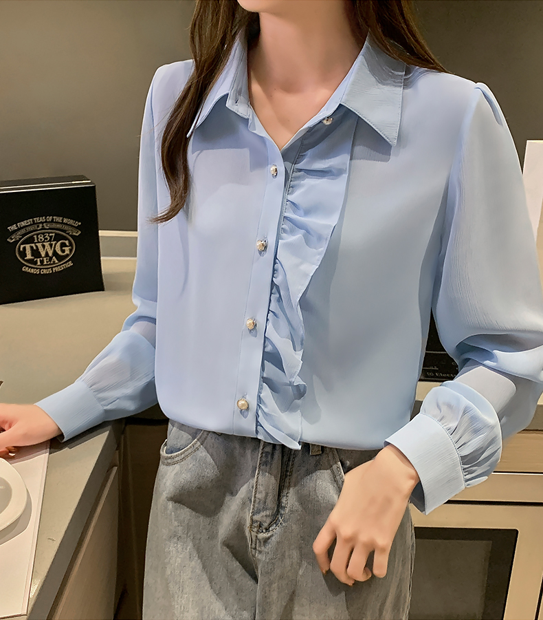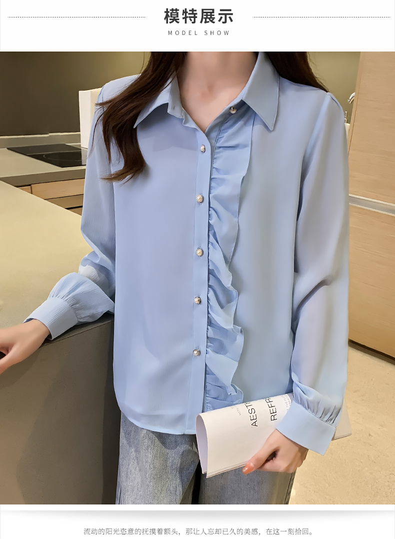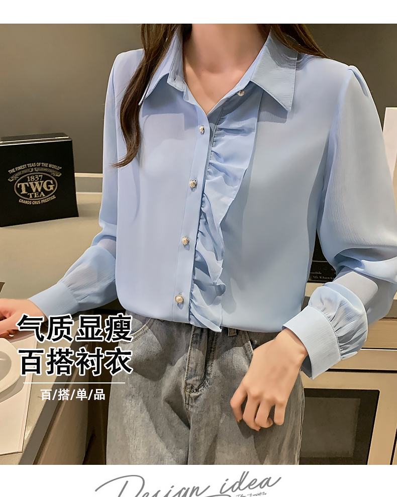 实拍2021春装新款韩版宽松洋气上衣时尚港风蓝色衬衣雪纺衫
