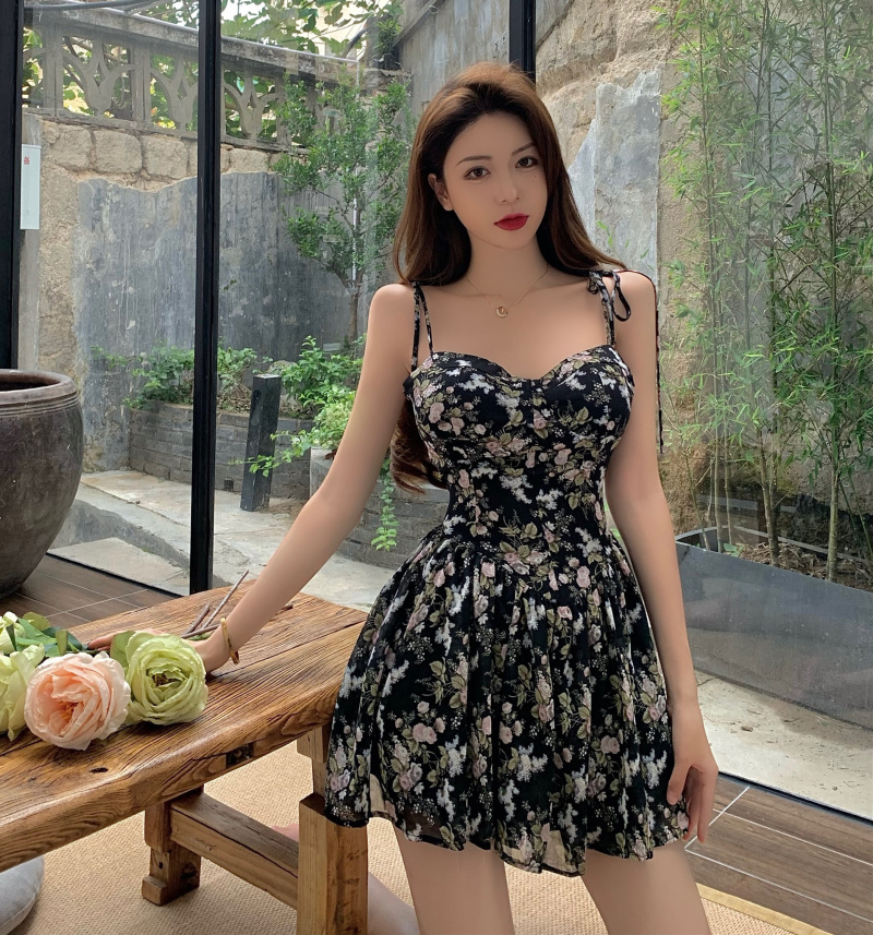 实价实拍 吊带连衣裙女2021夏季新款碎花收腰显瘦雪纺复古印花裙