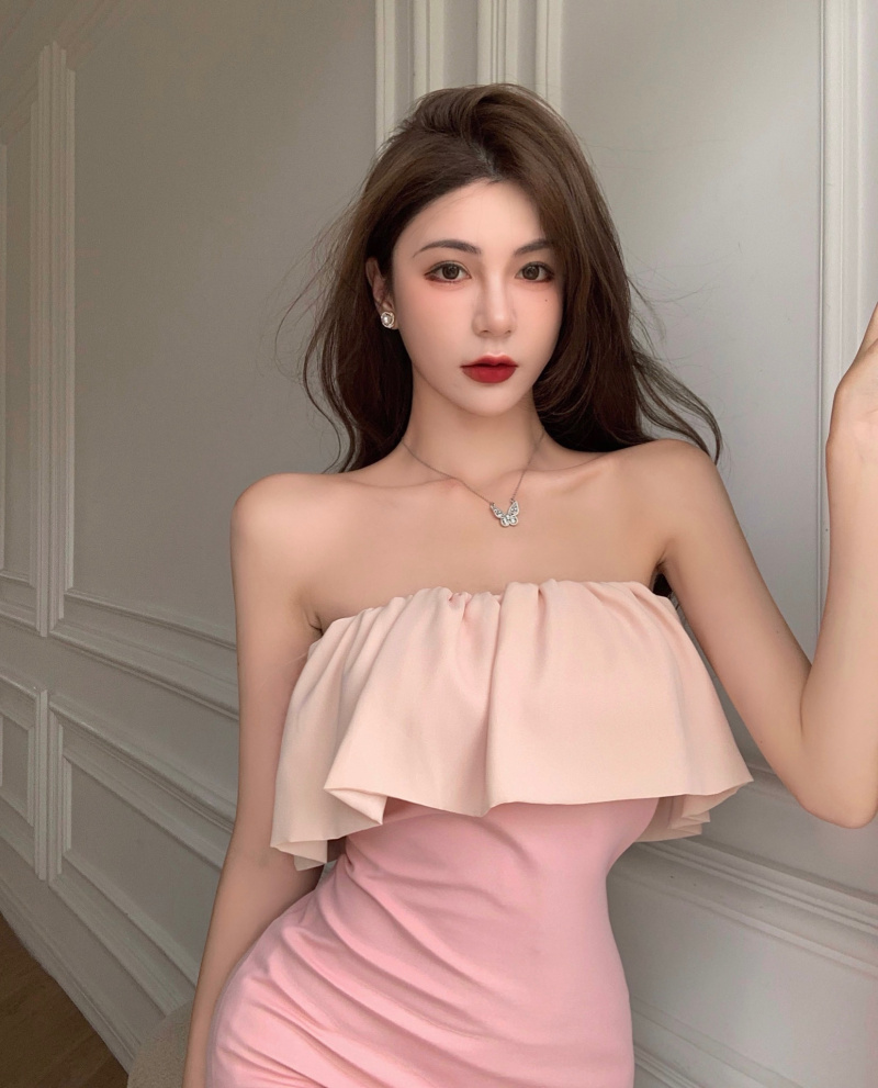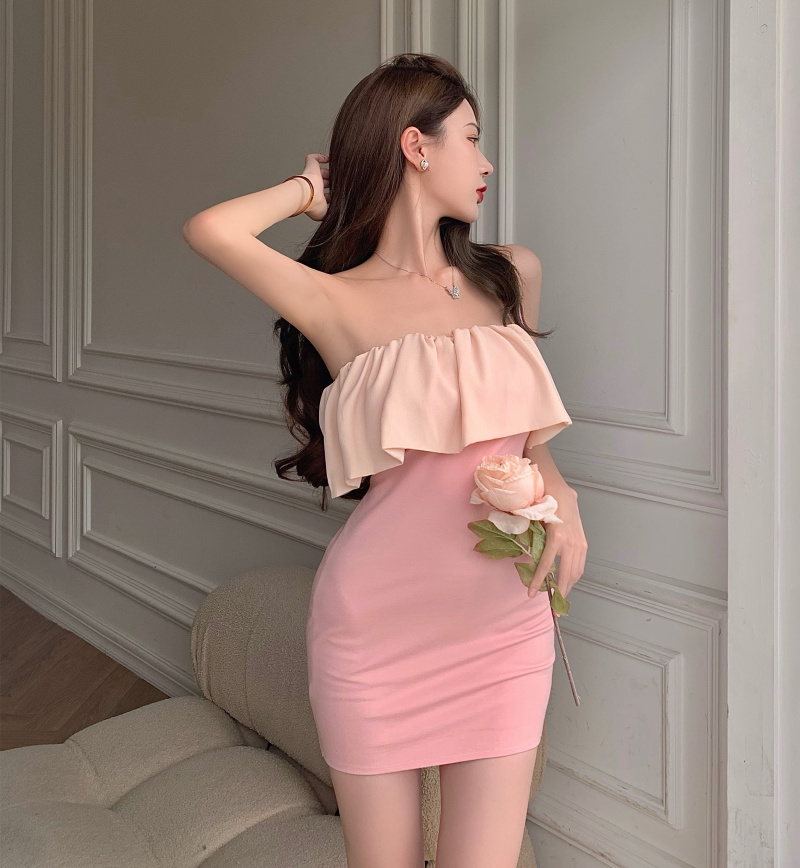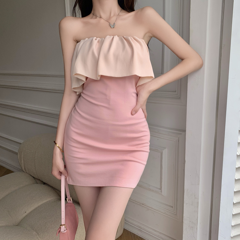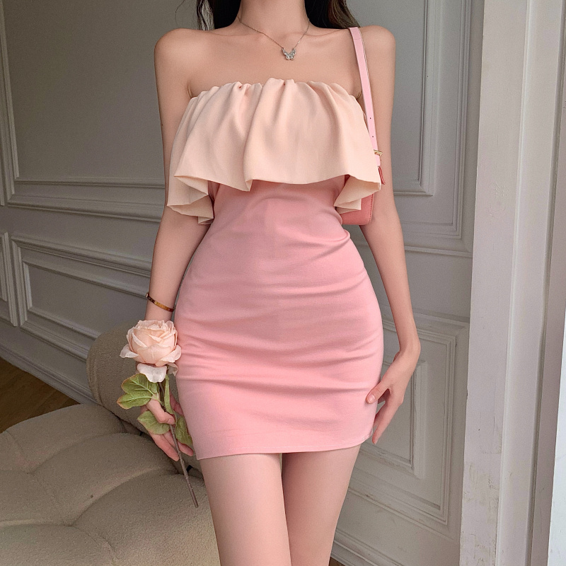 实价实拍 新款法式优雅荷叶边抹胸显瘦性感连衣裙包臀裙女