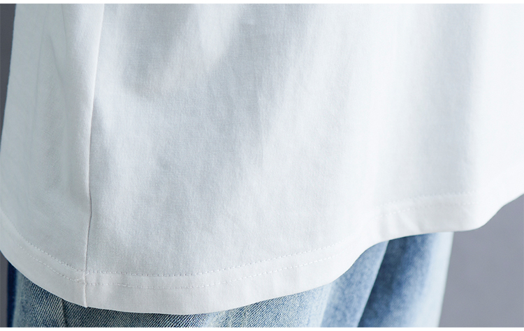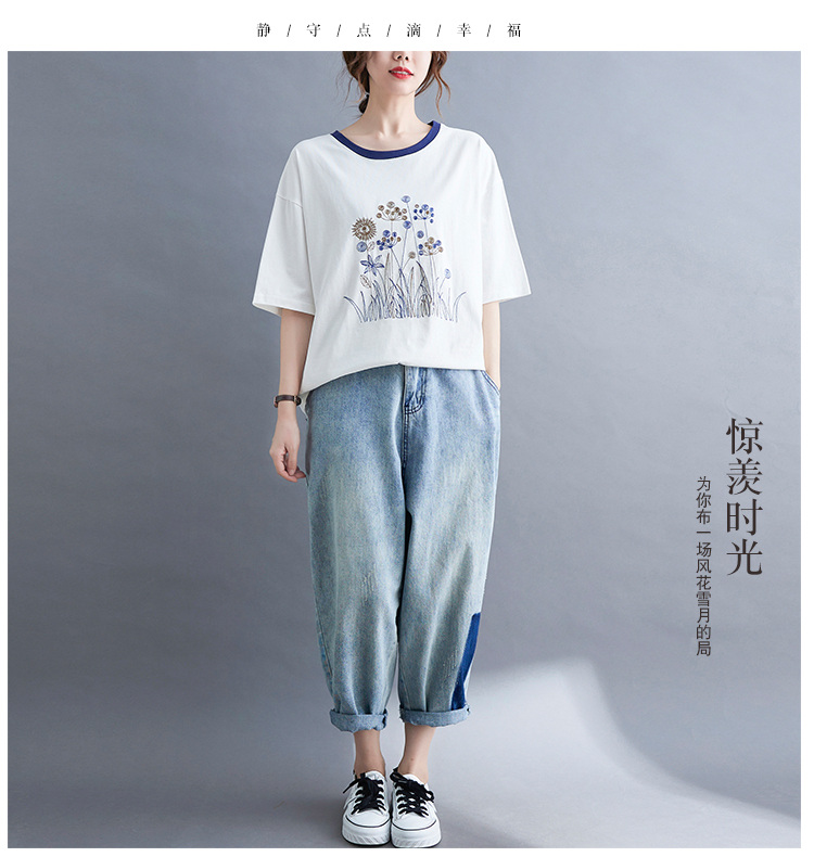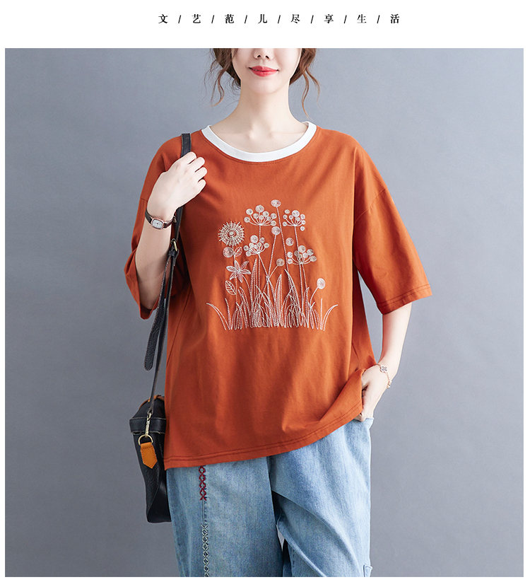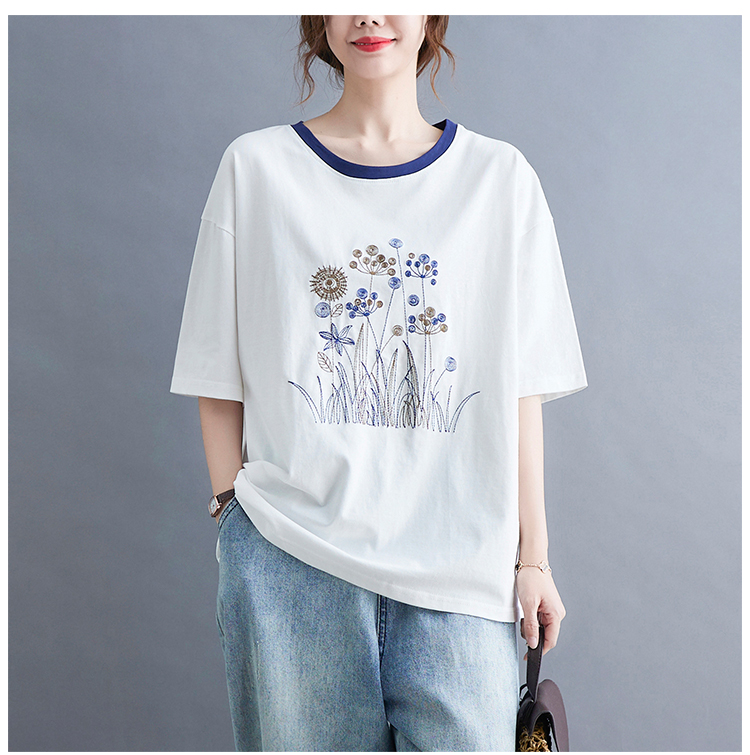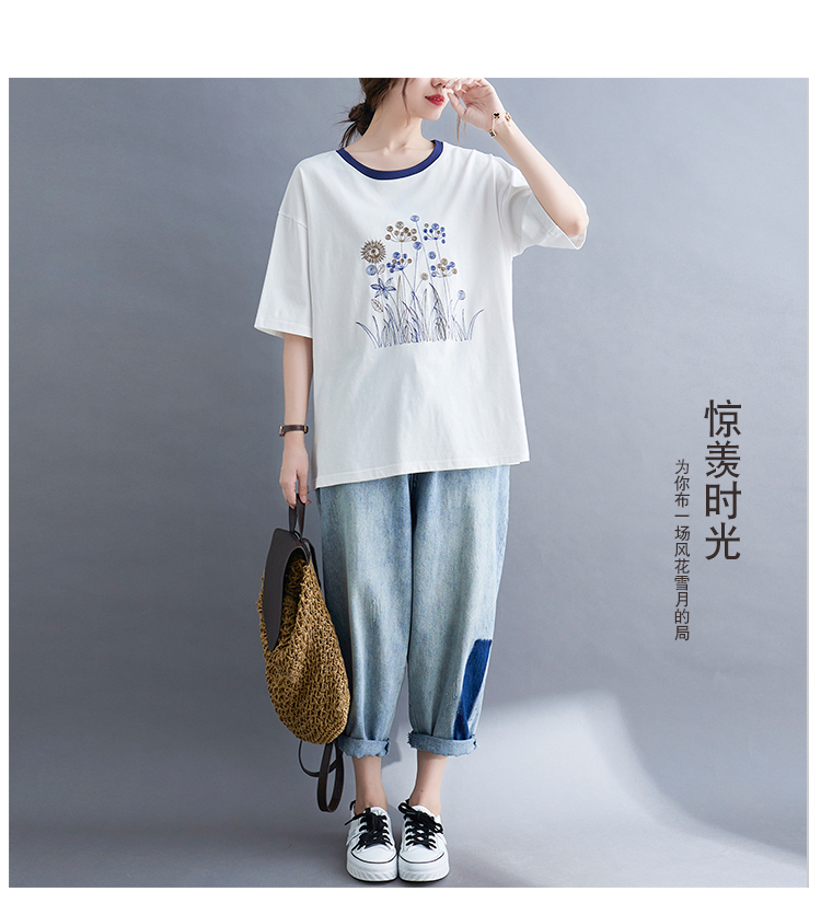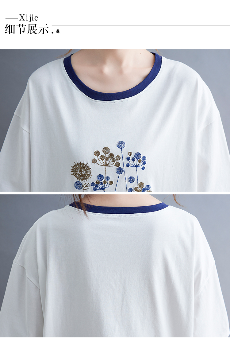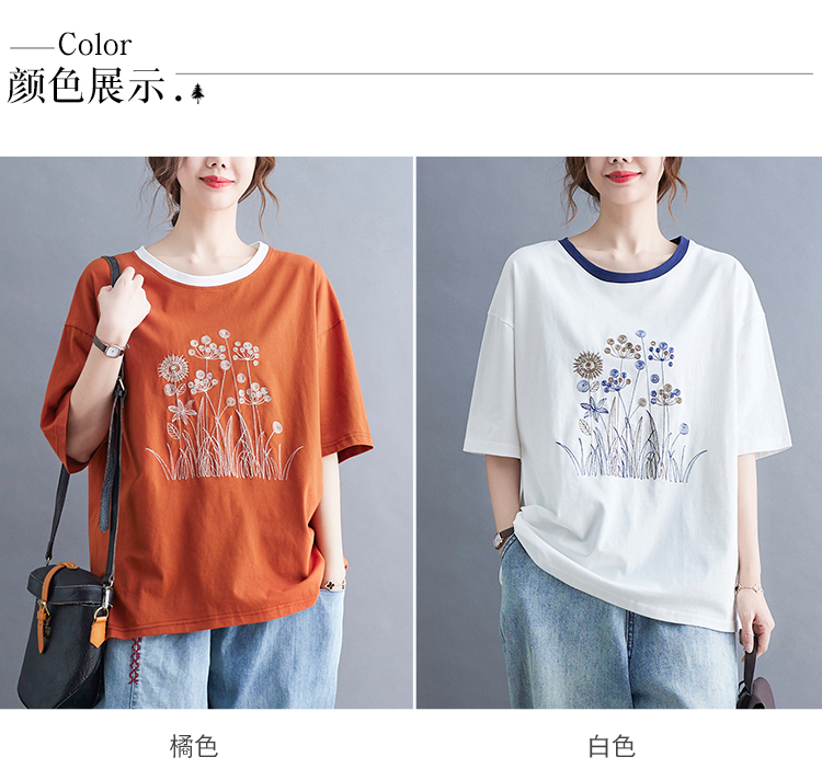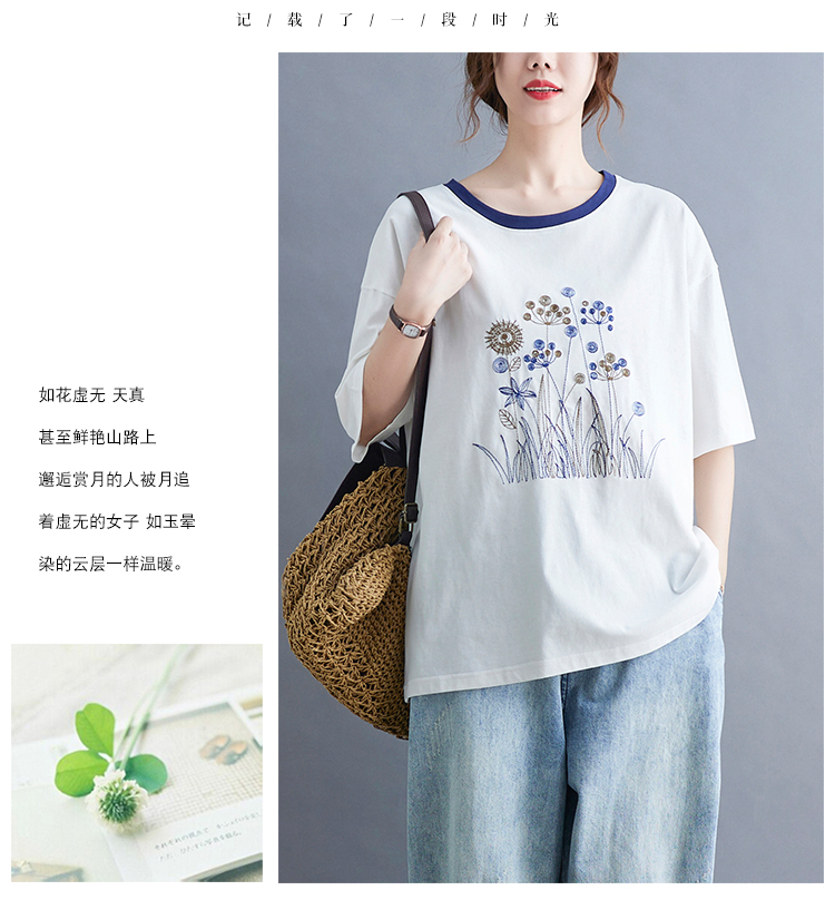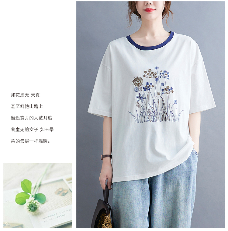 实拍2021夏装新款文艺大码女装纯棉绣花短袖T恤宽松圆领上衣