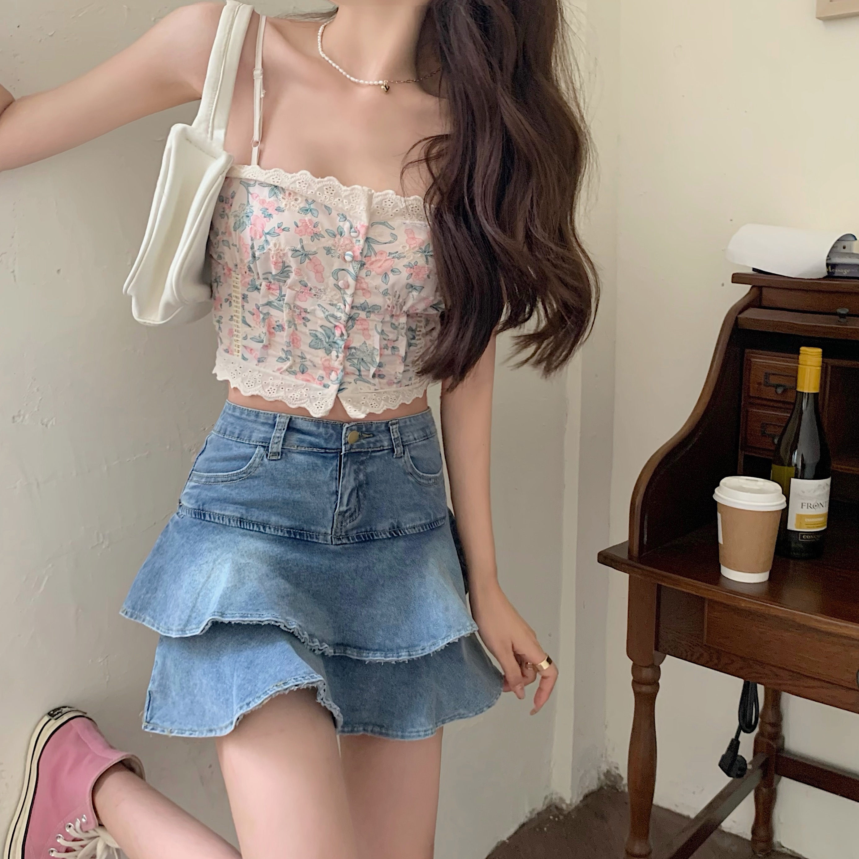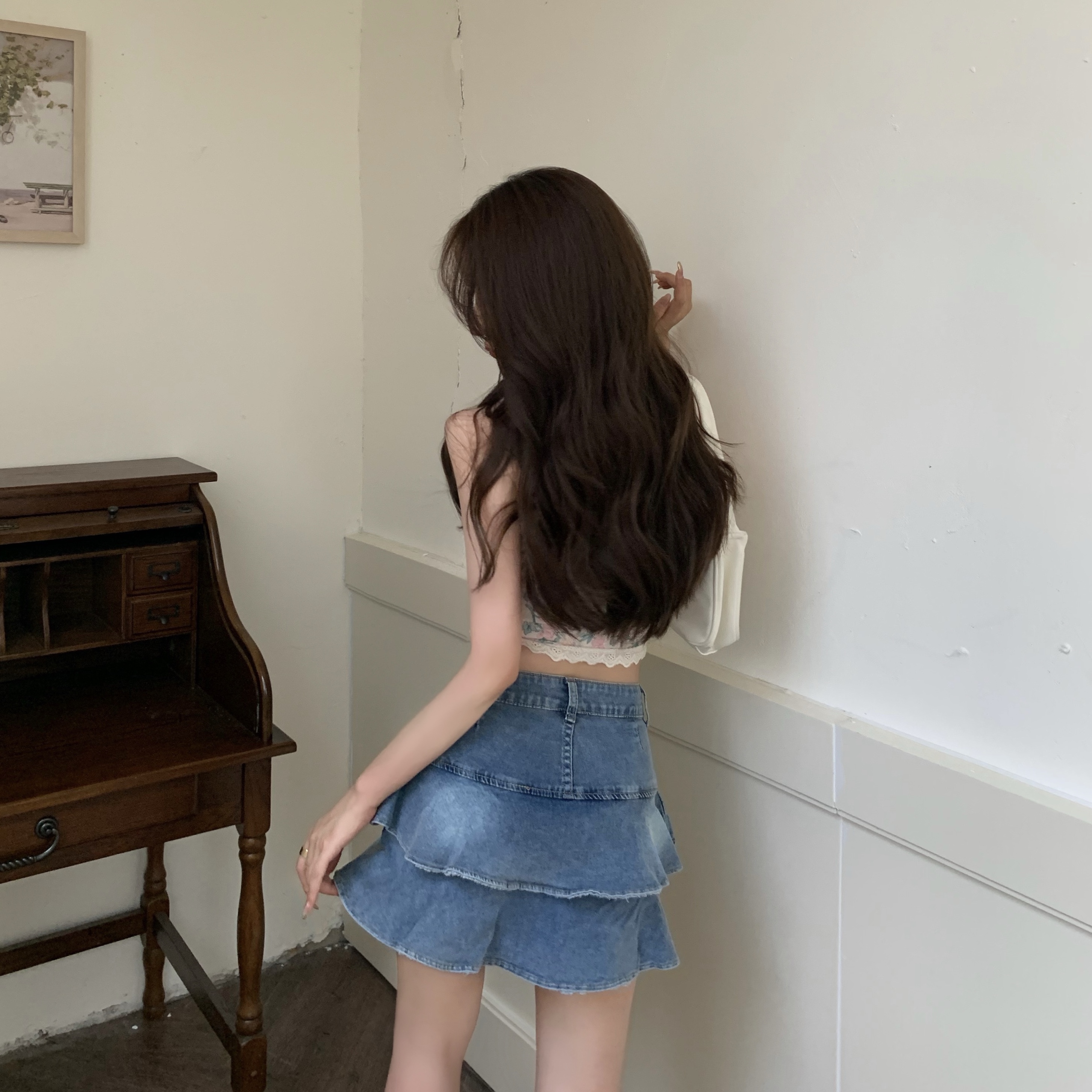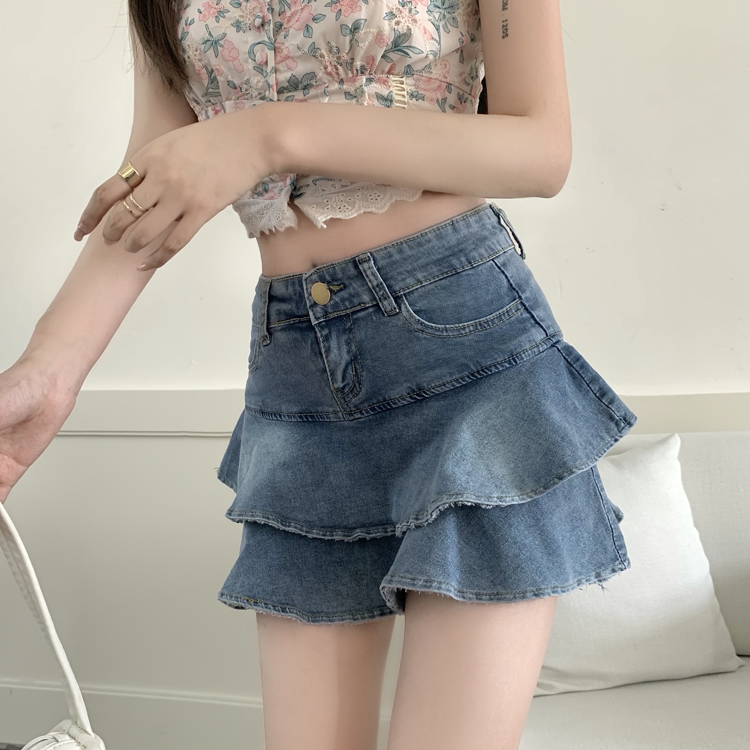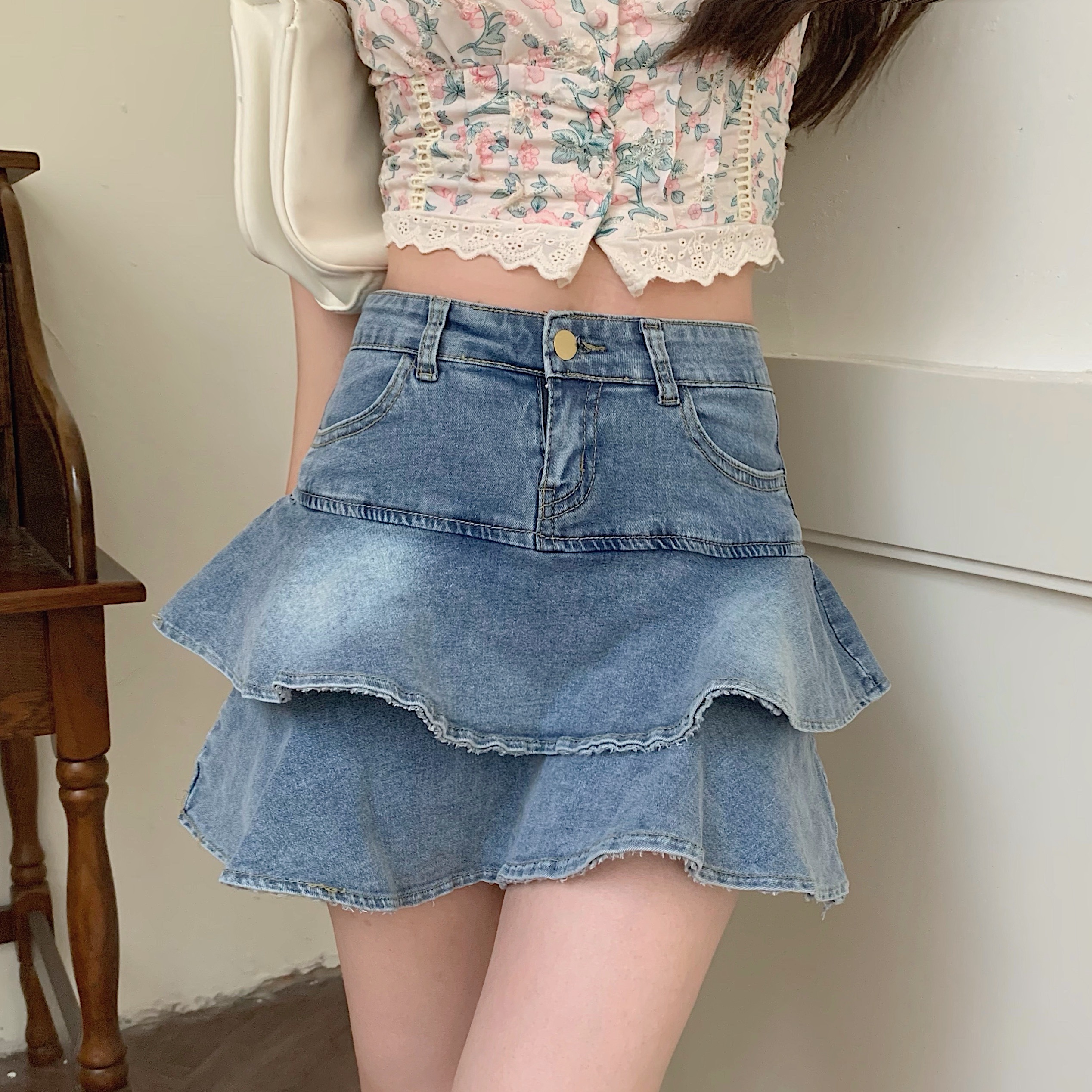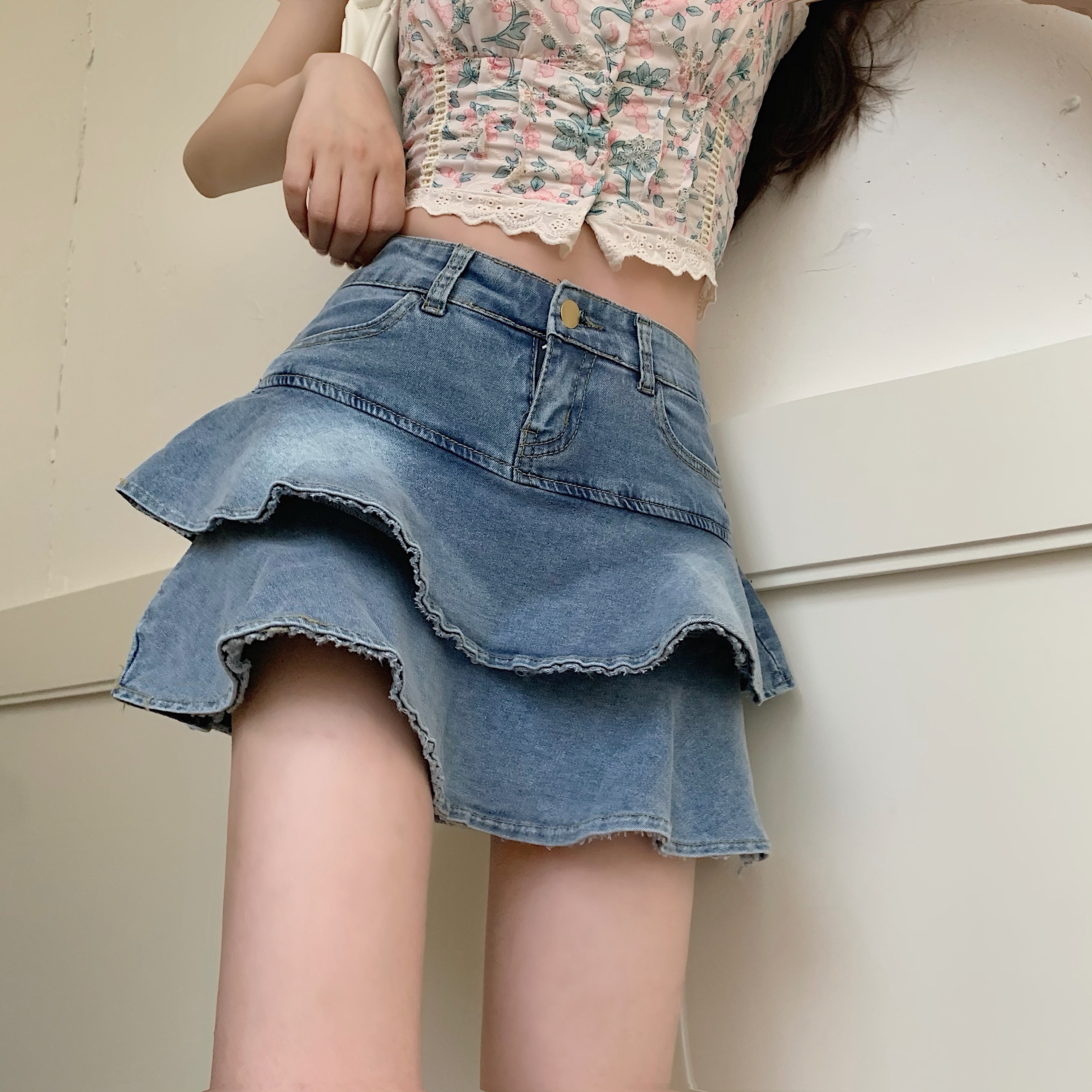 实拍~大码女装牛仔半身裙女高腰辣妹荷叶边鱼尾短裙a字百褶裙子胖mm