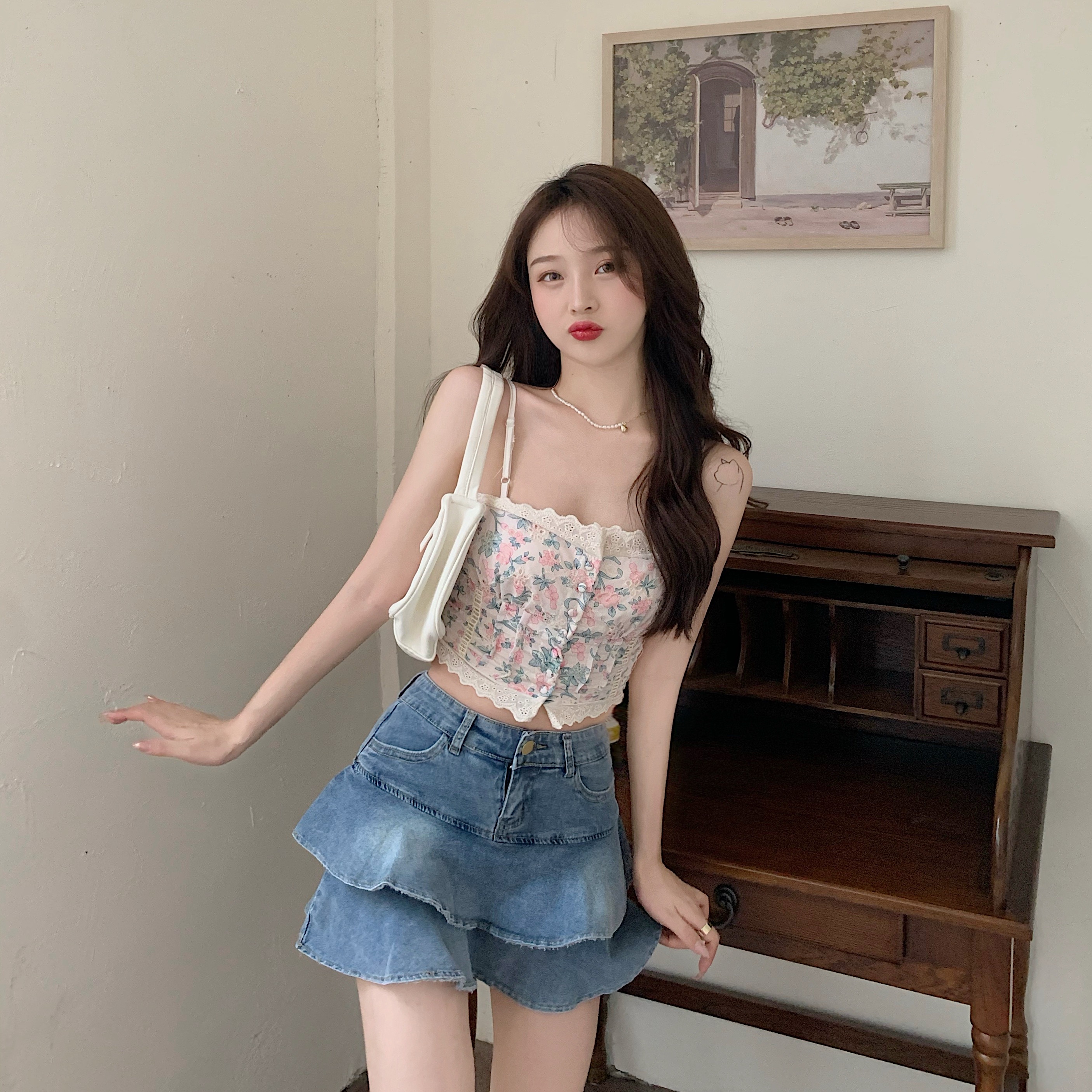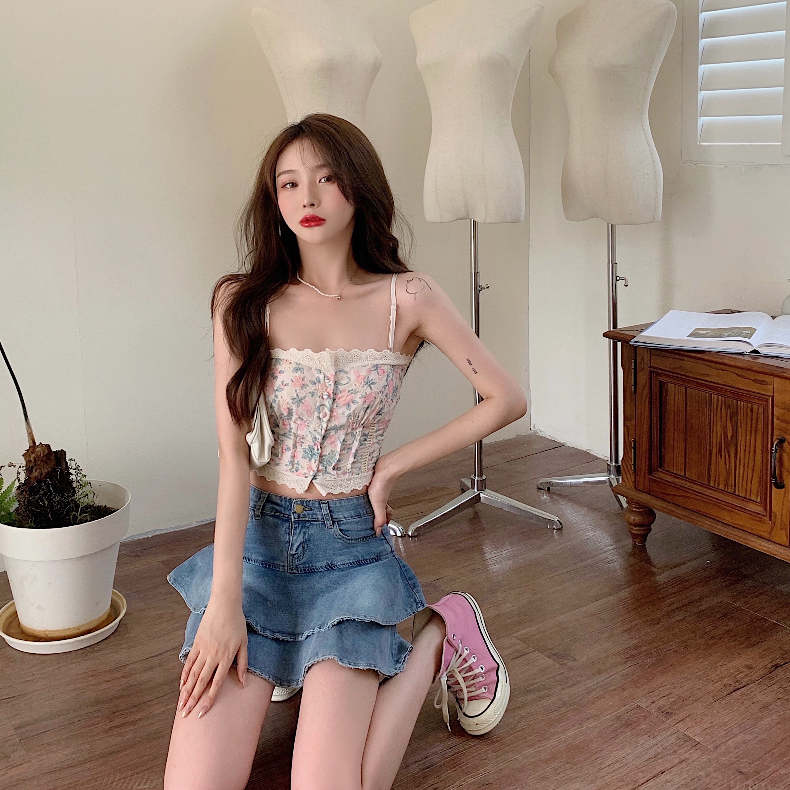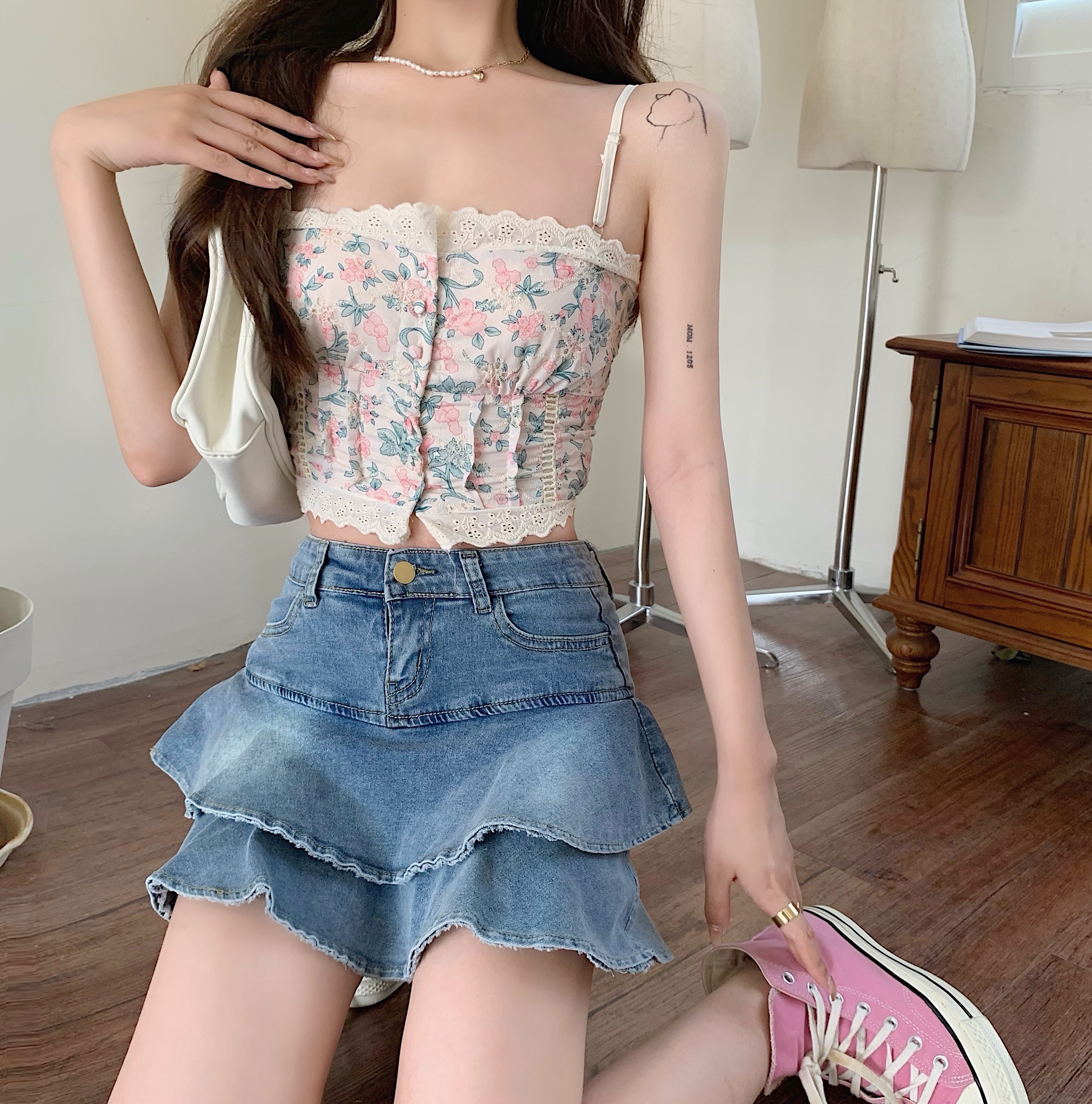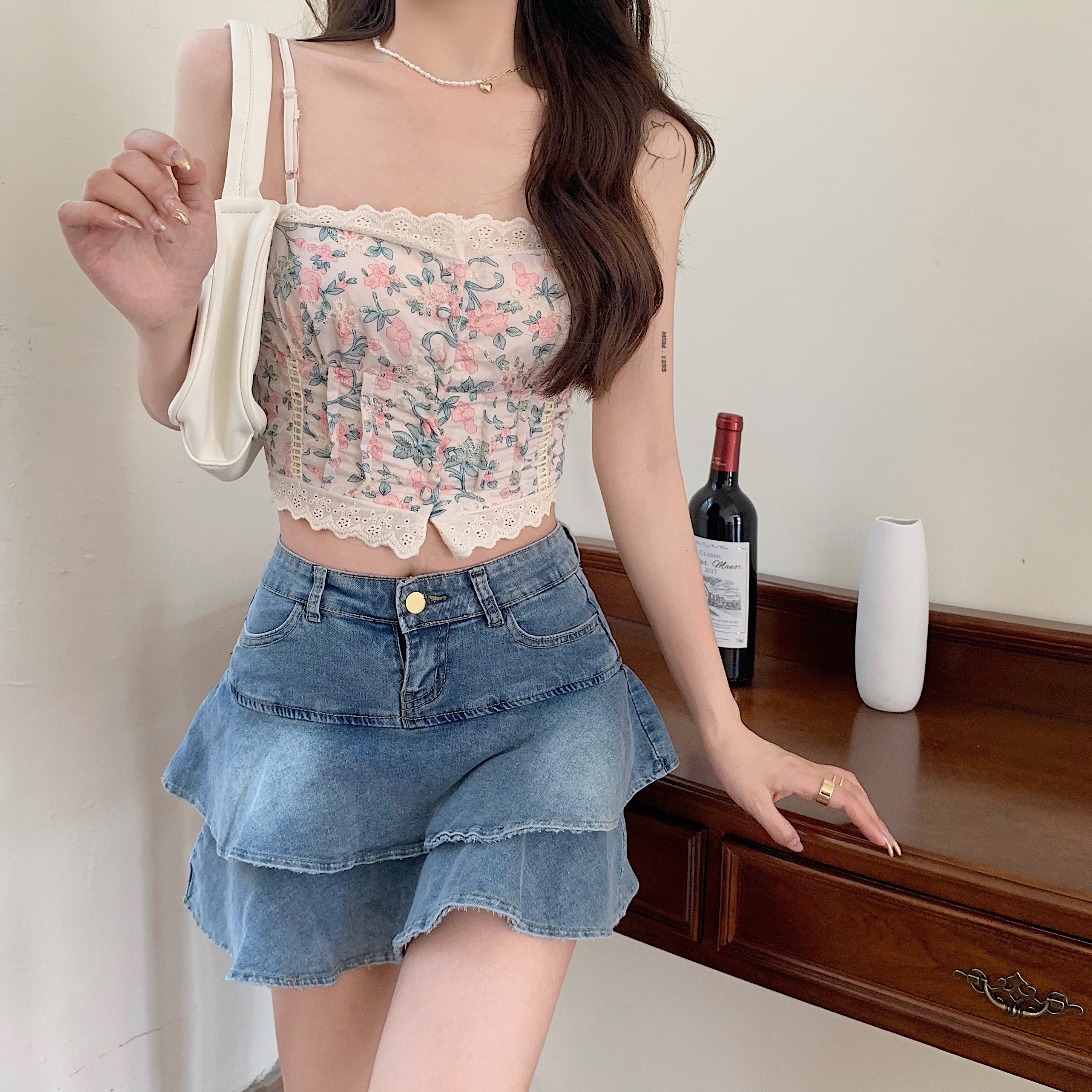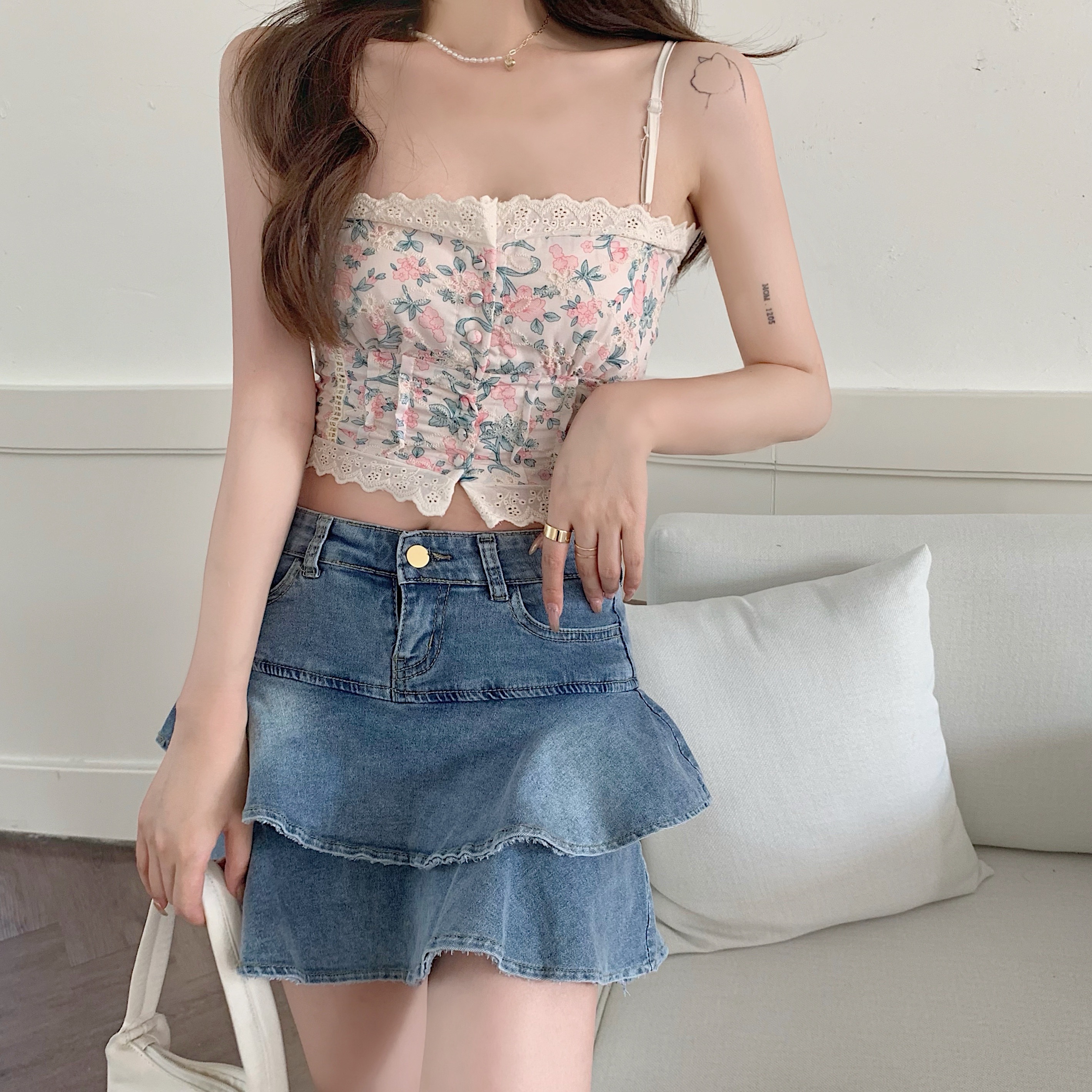 实拍~大码女装牛仔半身裙女高腰辣妹荷叶边鱼尾短裙a字百褶裙子胖mm