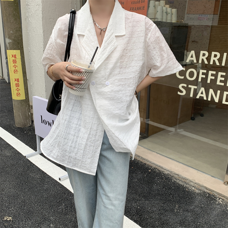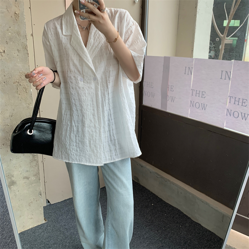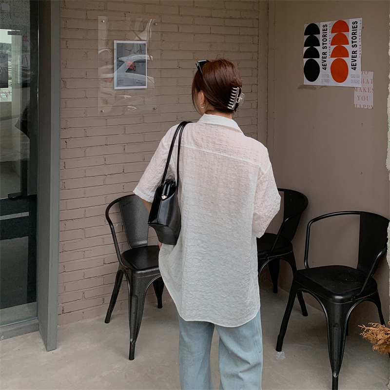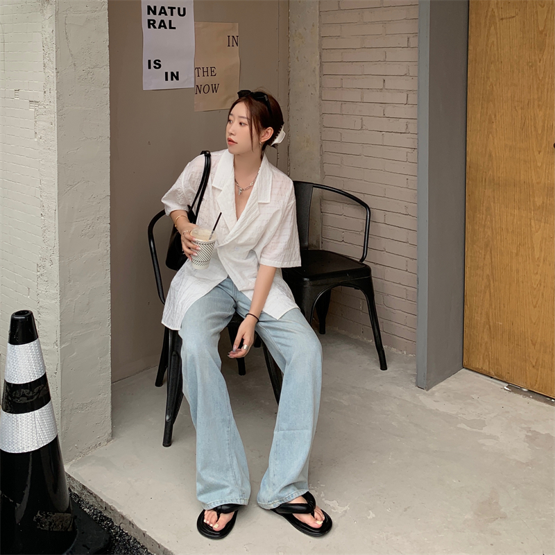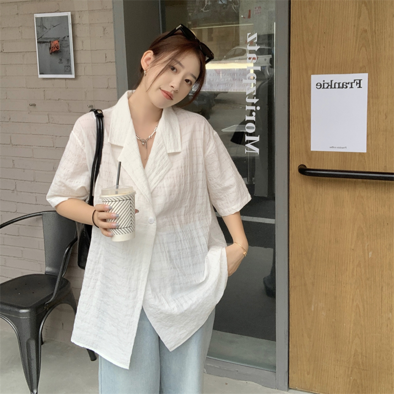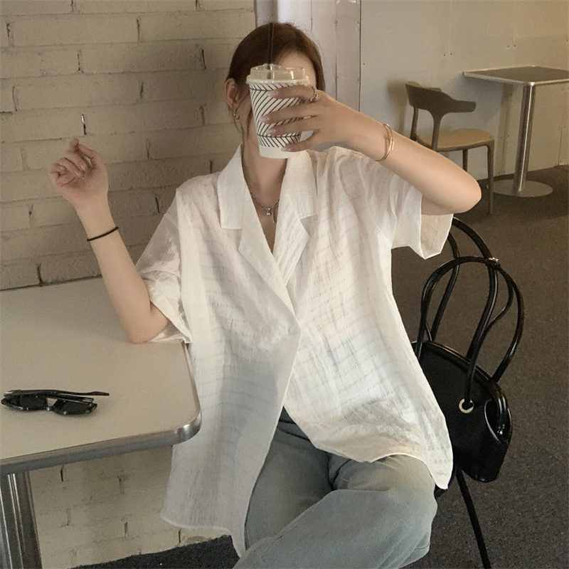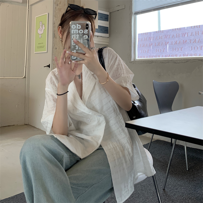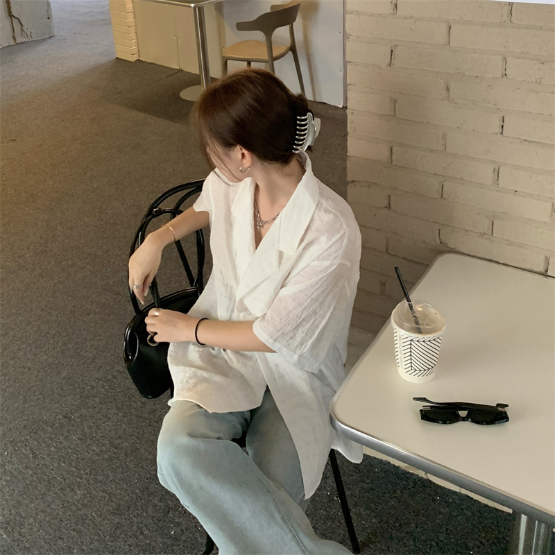 实价实拍 夏季薄款肌理纹面料设计感小众V领衬衫韩风