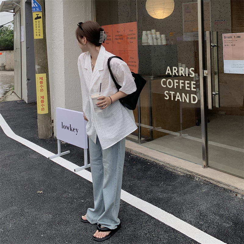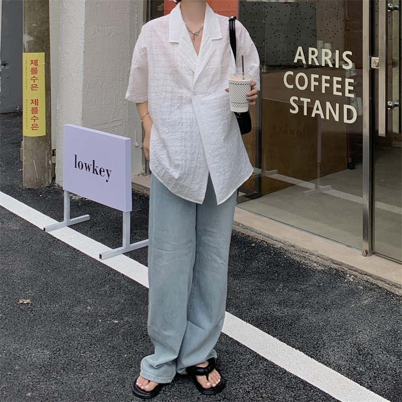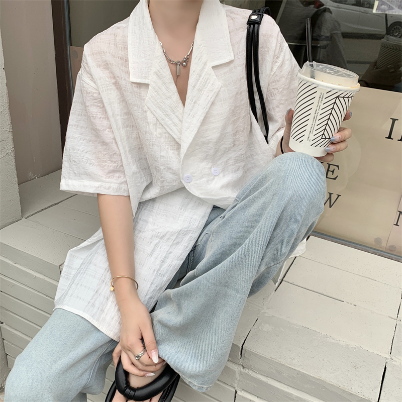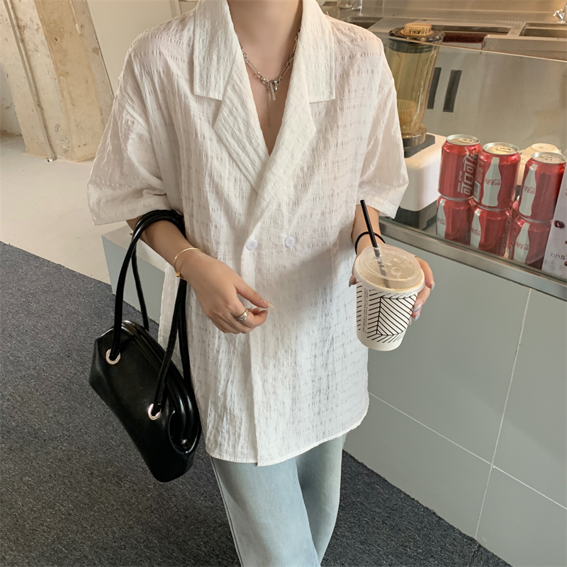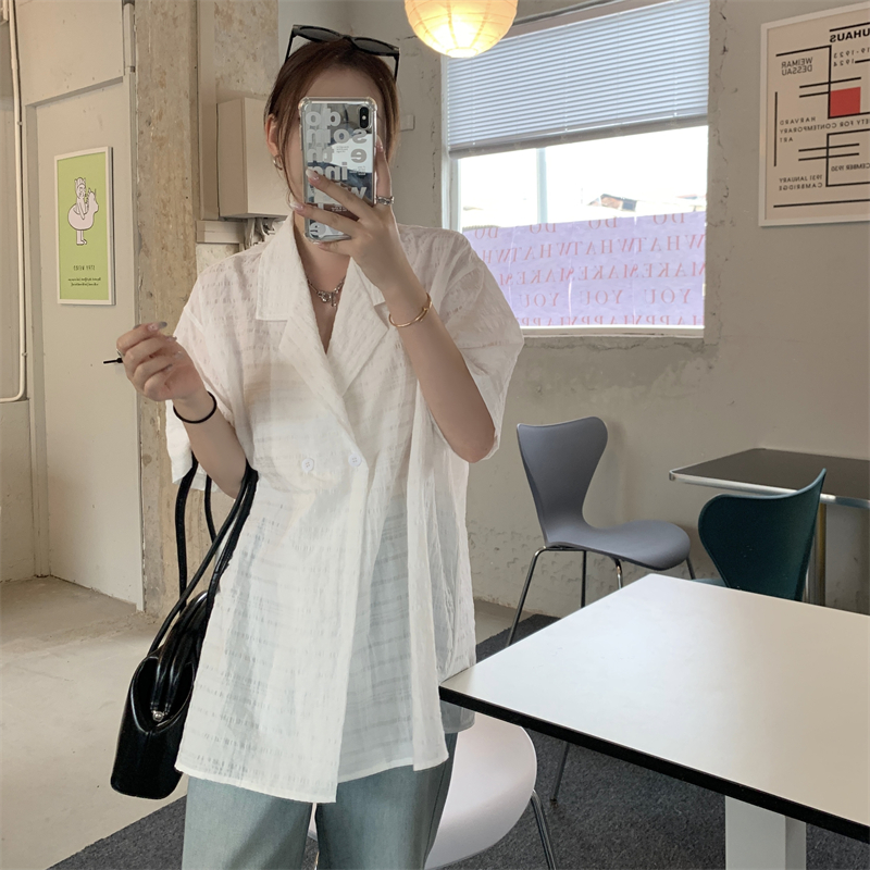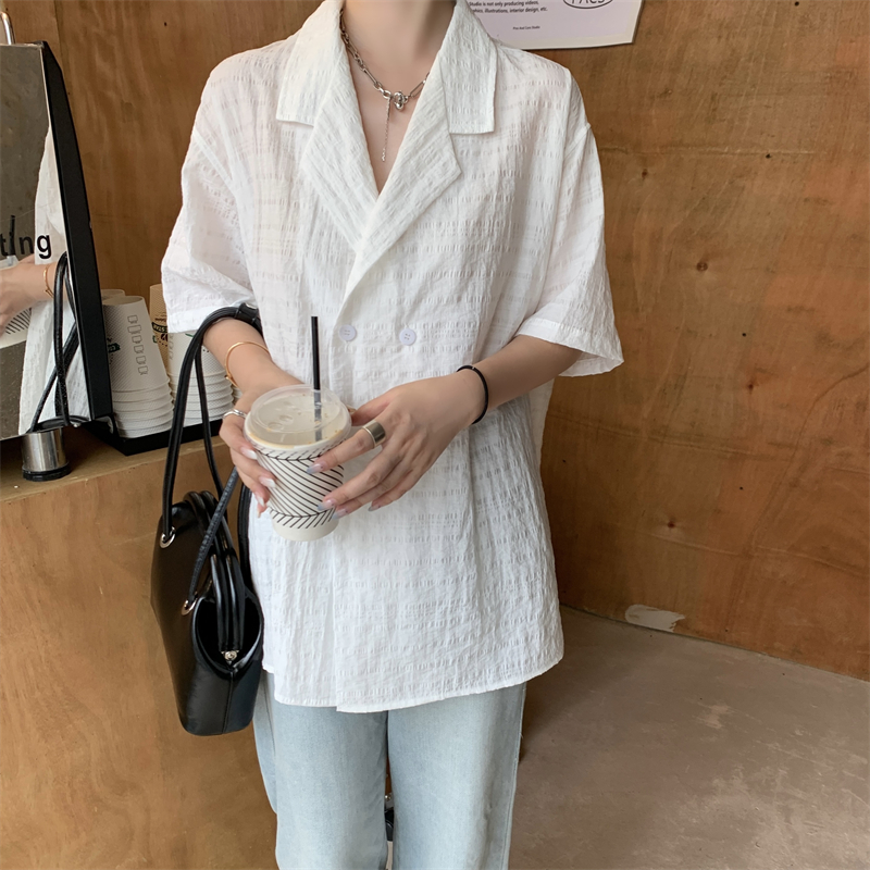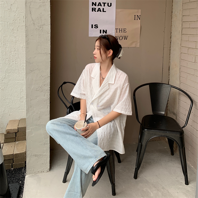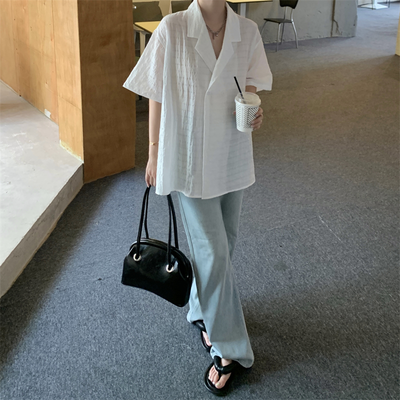 实价实拍 夏季薄款肌理纹面料设计感小众V领衬衫韩风