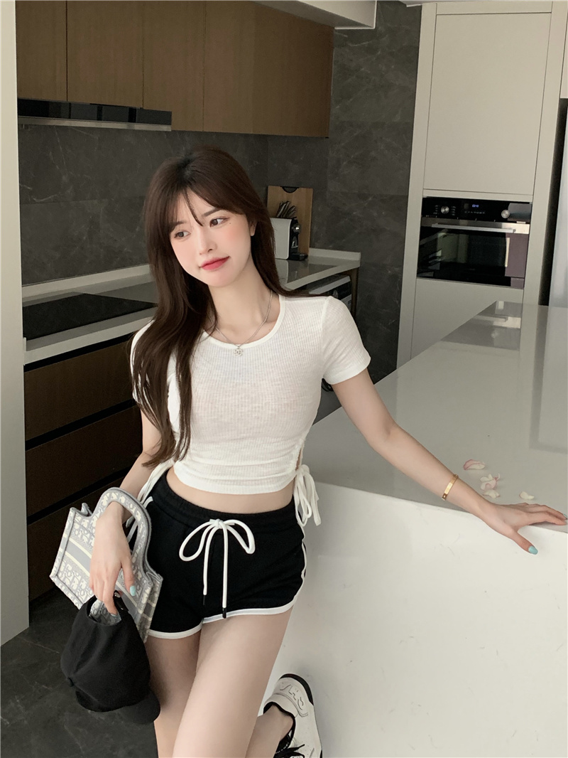 实拍实价 纯欲风性感短款露脐t恤设计感抽绳