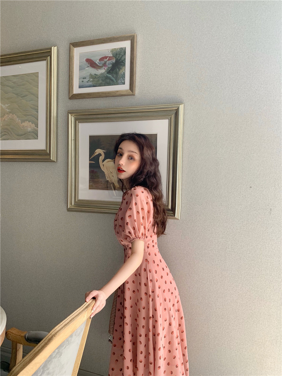 实拍 2021夏季法式小众气质优雅设计感波点短袖度假连衣裙