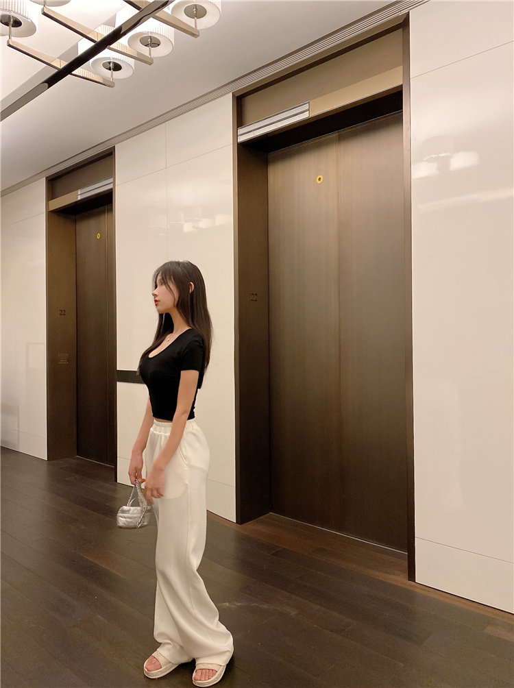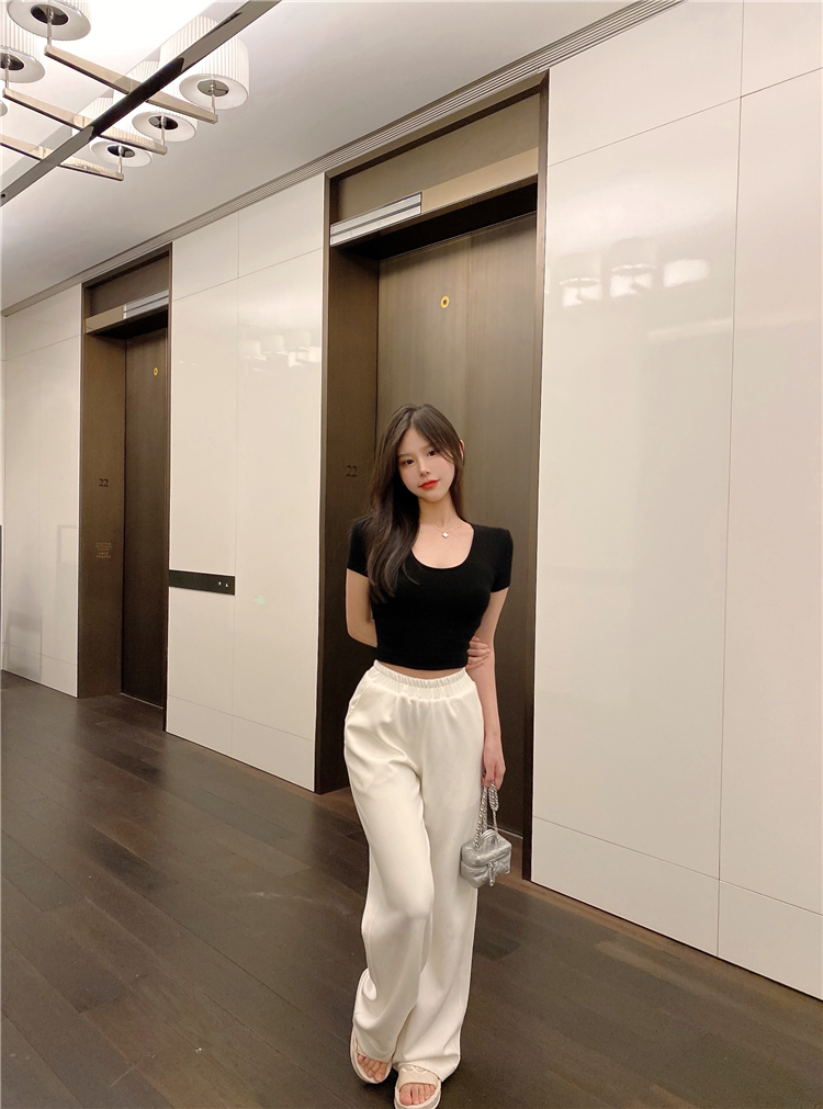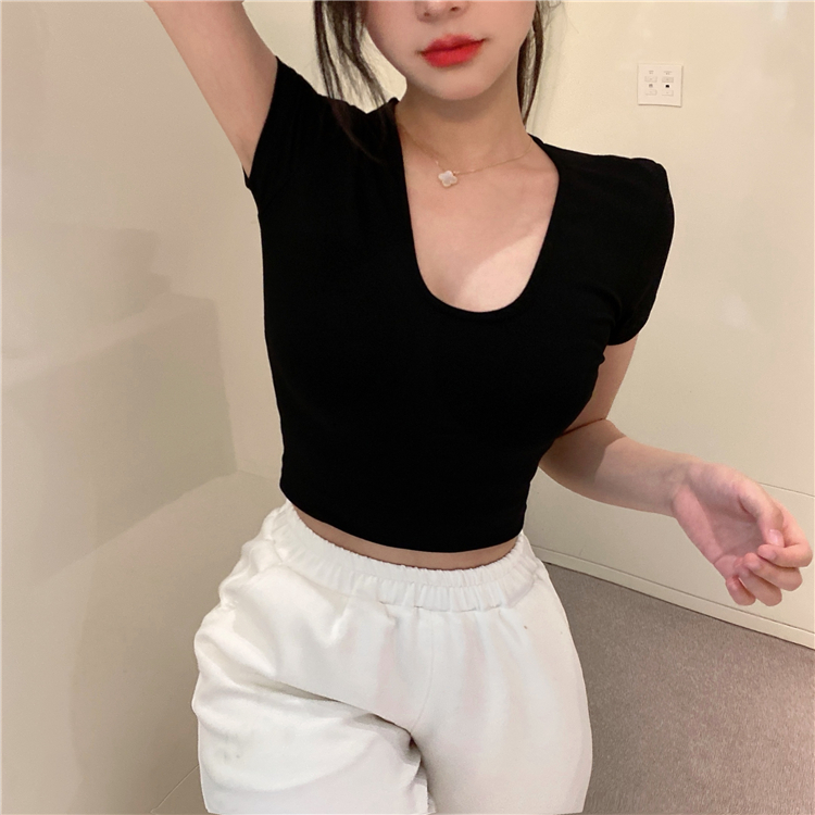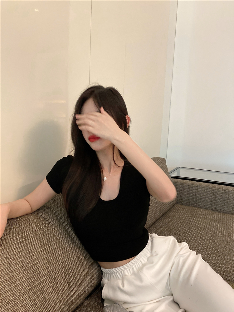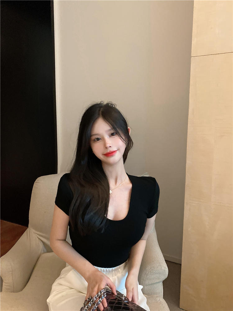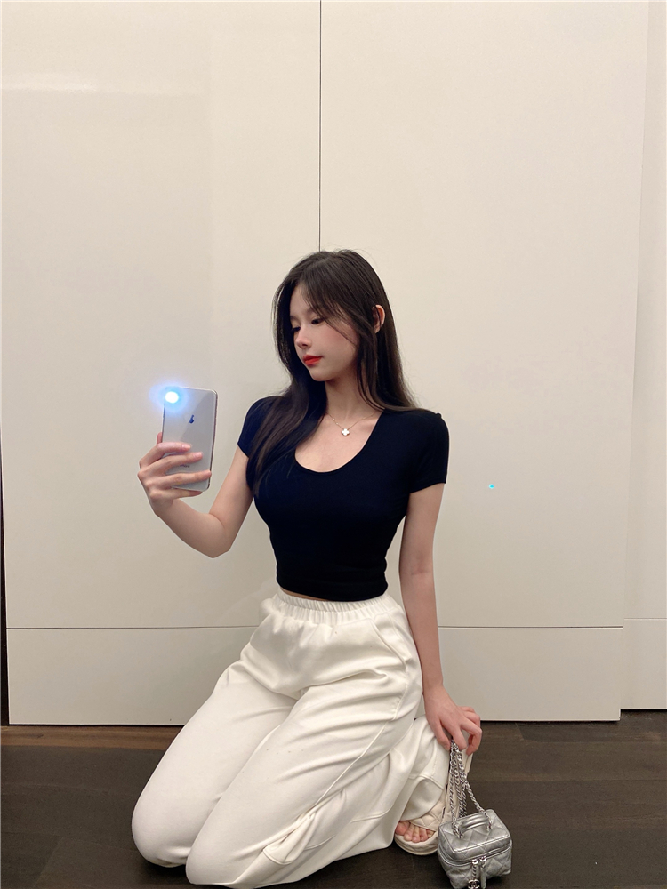 实拍 纯欲修身白色T恤女夏季低领显瘦短袖薄款上衣